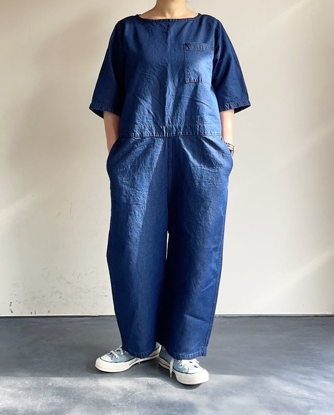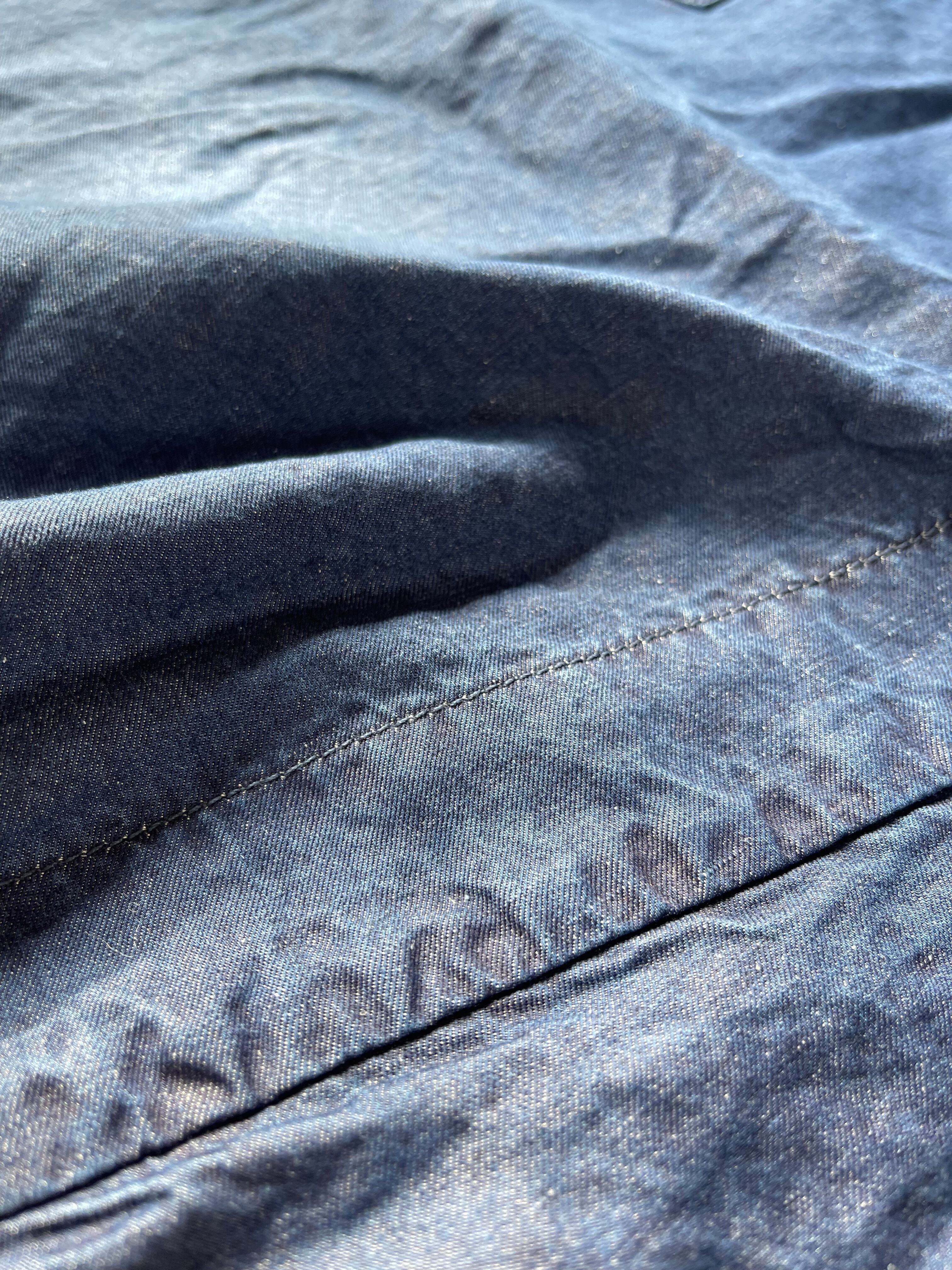 程よい光沢感のある綿麻のデニムを使用し、製品で洗いをかけることで綿麻特有のザラザラ感が落ち着き、自然な凹凸のある表情に仕上げました。