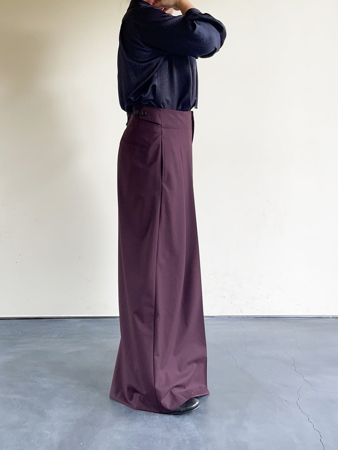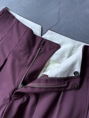 オーストリア産Super100"sバージンウールにビスコースをブレンドして先染めし、軽くしなやかで、深み奥行きのある色目の絨毛トロピカルを使用したパンツです。