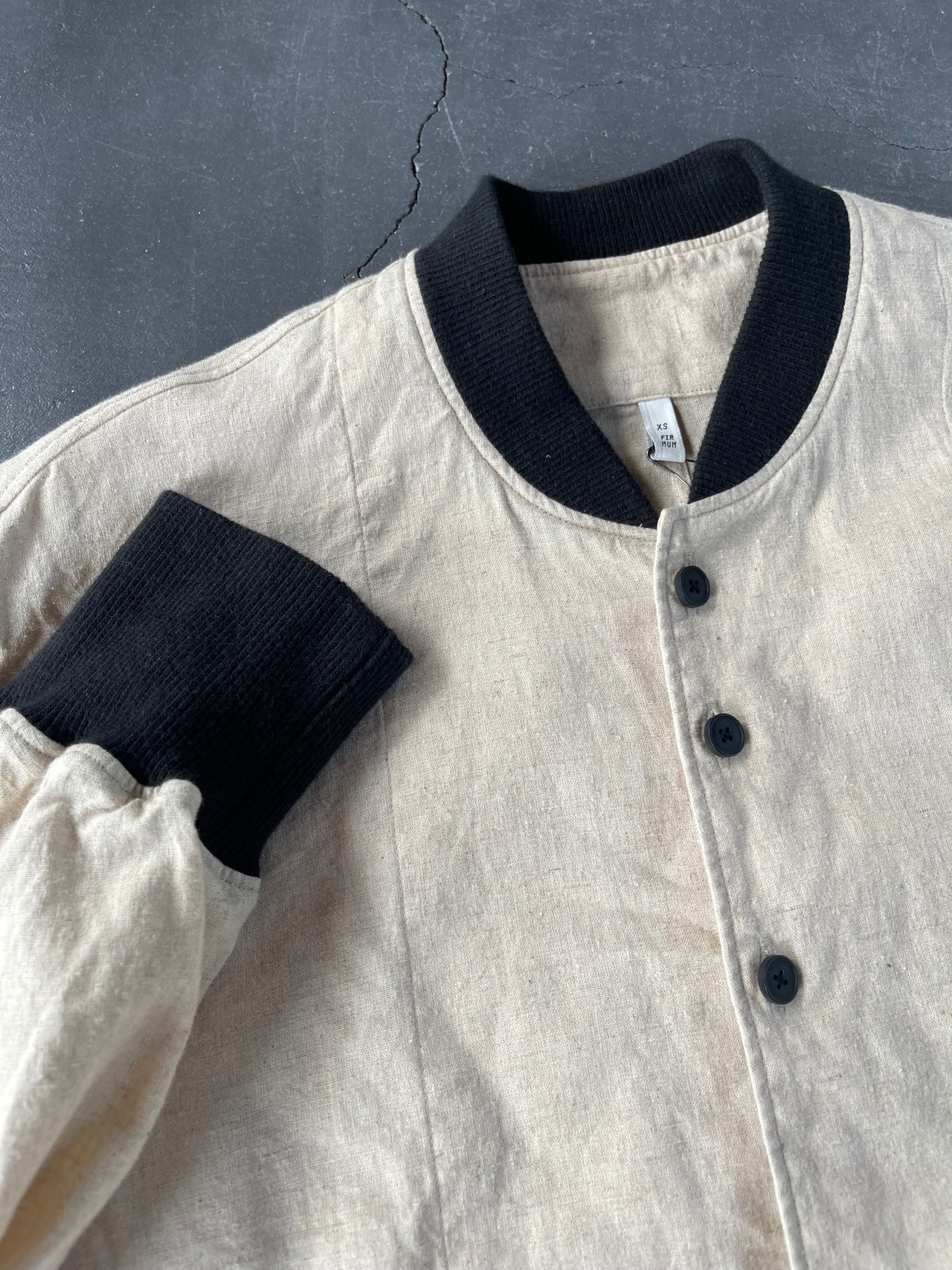 経糸・緯糸共に綿麻混紡糸を使用して織った無地の平織シーチング生地です。生地の段階で起毛加工を施し縫製後に洗いをかけてタンブラーで仕上げています。ざっくりと織られているのでゆるい感じで着用いただけると思います。