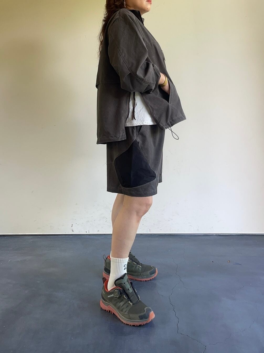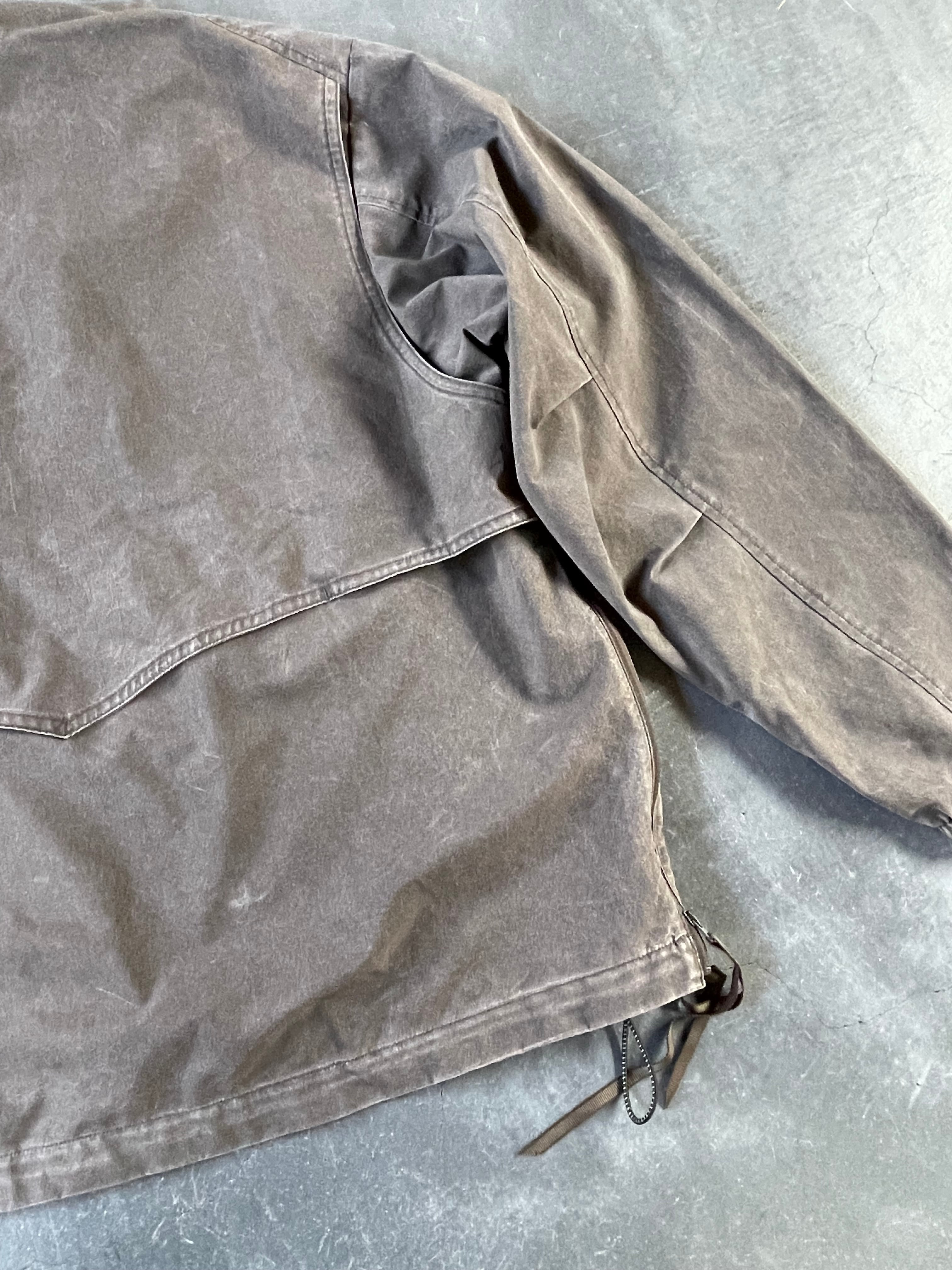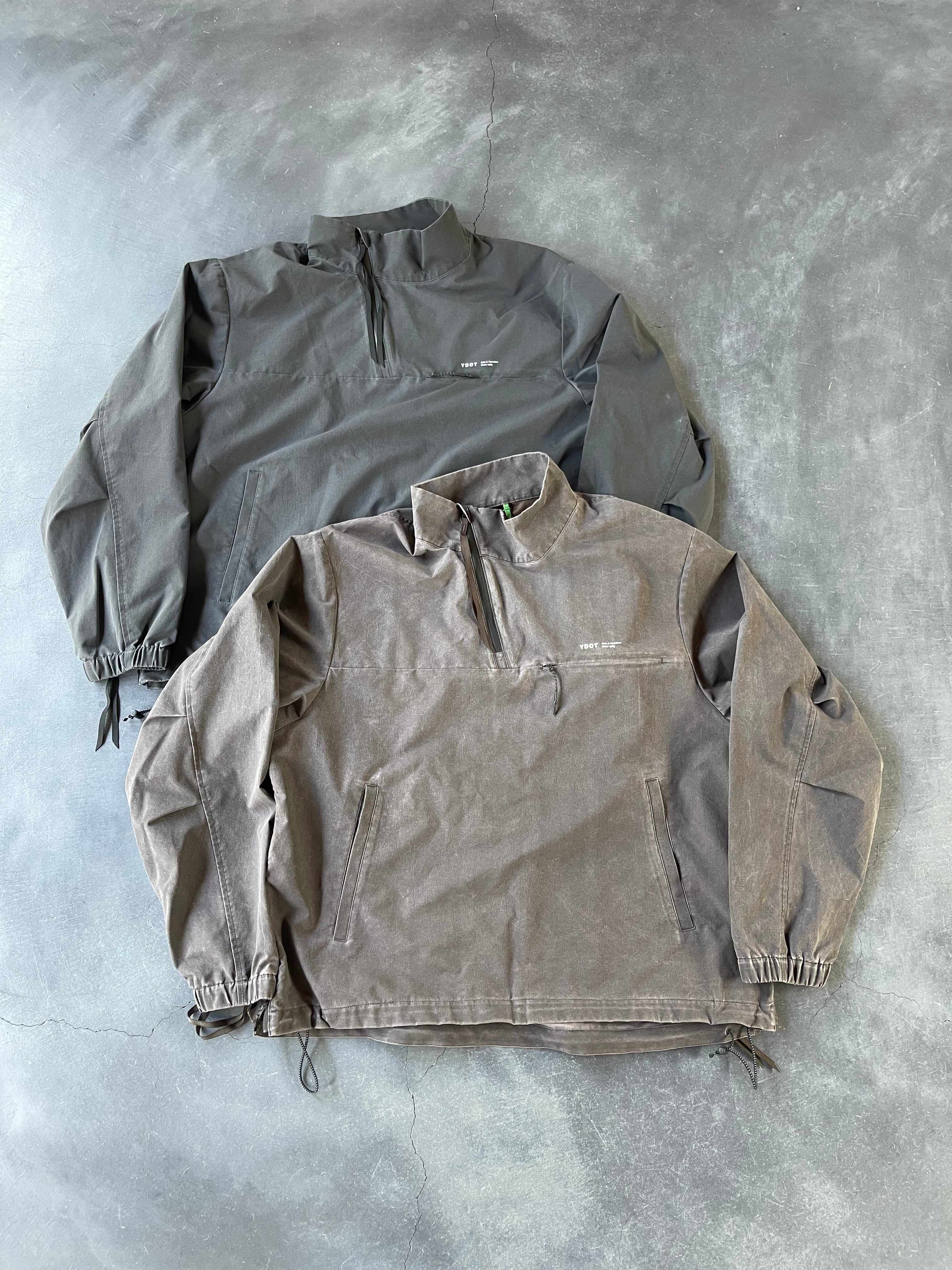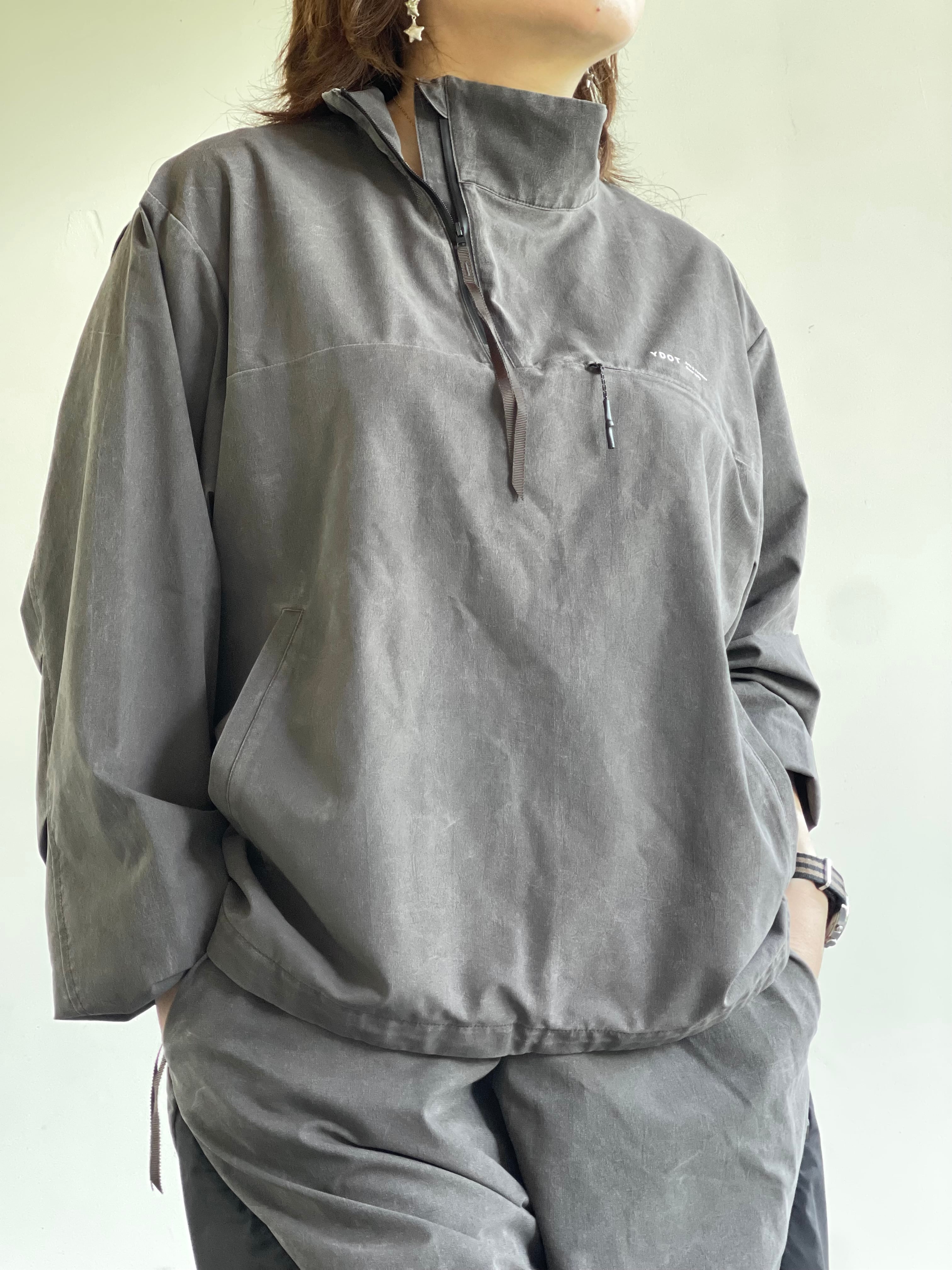 フェード感が特徴のハーフジップトラックジャケット。ゆったりとした身幅にややショート丈のシルエットです。サイドジップ仕様でスムーズに着用でき、ベンチレーションとしても機能します。シワになりすづらい特性もありシティーユースはもちろんのことレジャーなど様々なシーンで活躍する汎用性の高い1着です。裾はスピンドルで調整可能です。