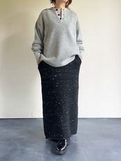 ざっくりした編地でありながら空気を含んだようなクッション性がありフリースのような温かみがあるニット。各型袖リブにサムホールが付いて手までも暖かさ風合いの良さを感じます。