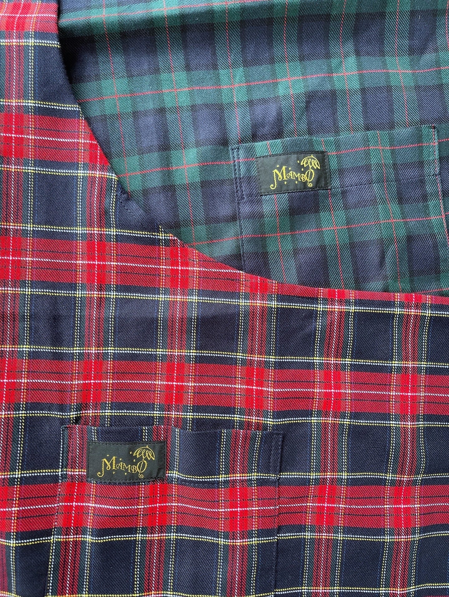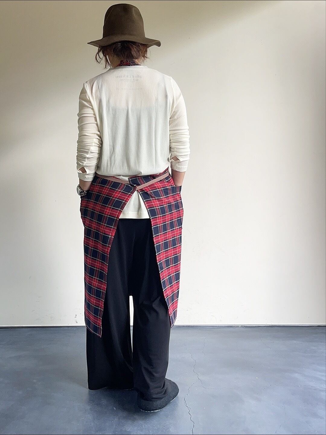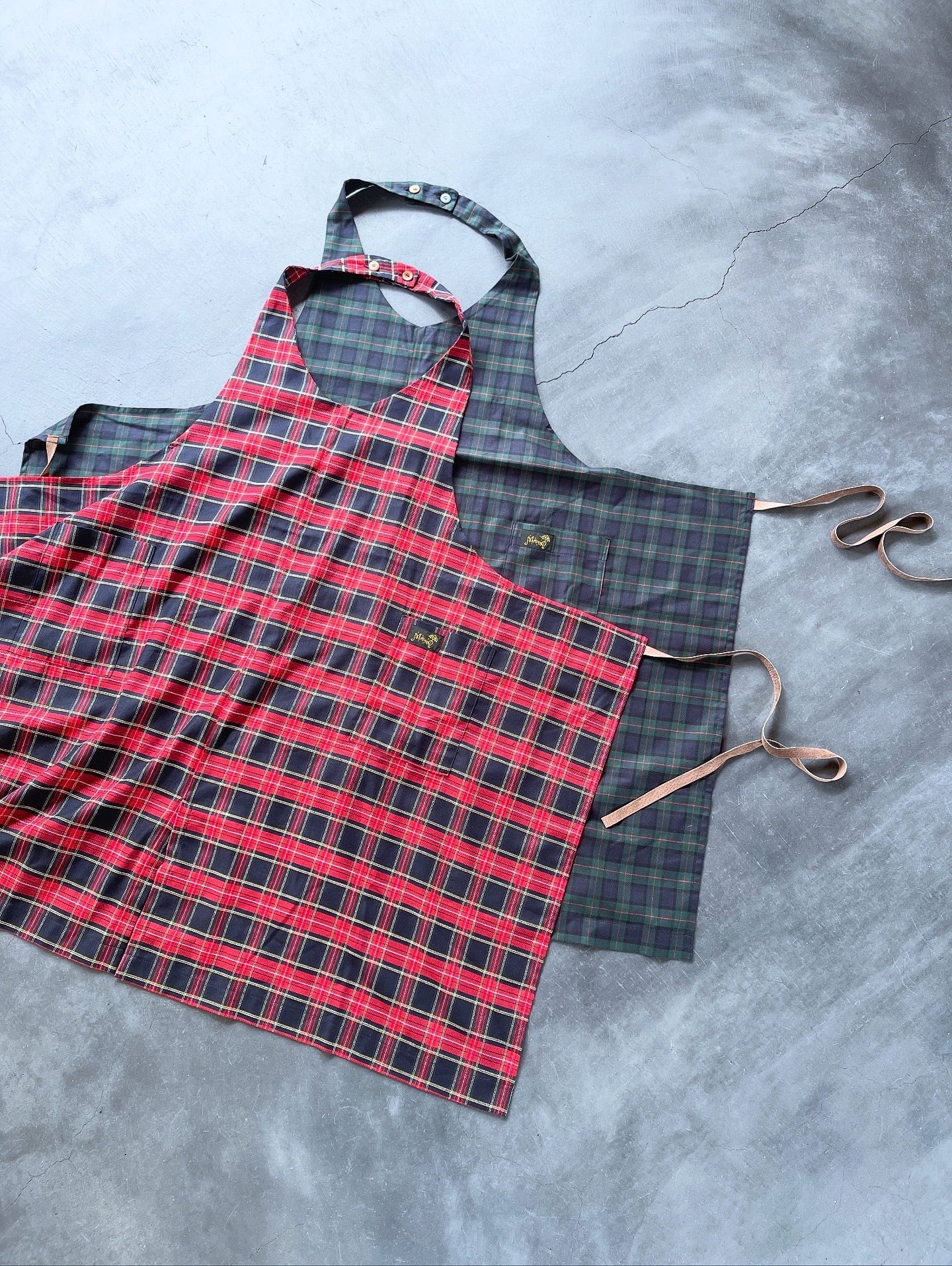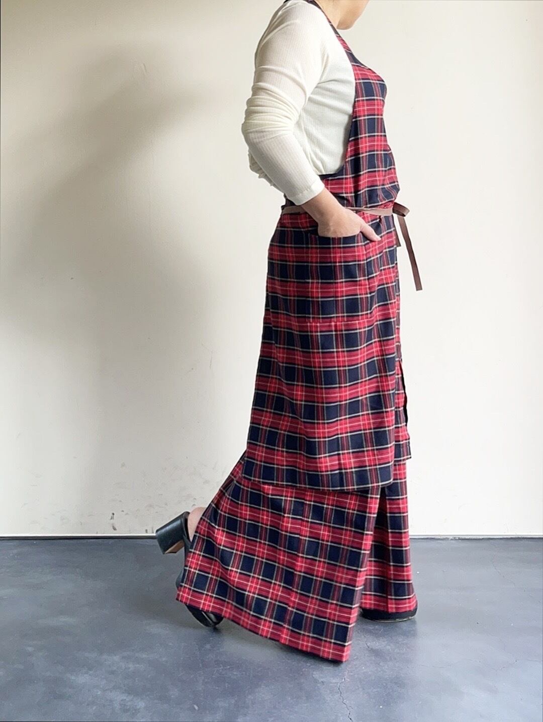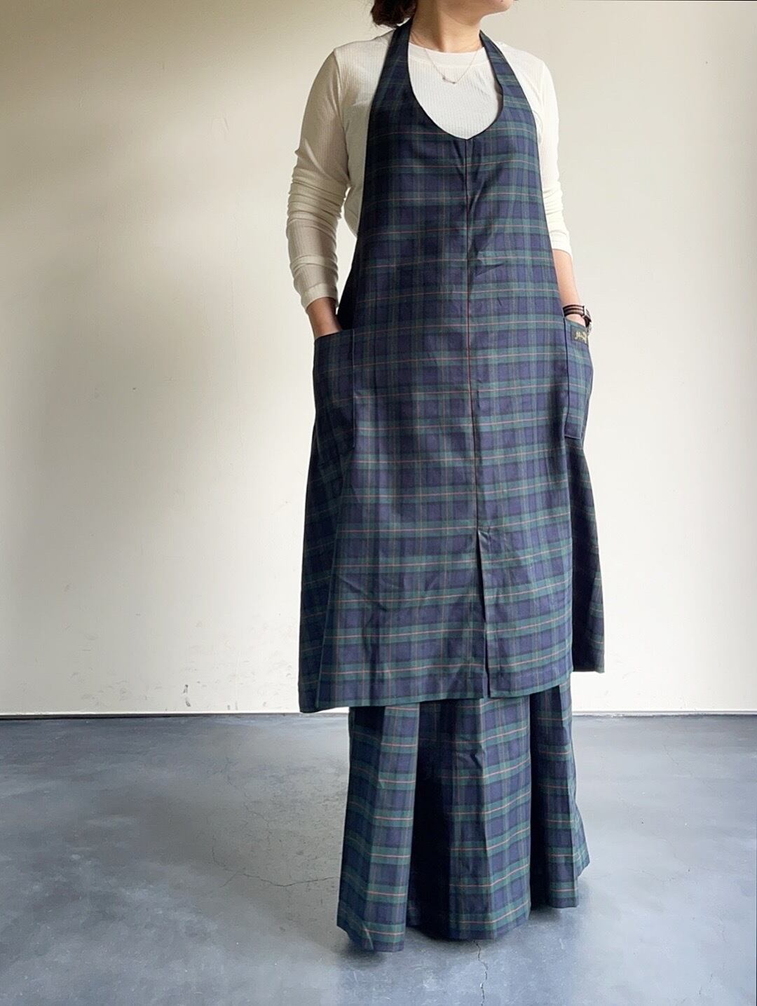 ブリティッシュの雰囲気のあるチェック生地をセレクトし、ホルダーネックタイプのエプロンと、ギャルソンエプロンをイメージしたロングスカートのセットアップとなります。