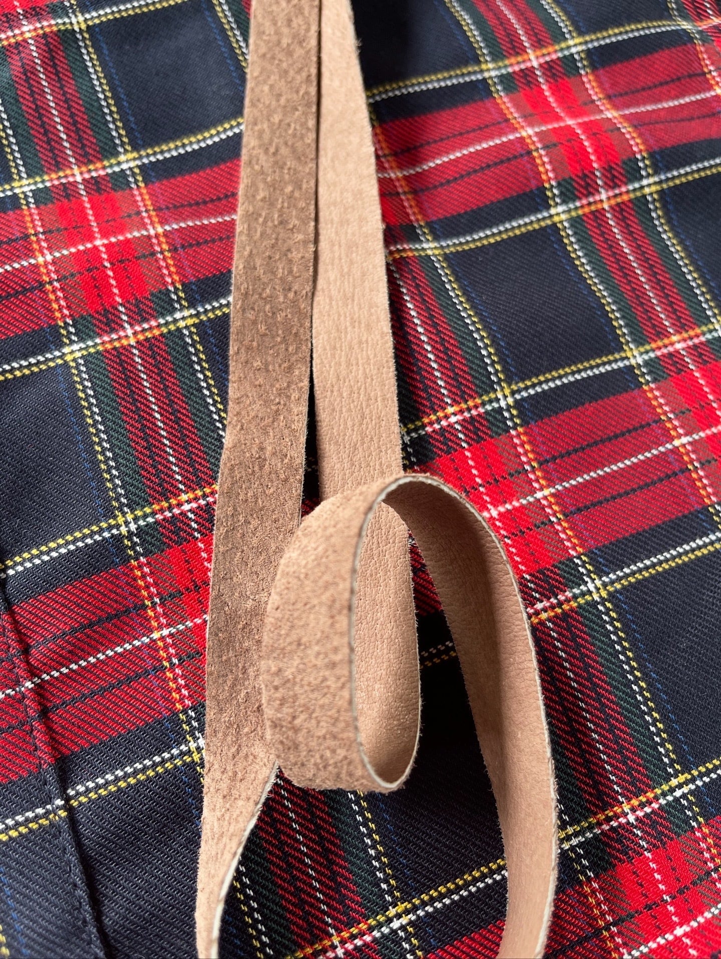 ネックのボタンには、作家さんが長年集めてこられた色とりどりのボタンをアソートで2個付けて頂きました。ボタンホールは3個あり、長さ調節可能です。