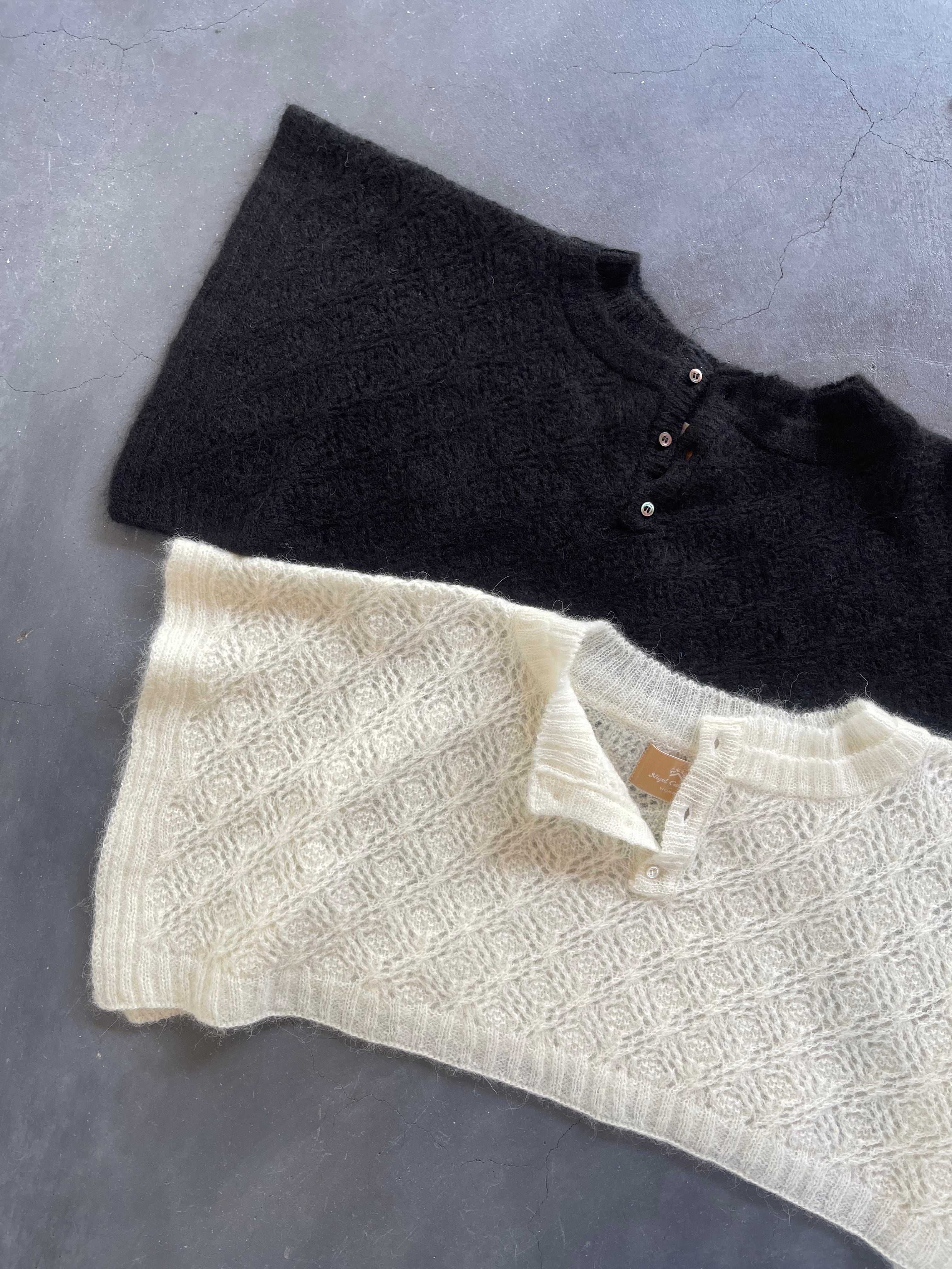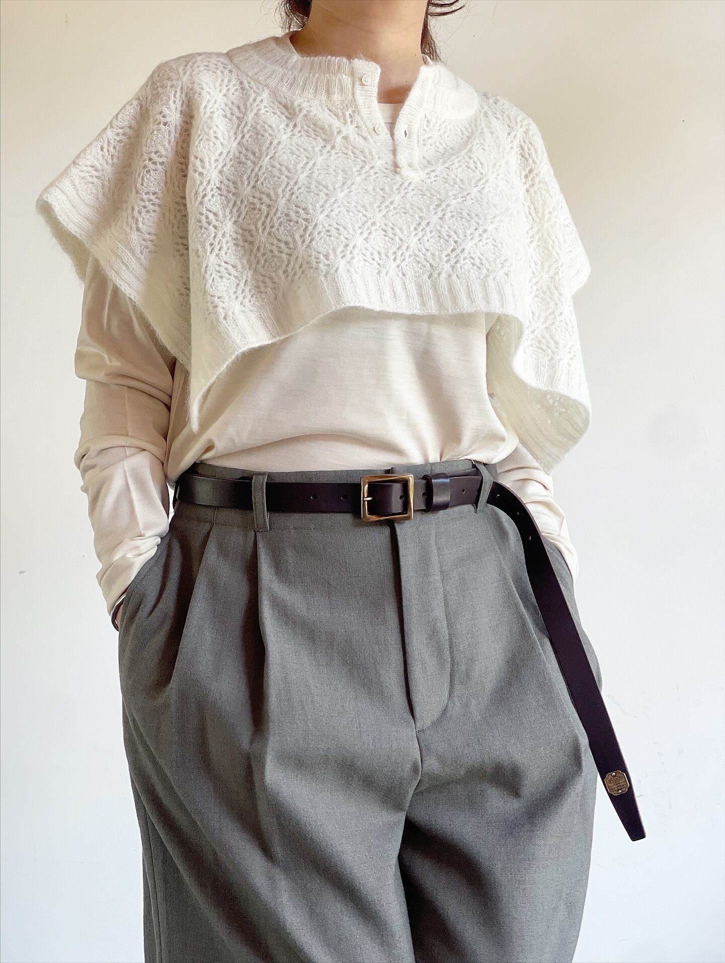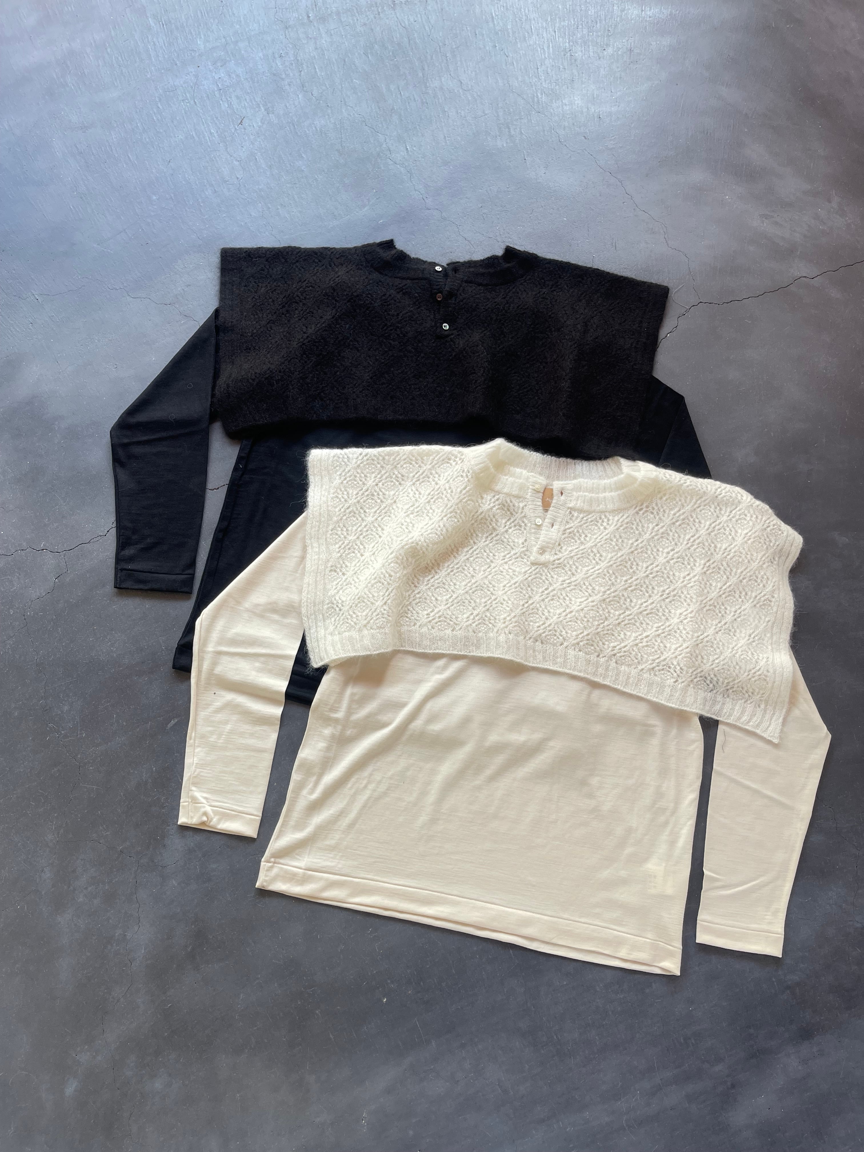 イギリスの歴史あるレースの柄をアルパカウールで表現したケープに、上質なウール天竺のロングスリーブTシャツを組み合わせたセットアイテム。
