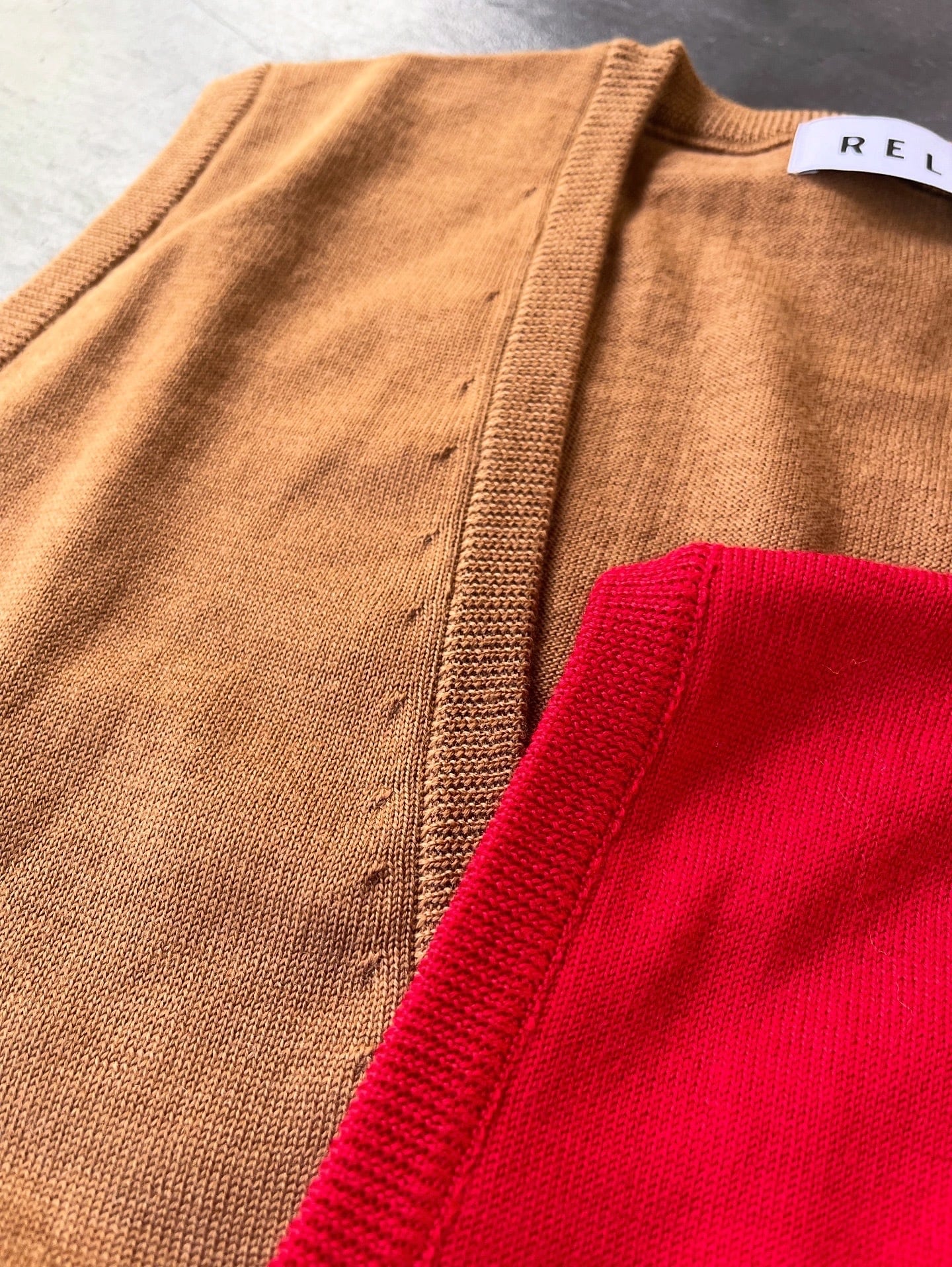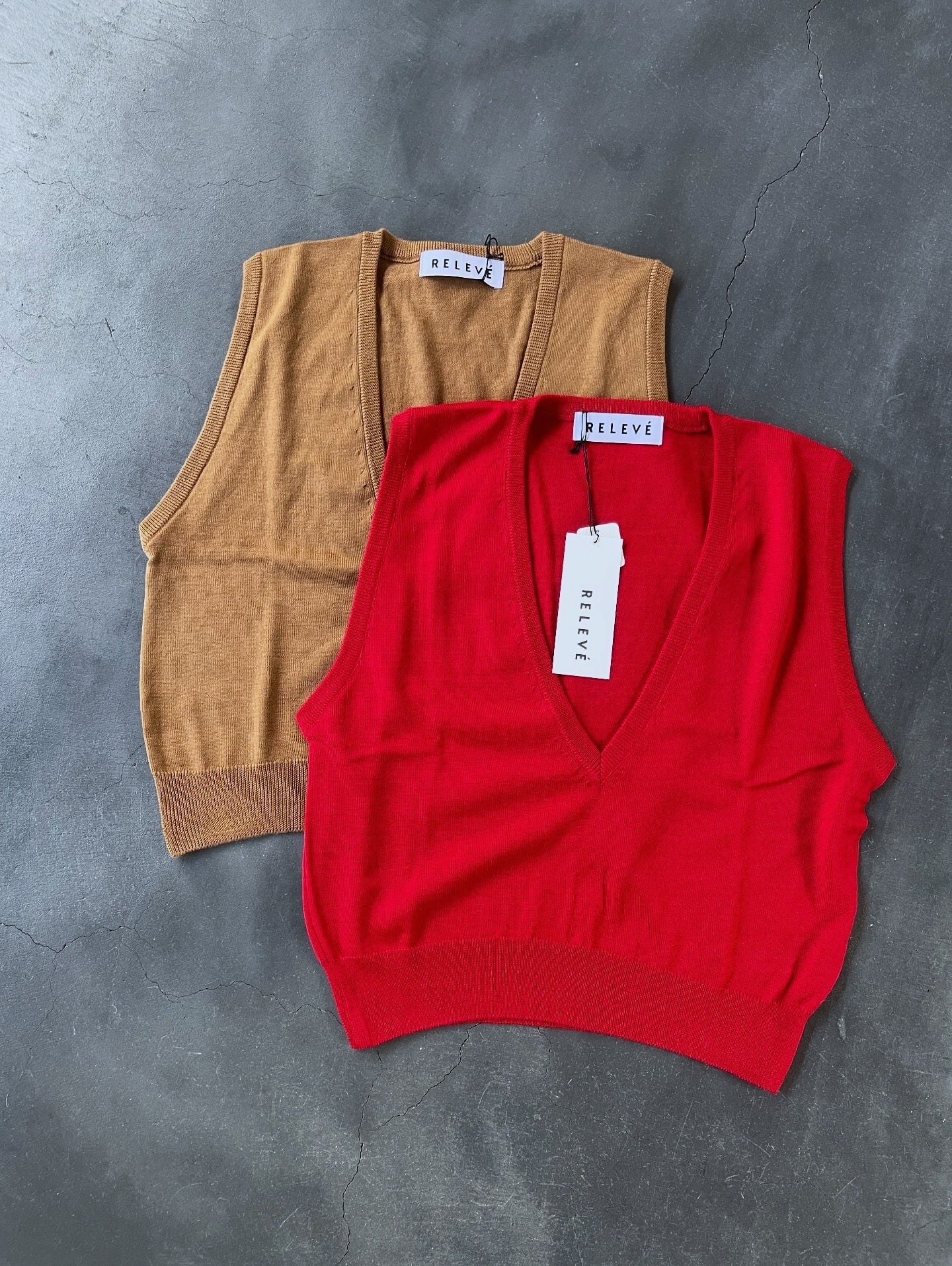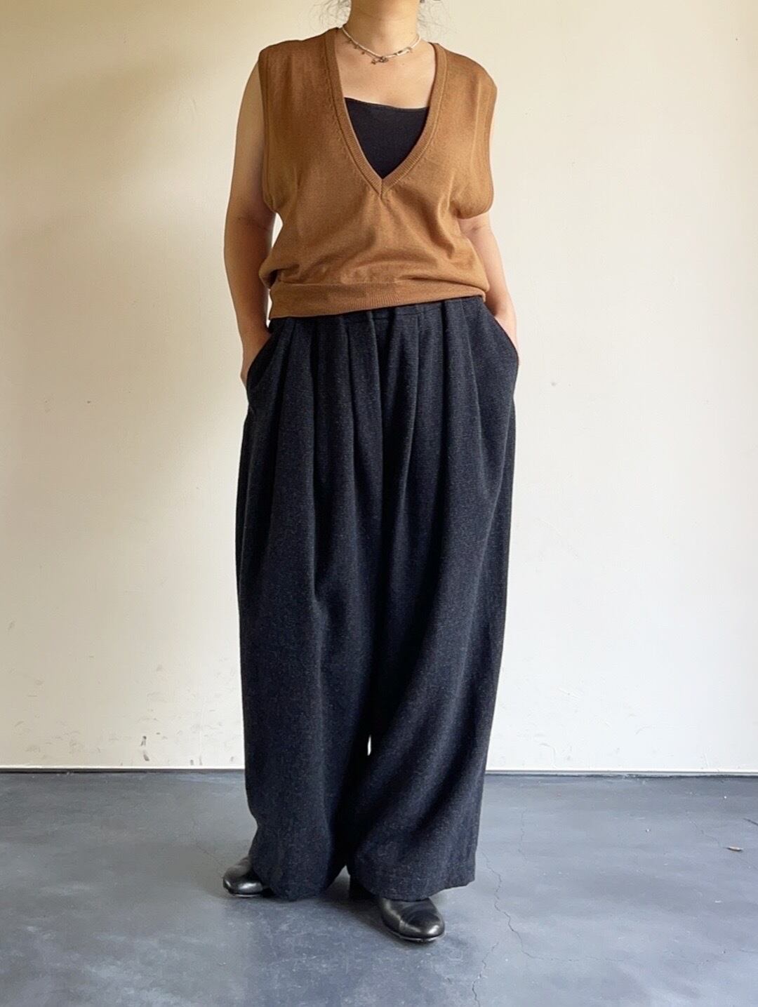 深いVネックのリラクシーな印象に仕上げたニットベスト。やや短めのレングスと大きなアームホール、ゆったりとしたサイズ感で様々なレイヤードを楽しんで頂けます。ファインゲージの天竺でミニマムに仕上げ、艶のある梳毛ウールを際立たせています。