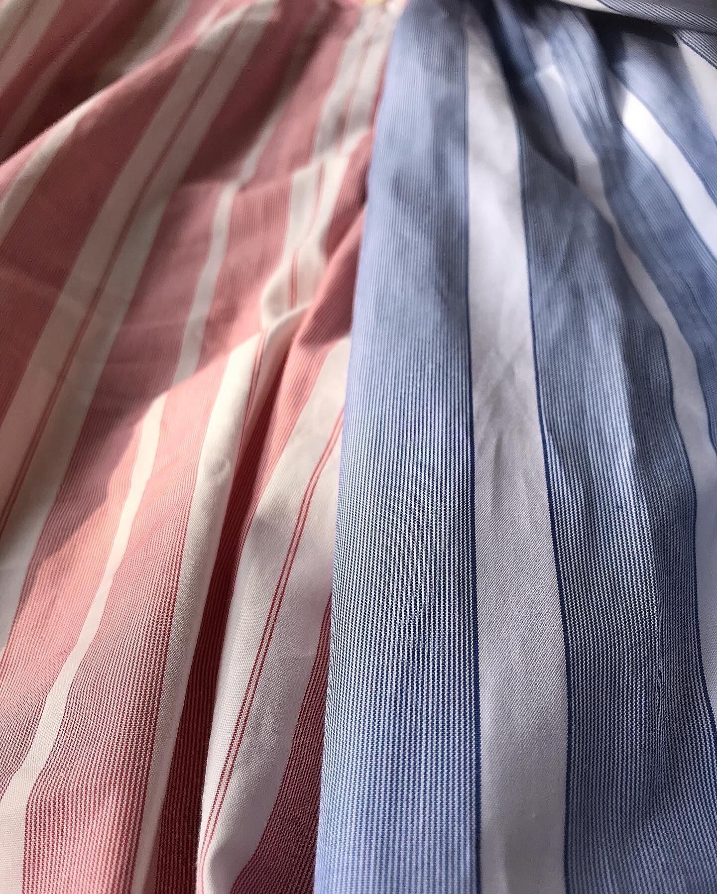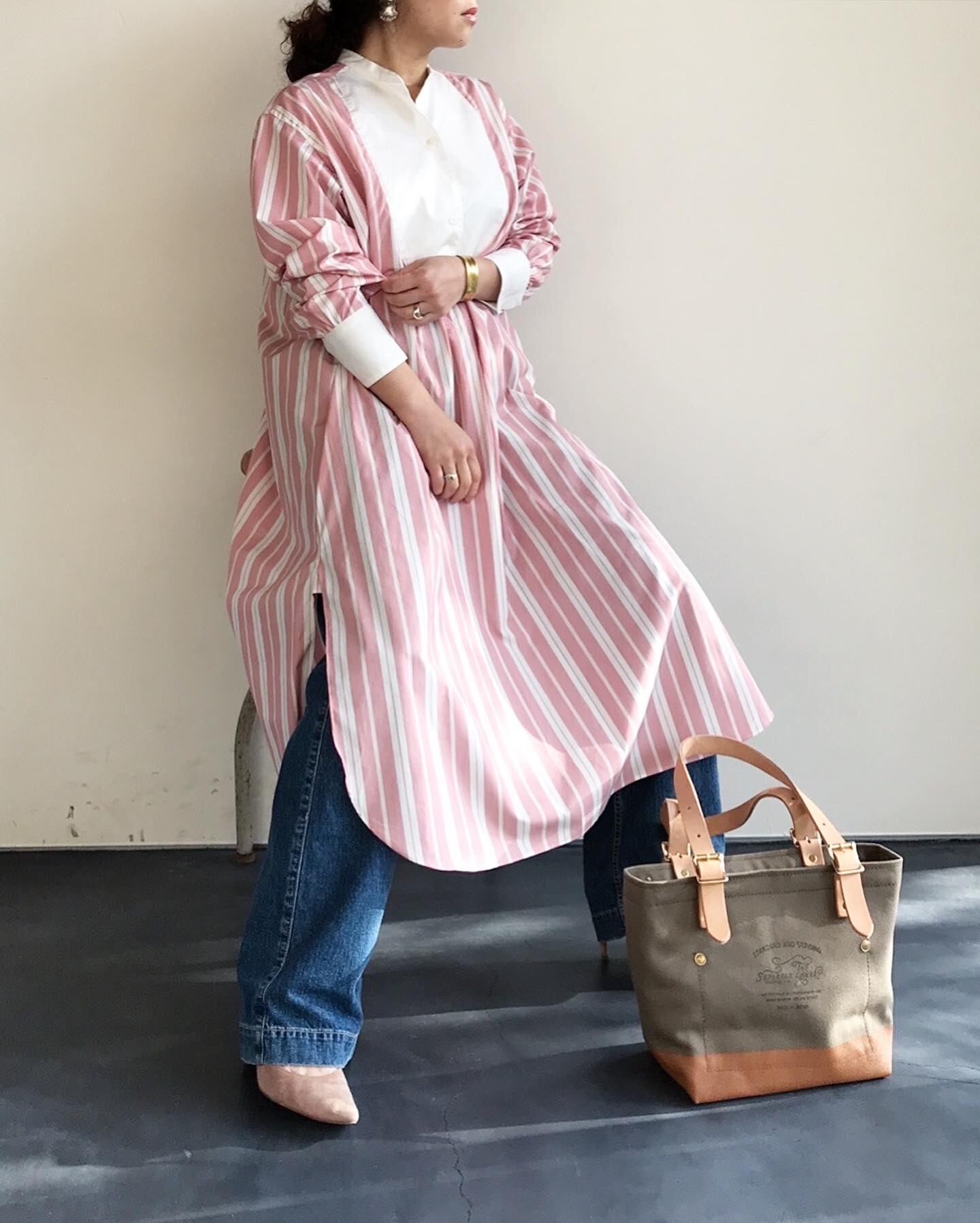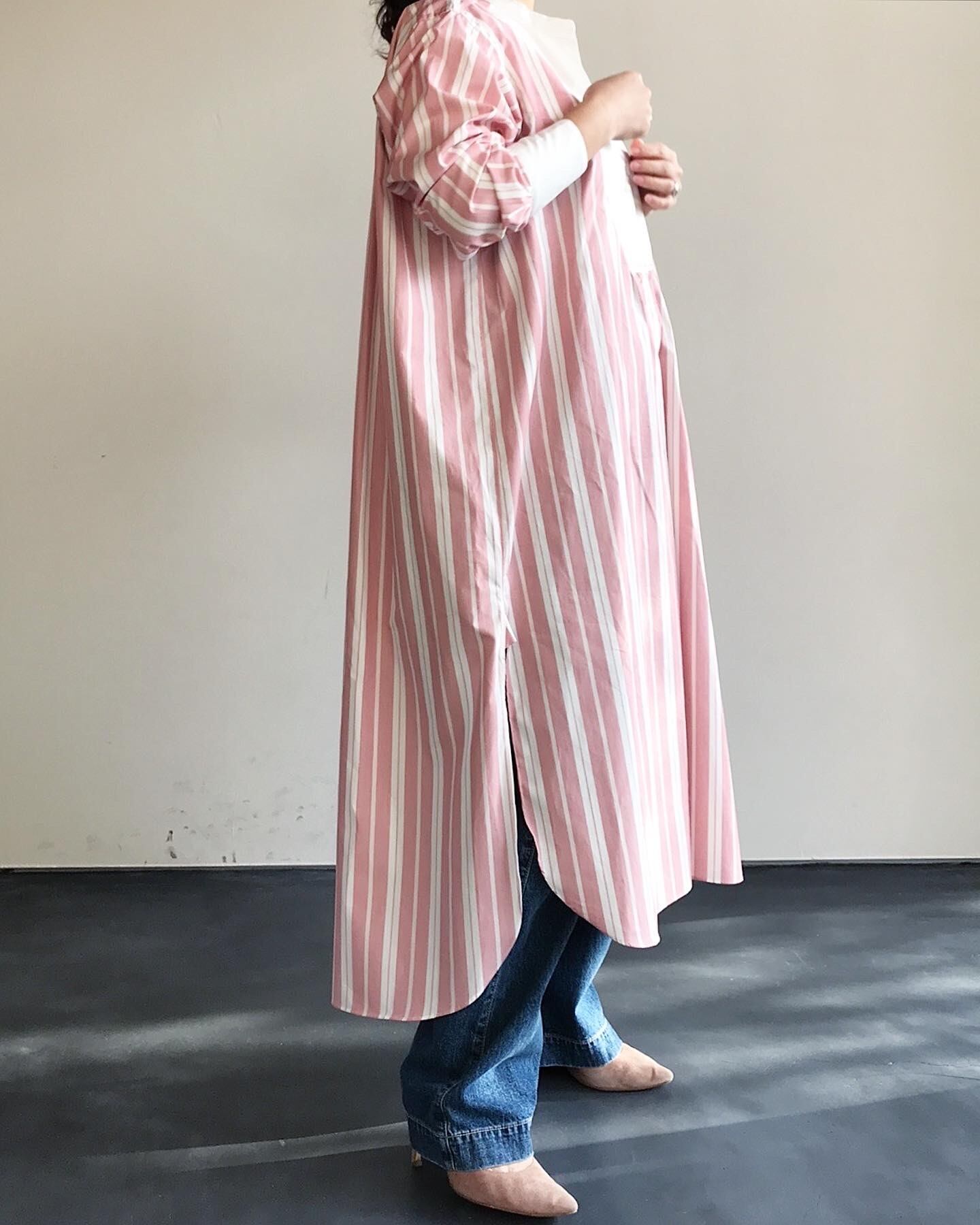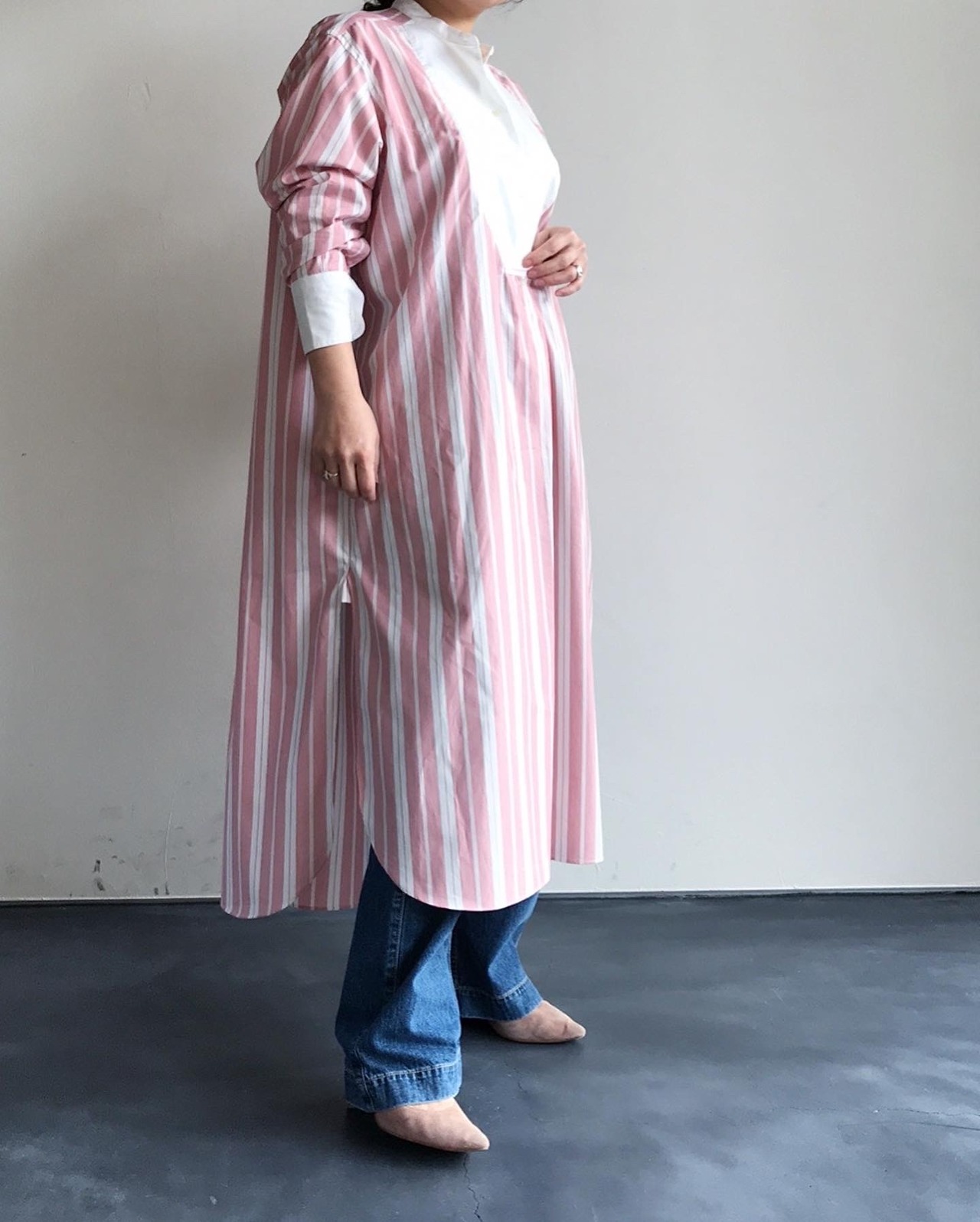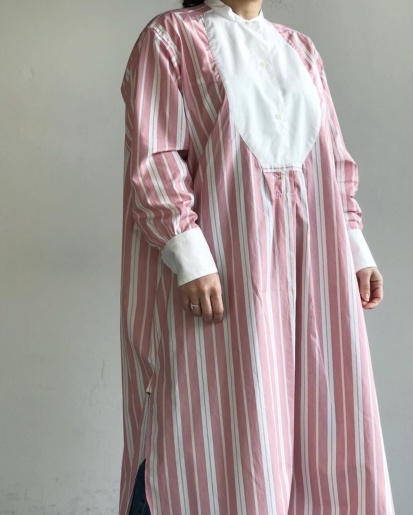 ヴィンテージのドレスシャツから着想を得てアレンジされたワンピース。身頃にはストライプ、襟と袖口に白無地を用いたクレリックシャツ仕立てで、とても品のある雰囲気です。ポプリン素材のきちんと感もあり、