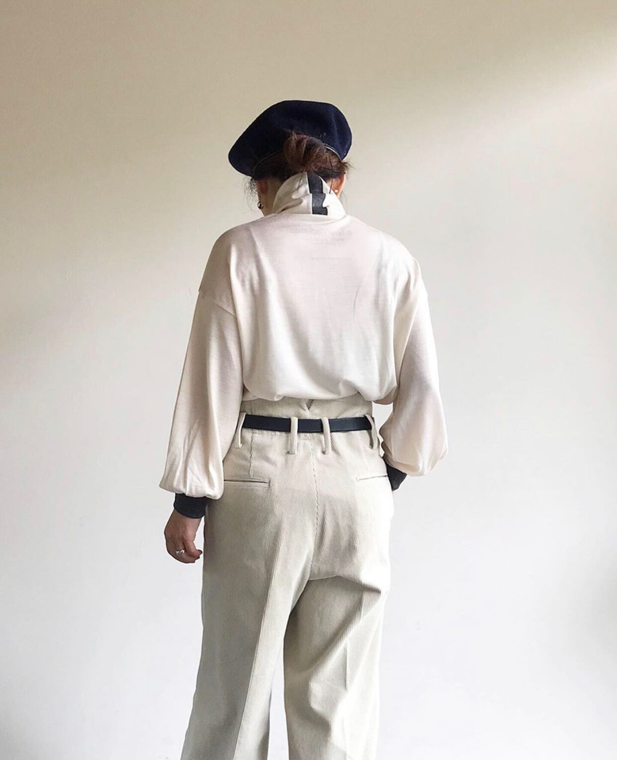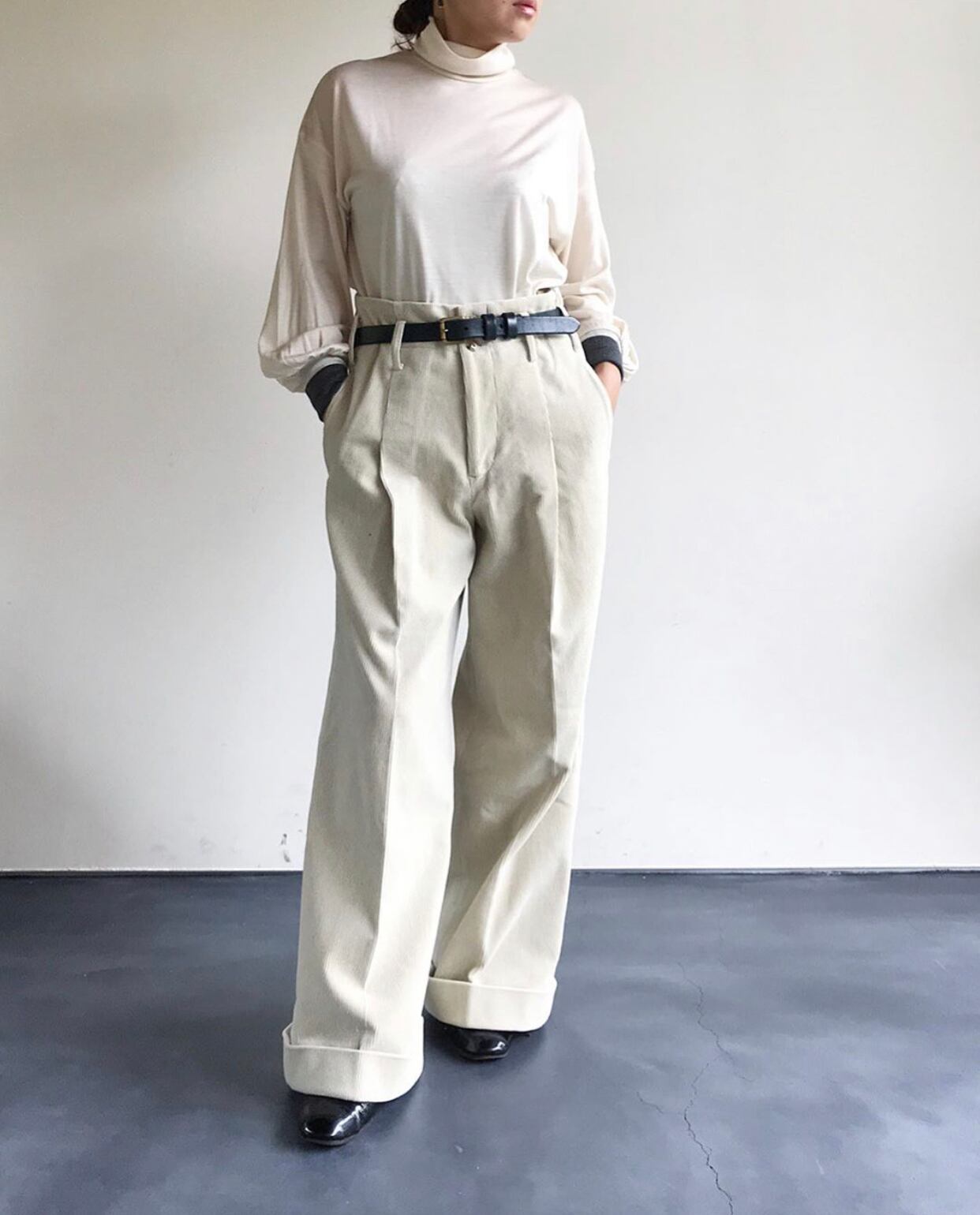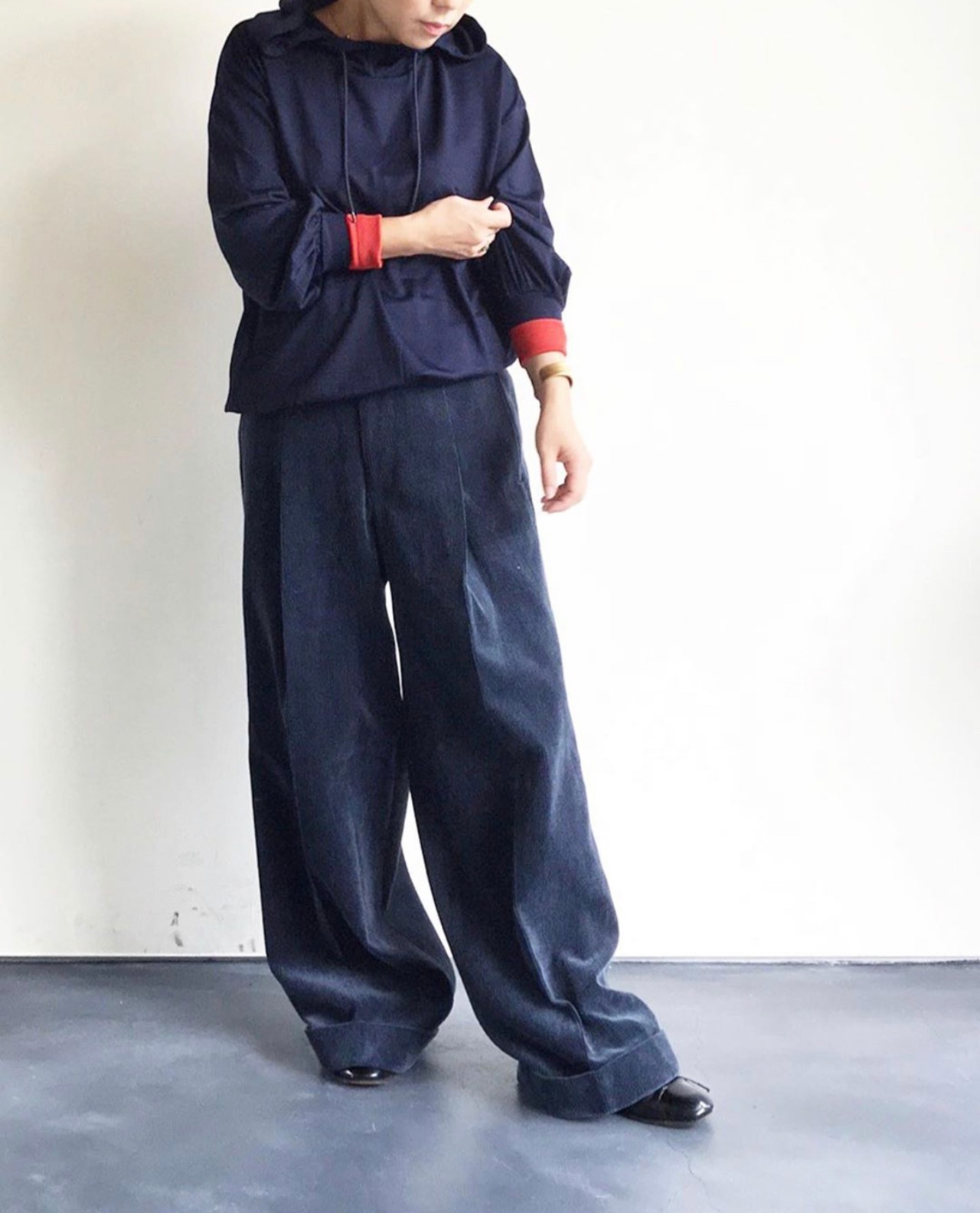 腰回りはすっきりですが、お尻まわりもも周りはワイドなシルエットでスタイル良く見せてくれるパンツです。