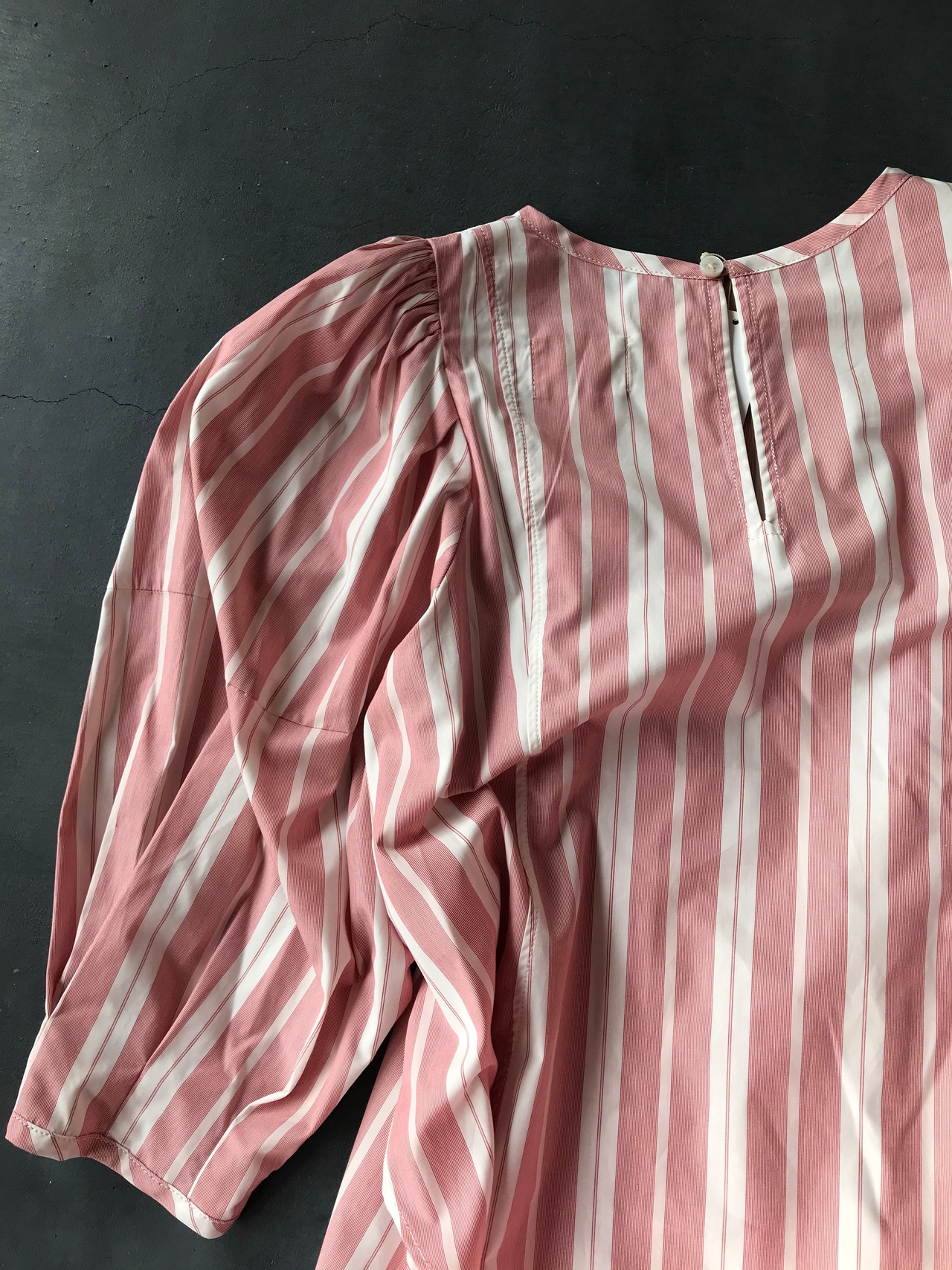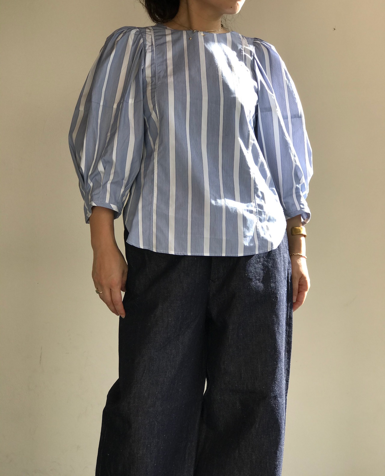大胆なパフスリーブやサイドのボタンがアクセント。