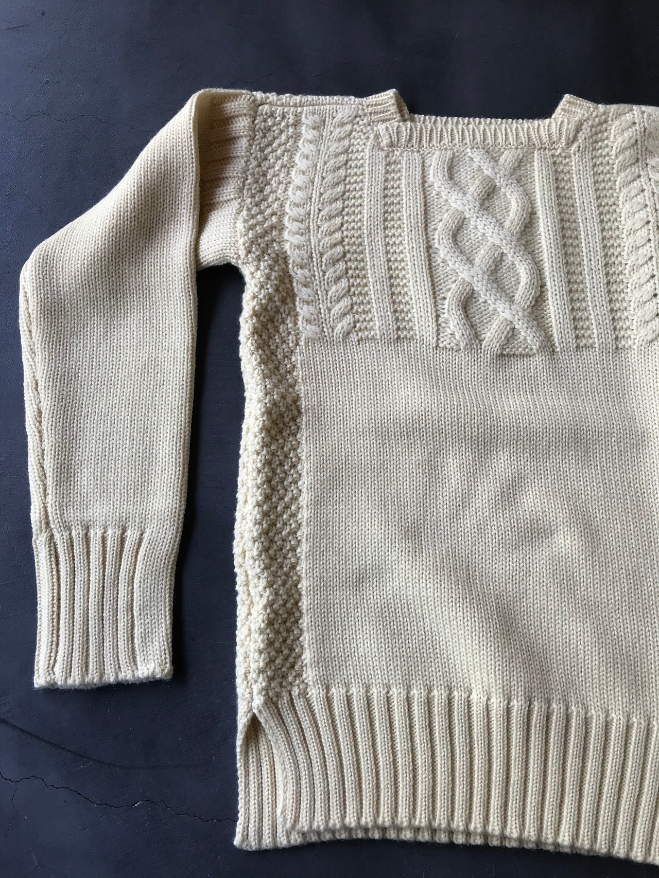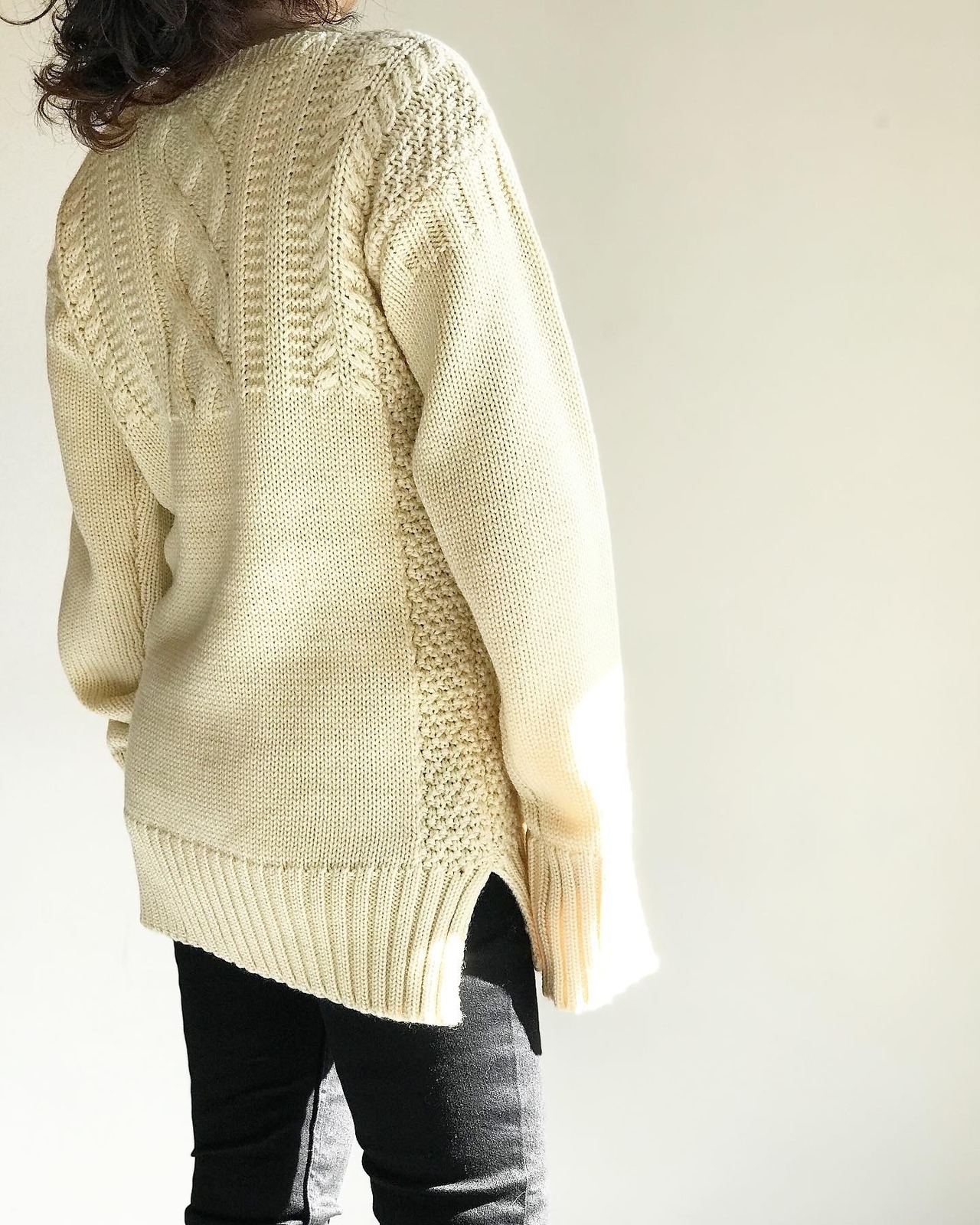 ガンジーセーターを参考にケーブルをアレンジしたデザインのセーターです。