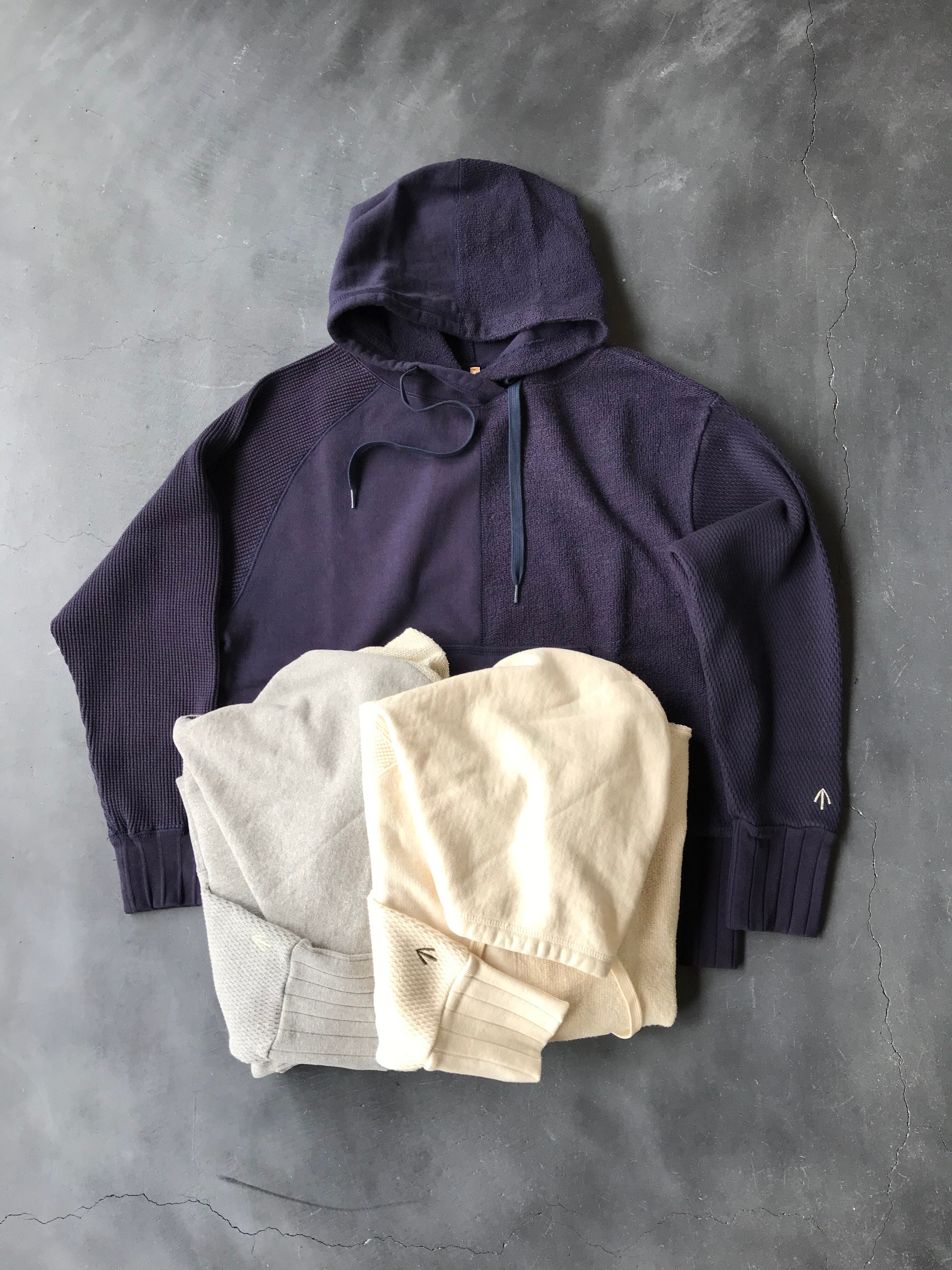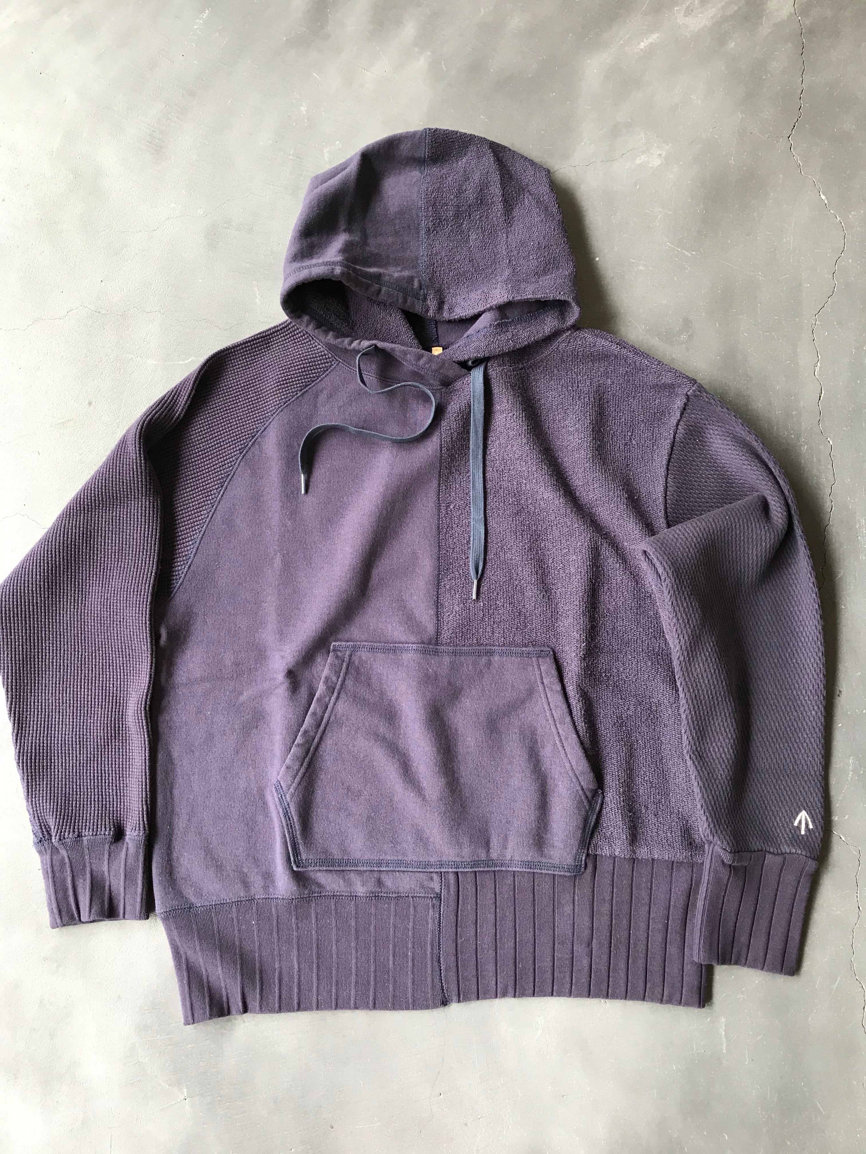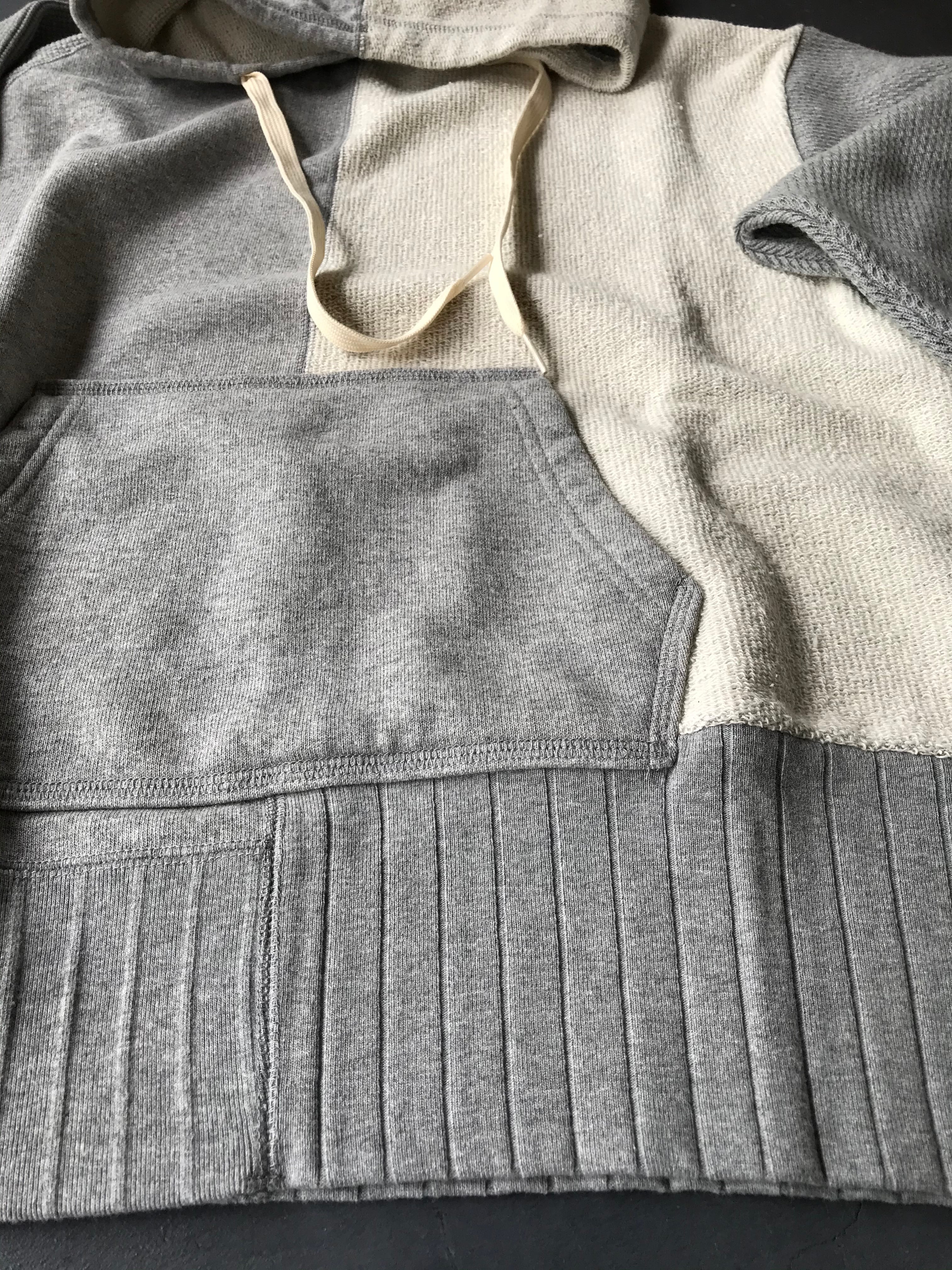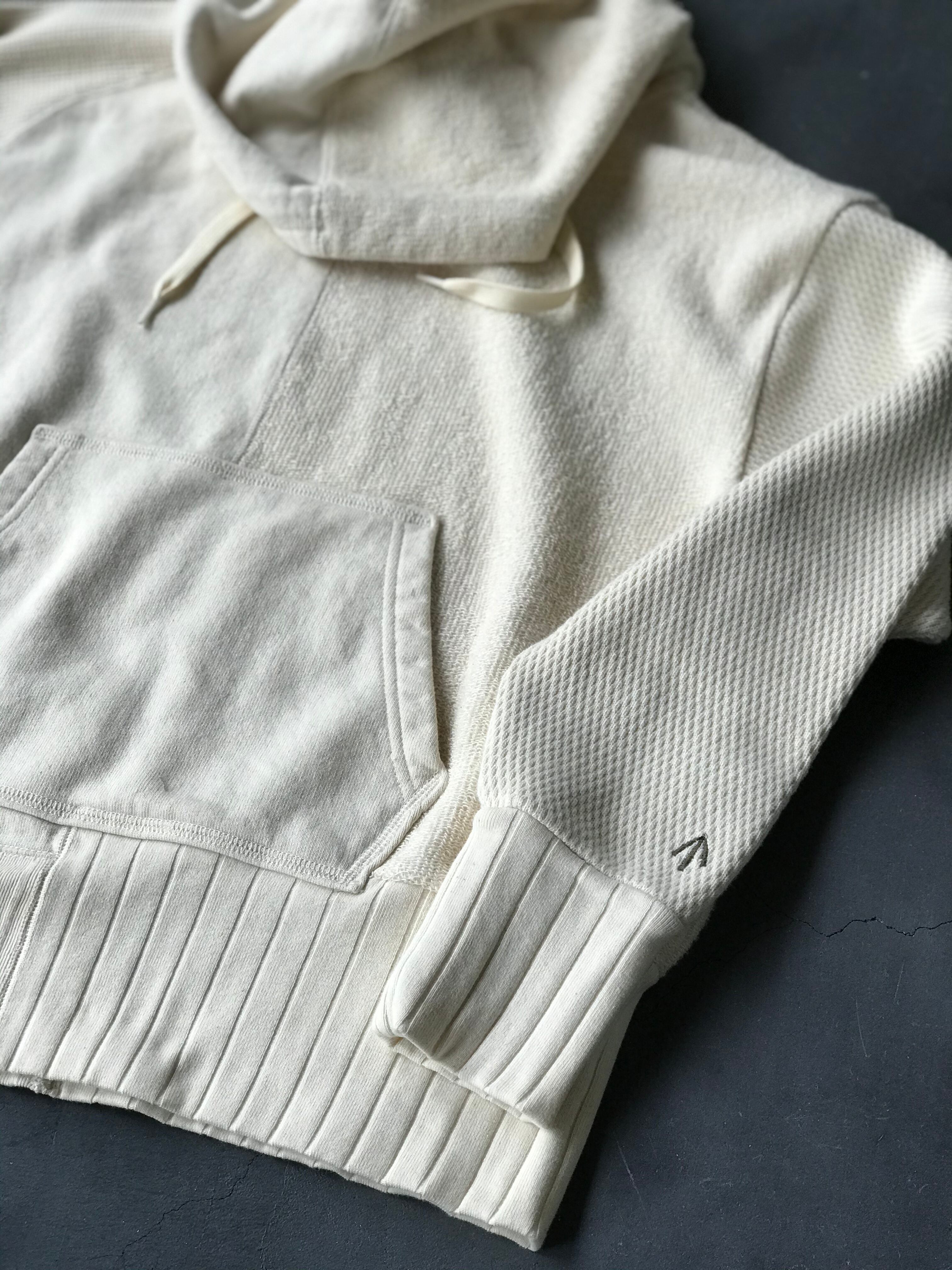 英国軍のトレーニングウェアがベースのアシンメトリーなデザインのパーカーです。 右身頃が1930年代、左身頃が1940年のディテールを再現しています。異なった時代の異なった使用をアレンジし、身頃が中央で大胆に繋ぎ合わせています。 デザインはもちろん、左右それぞれの年代に合わせて使用するミシンも変更しました。 1930年代のものを元にした右身頃には、フラットシーマという生地の重なりを極力少なくパーツを繋ぎ合わせるミシンを、1940年代の左身頃にはロックミシンを使用しています。