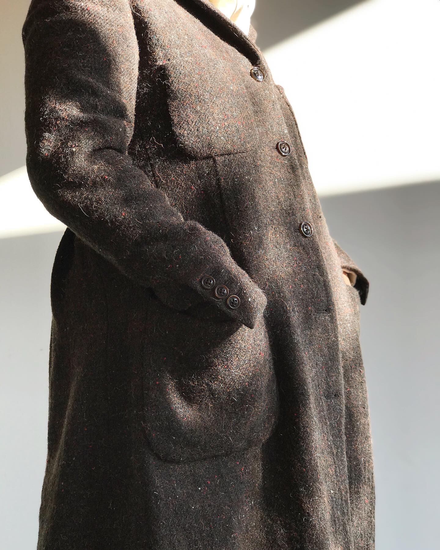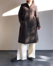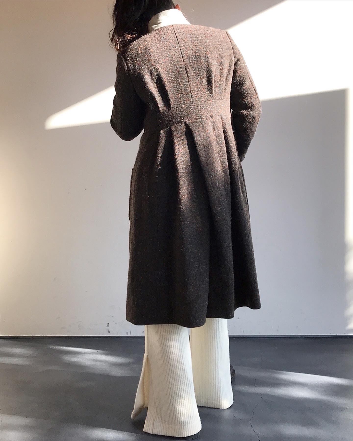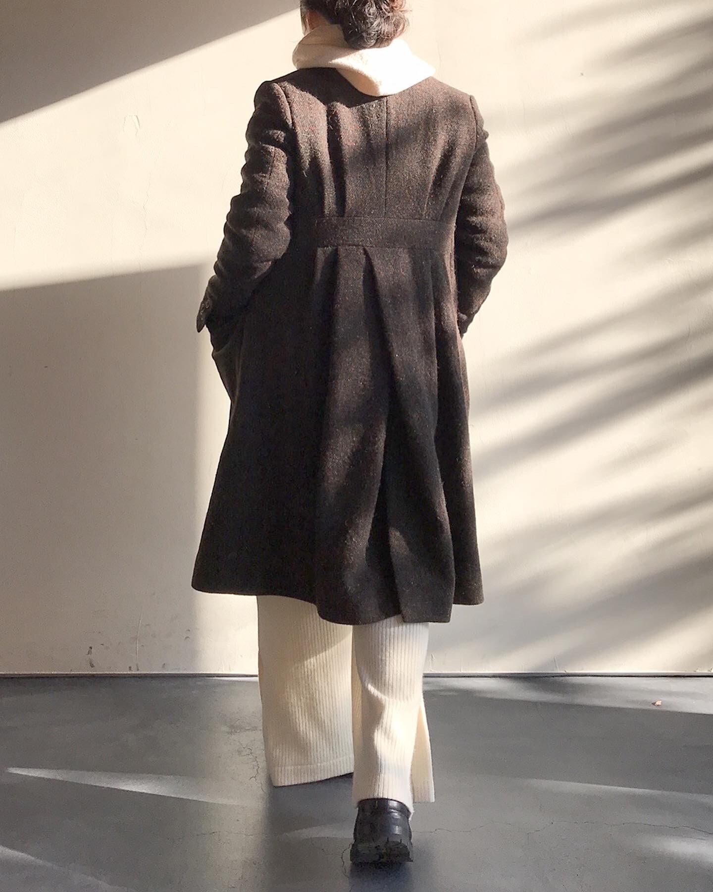 伝統的なチェスターコートの後ろ見頃に、ヴィンテージドレスのデザインをミックスした女性らしいコートです。