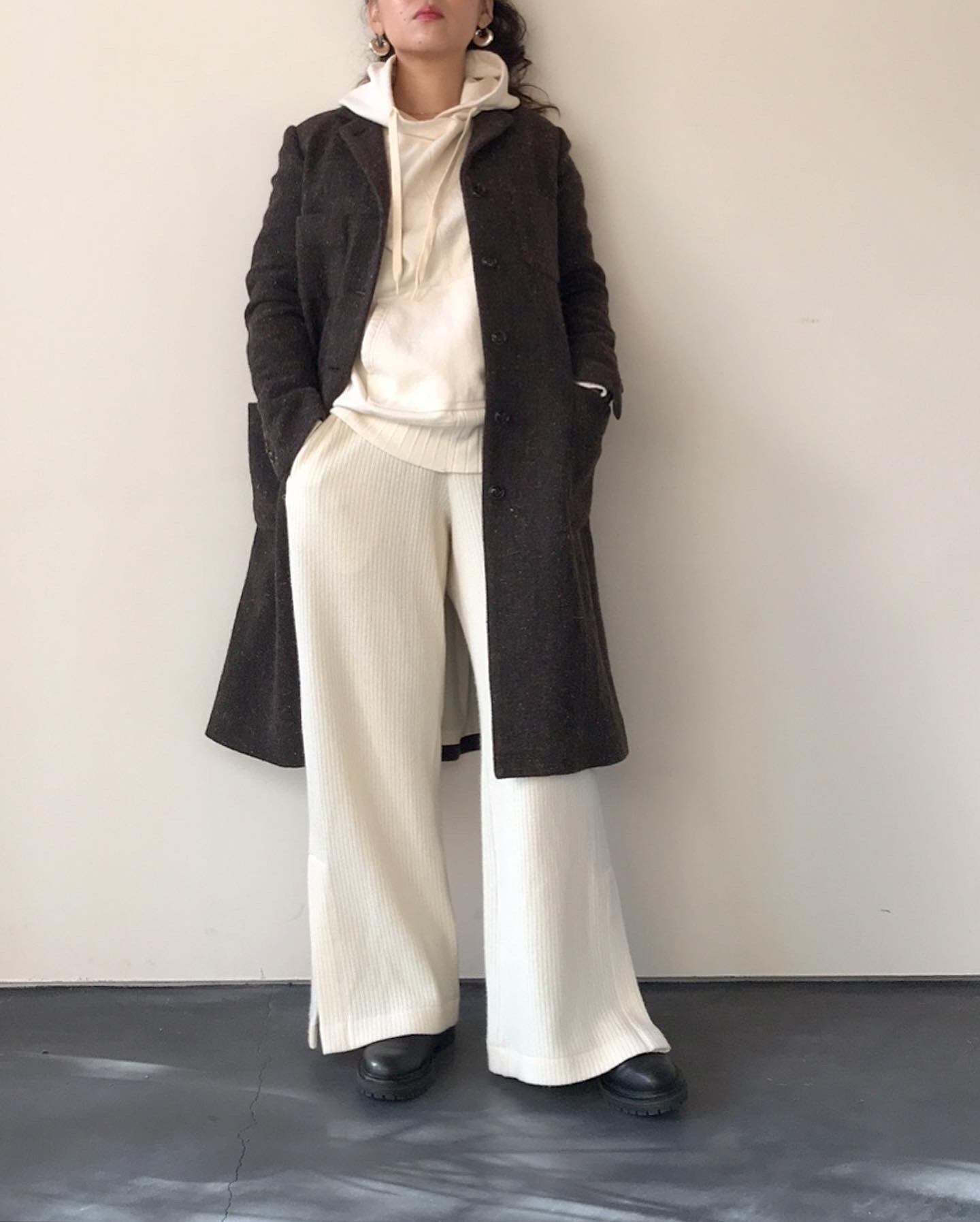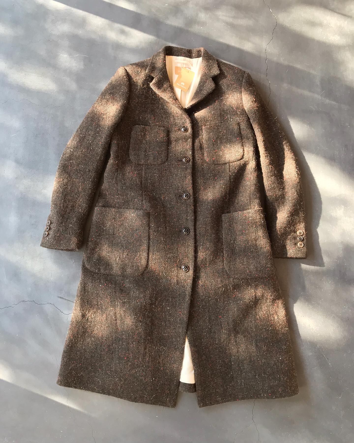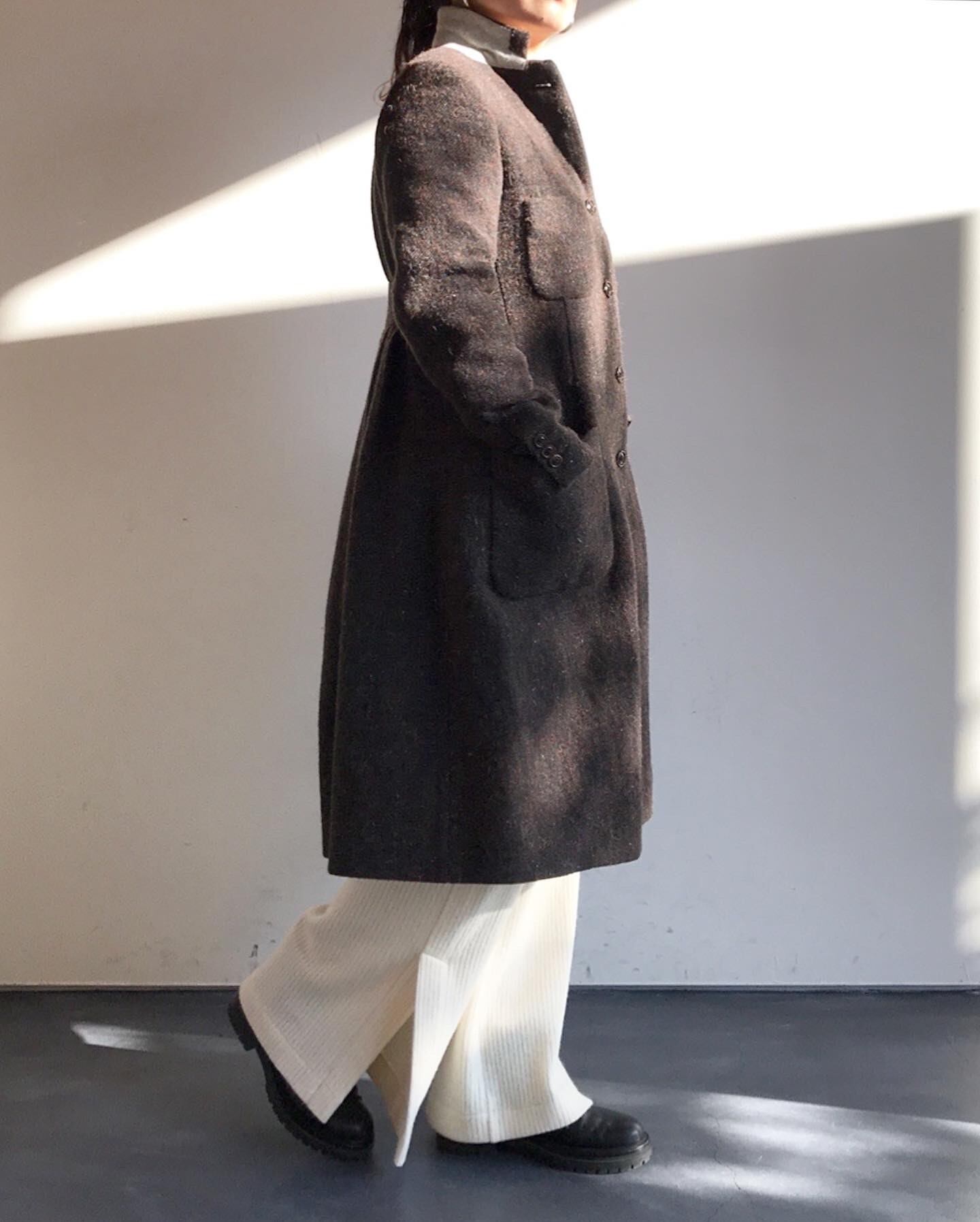 伝統的なチェスターコートの後ろ見頃に、ヴィンテージドレスのデザインをミックスした女性らしいコートです。