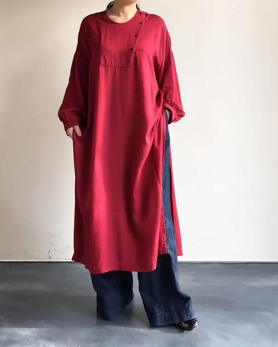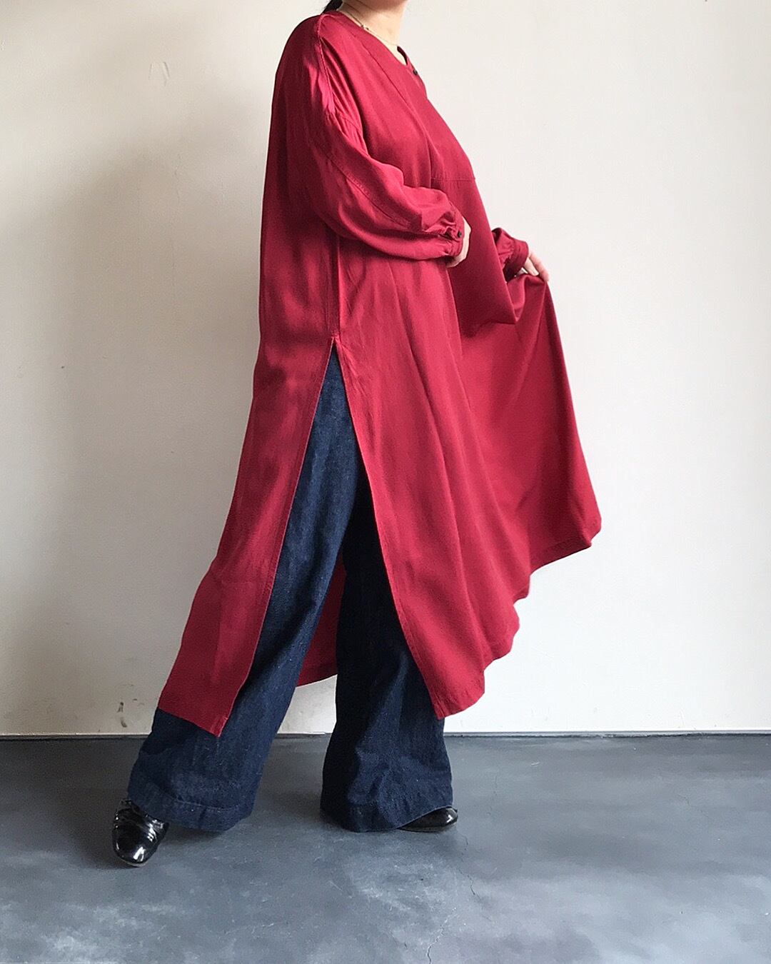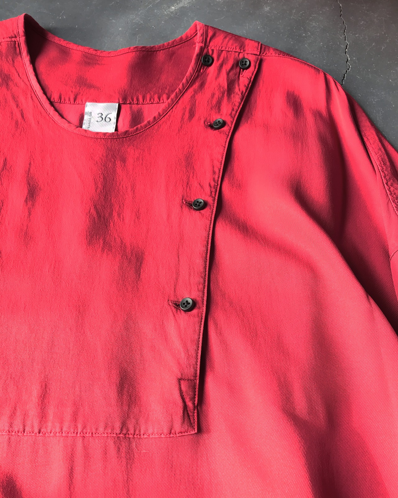 キュプラとレーヨンをミックスしたカルゼ織りの生地を製品染めしているロングプルオーバー。