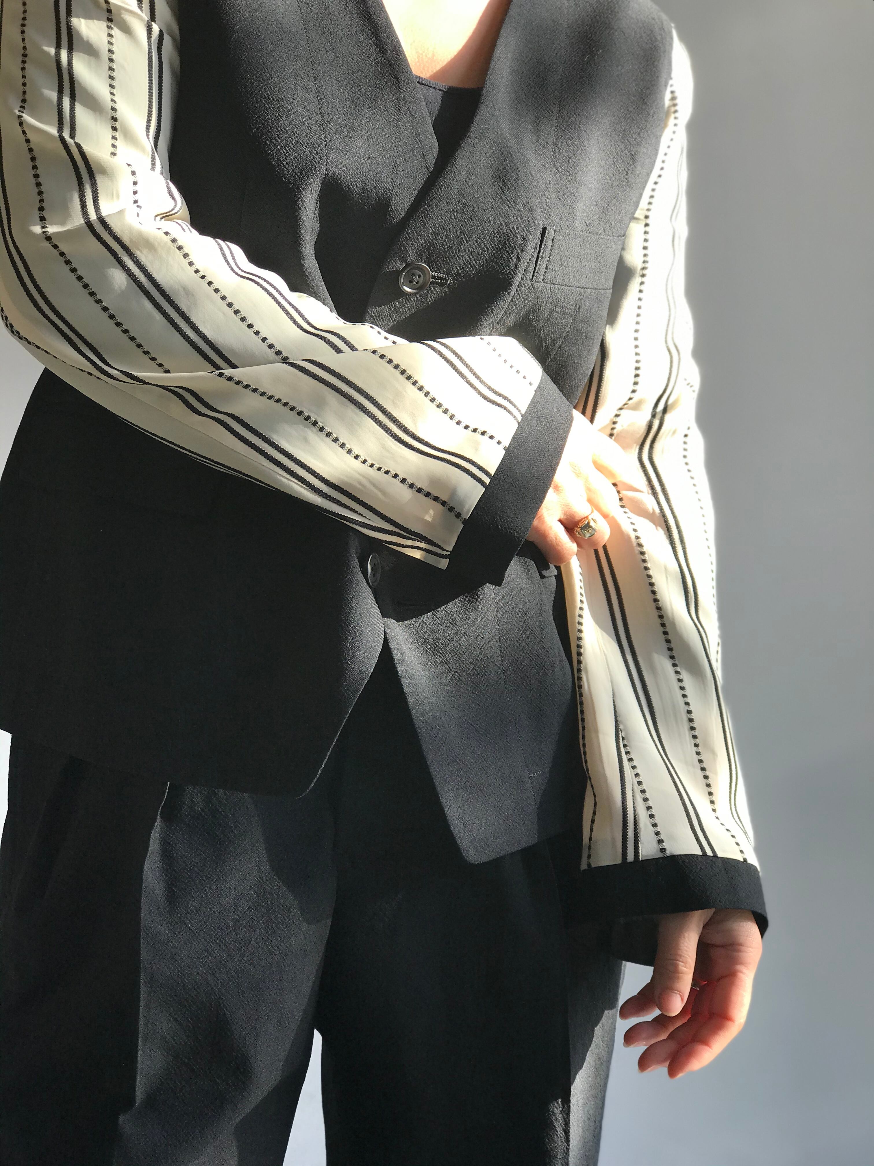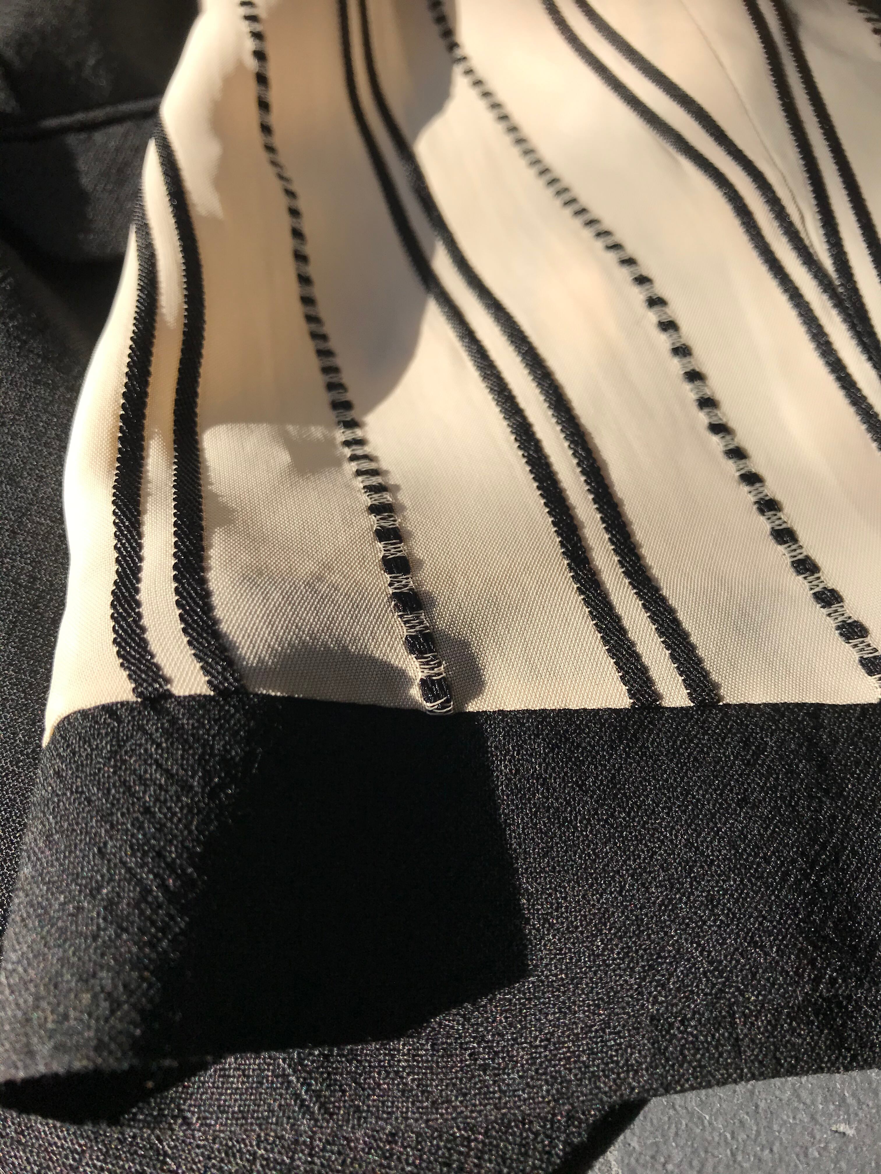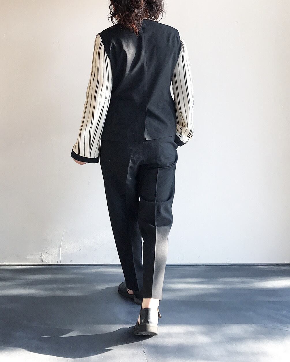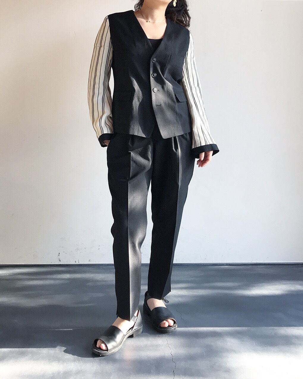 一見ベストを重ね着しているかのようなデザインで、袖部分はレーヨンドビーの透け感のあるストライプ生地とのコンビネーションがアクセント。