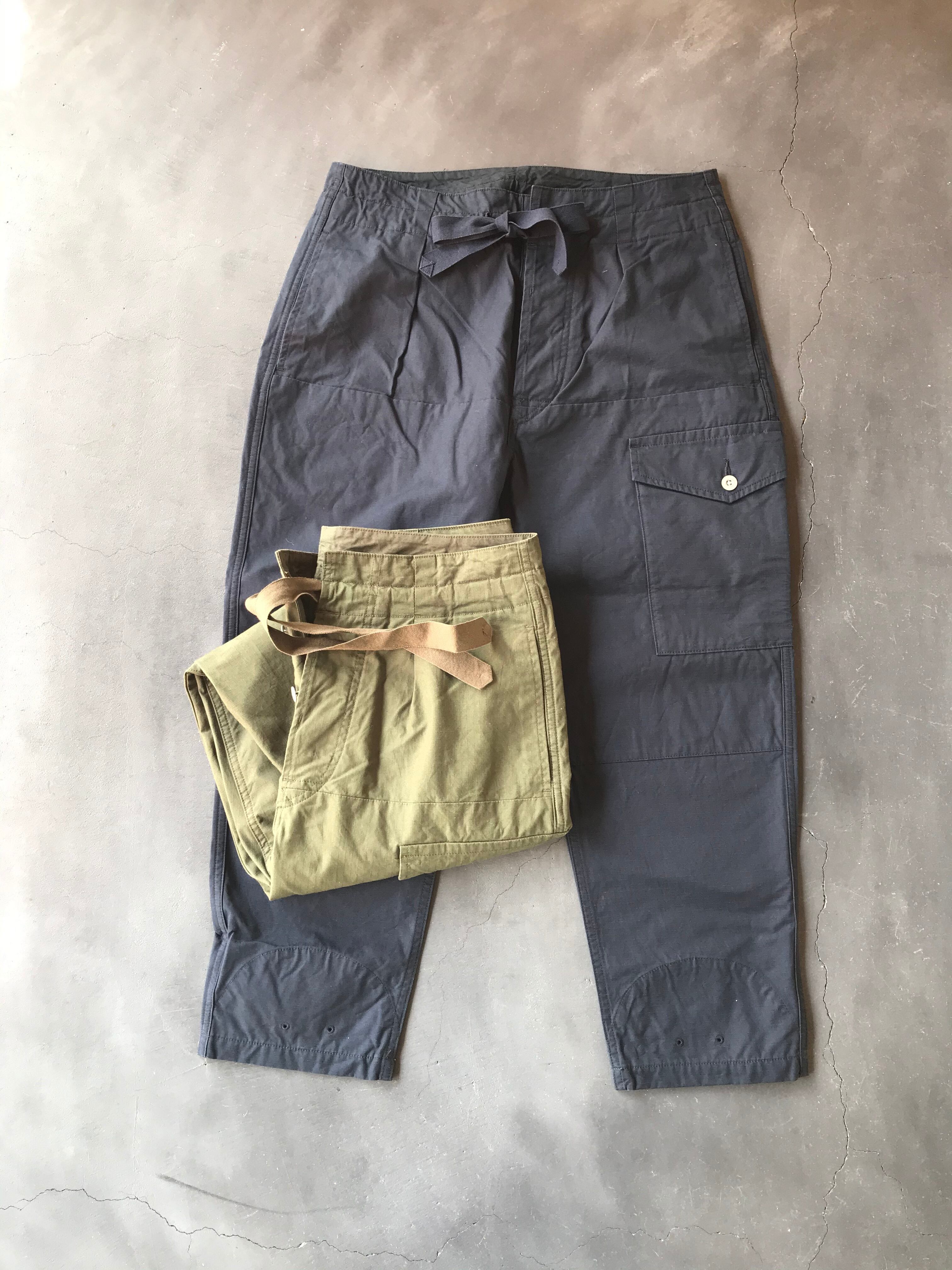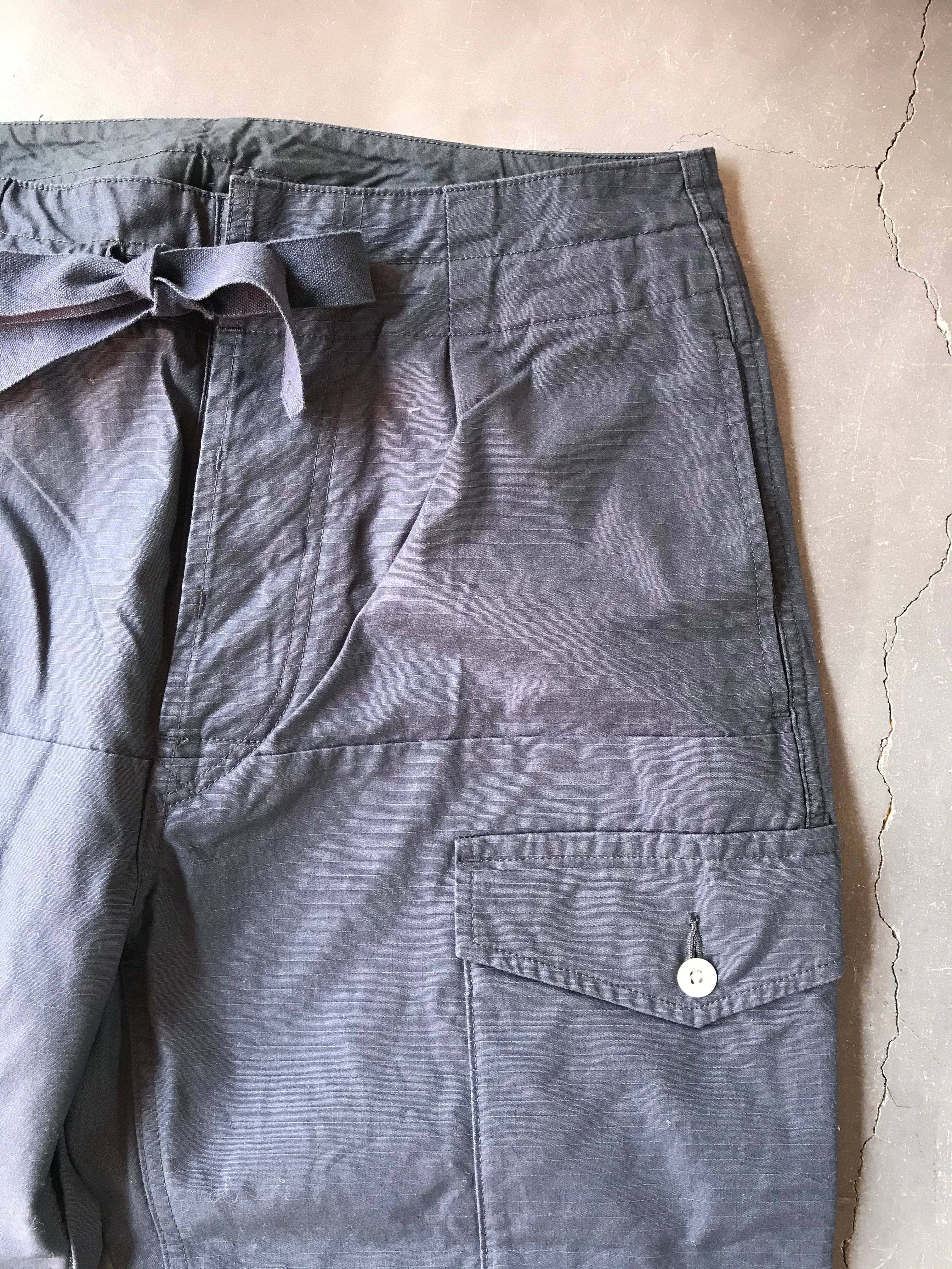 ベルギー軍が着用していたパンツがデザインモチーフです。裂け目を止めるために糸を格子状に織り込むことによって生まれる頑丈さと軽さを持ち合わせたリップストップ生地を採用。ウエストはドローストリングなので、履きやすく、快適な作りです。