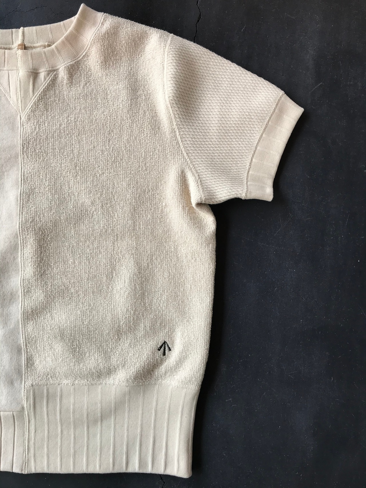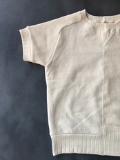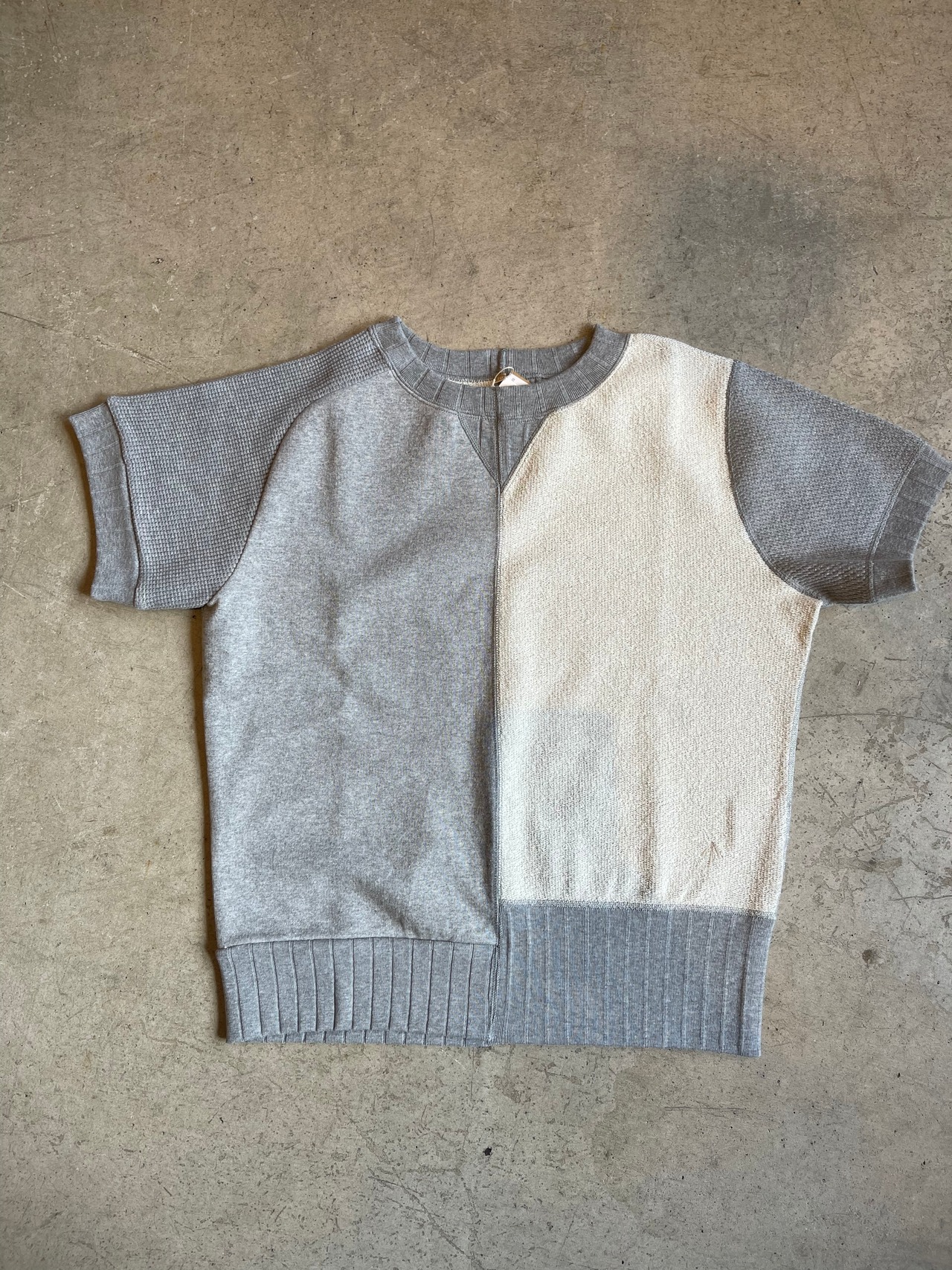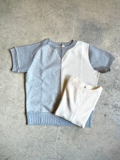 ナイジェルケーボン定番のアーミージャージーミックスを半袖スウェットにアレンジした新型。 左右で織りの違う生地を使用したナイジェルケーボンのスウェット。右身頃は1930年代、左は1940年代とそれぞれ異なった時代の、異なった仕様のデザインを異なるミシン・縫製方法で忠実に再現。