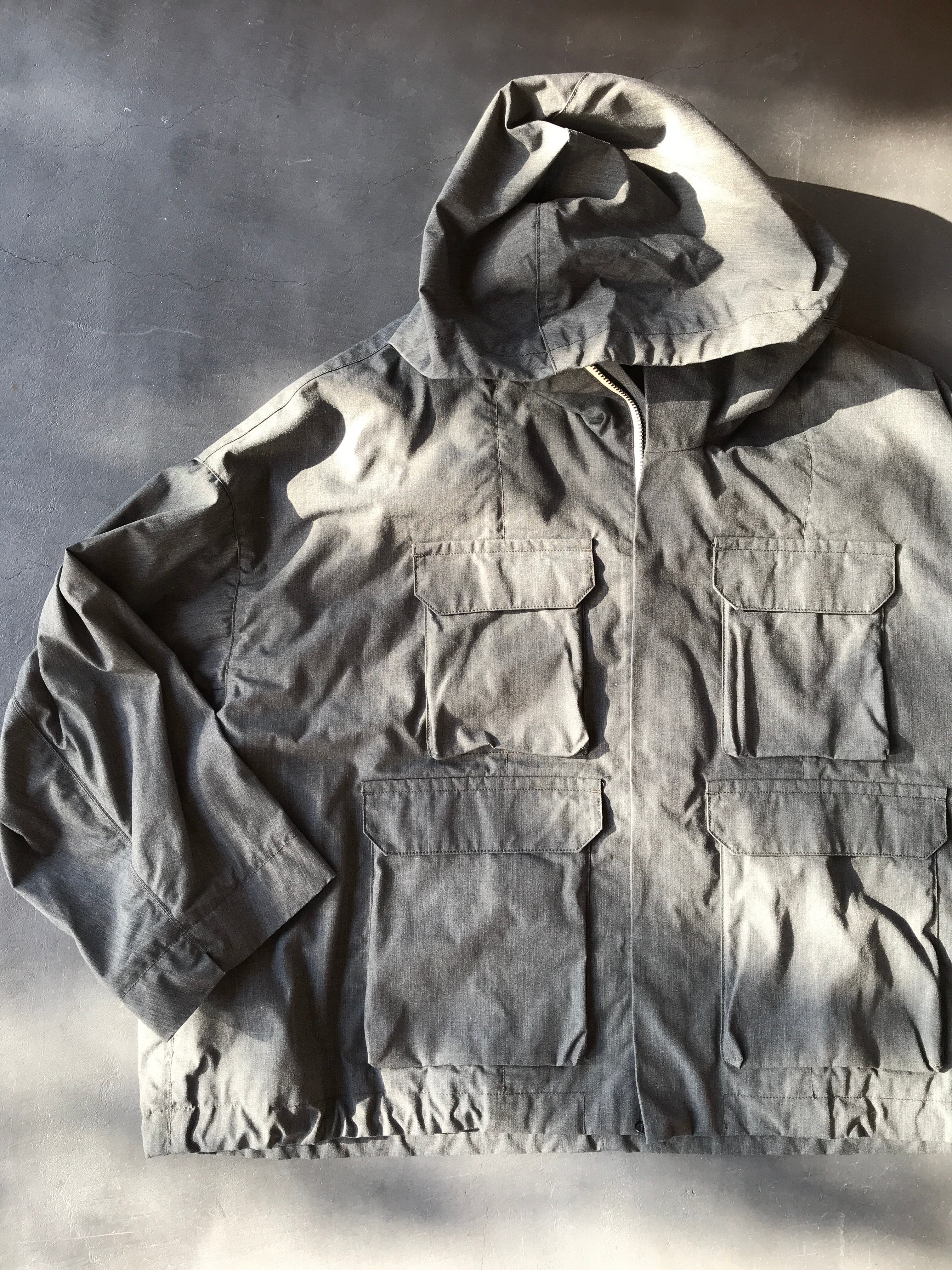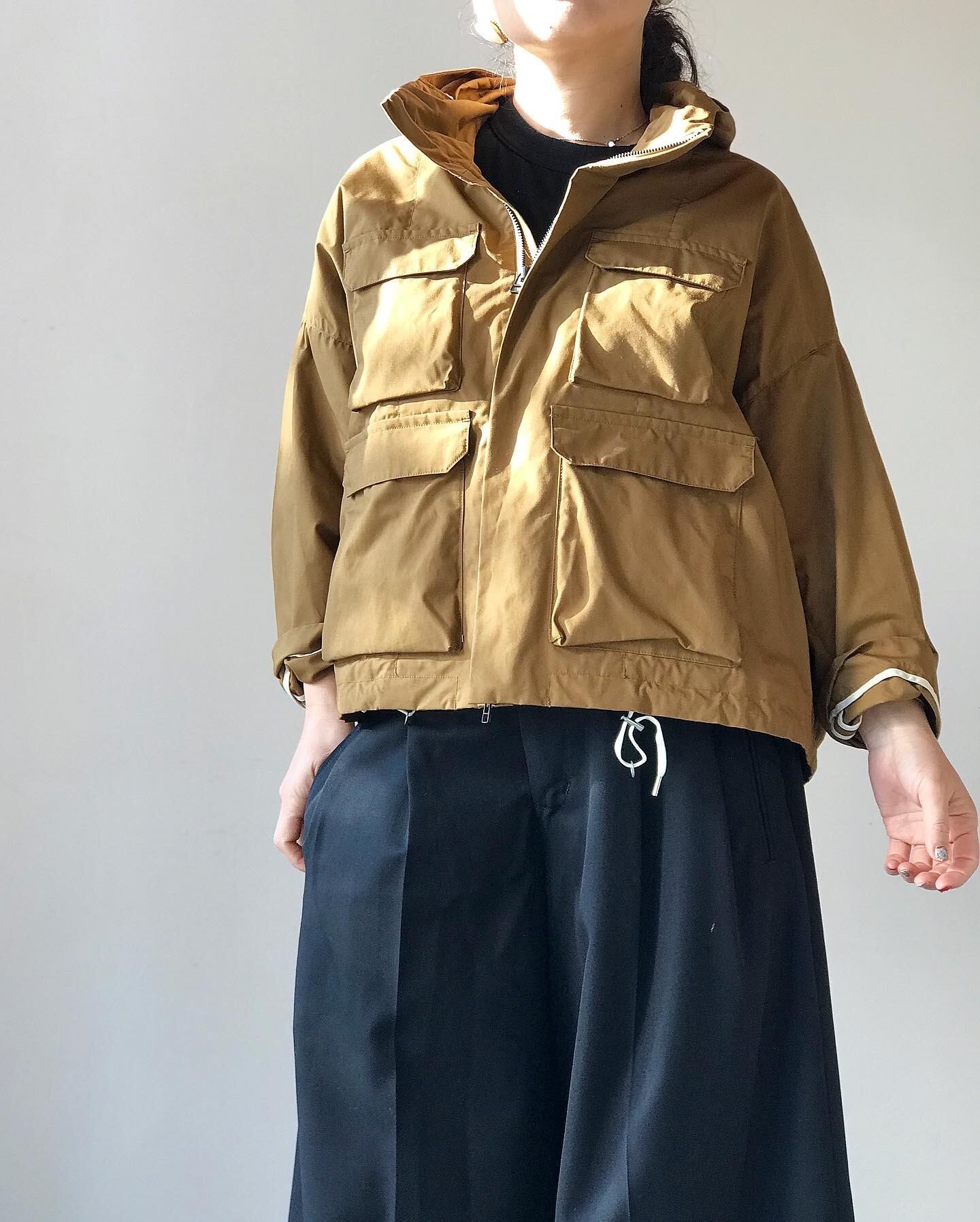 ミリタリーを意識したジャケットは、身幅広めの着丈短めで、パンツ、スカートどちらのスタイリングにも合わせやすい一枚です。