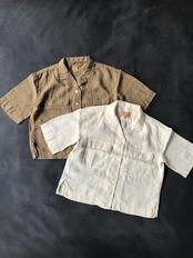 細くすっきりした衿、リラックス感のあるサイズ、ドロップした肩、ハーフスリーブのシルエットが今年らしい一着です。