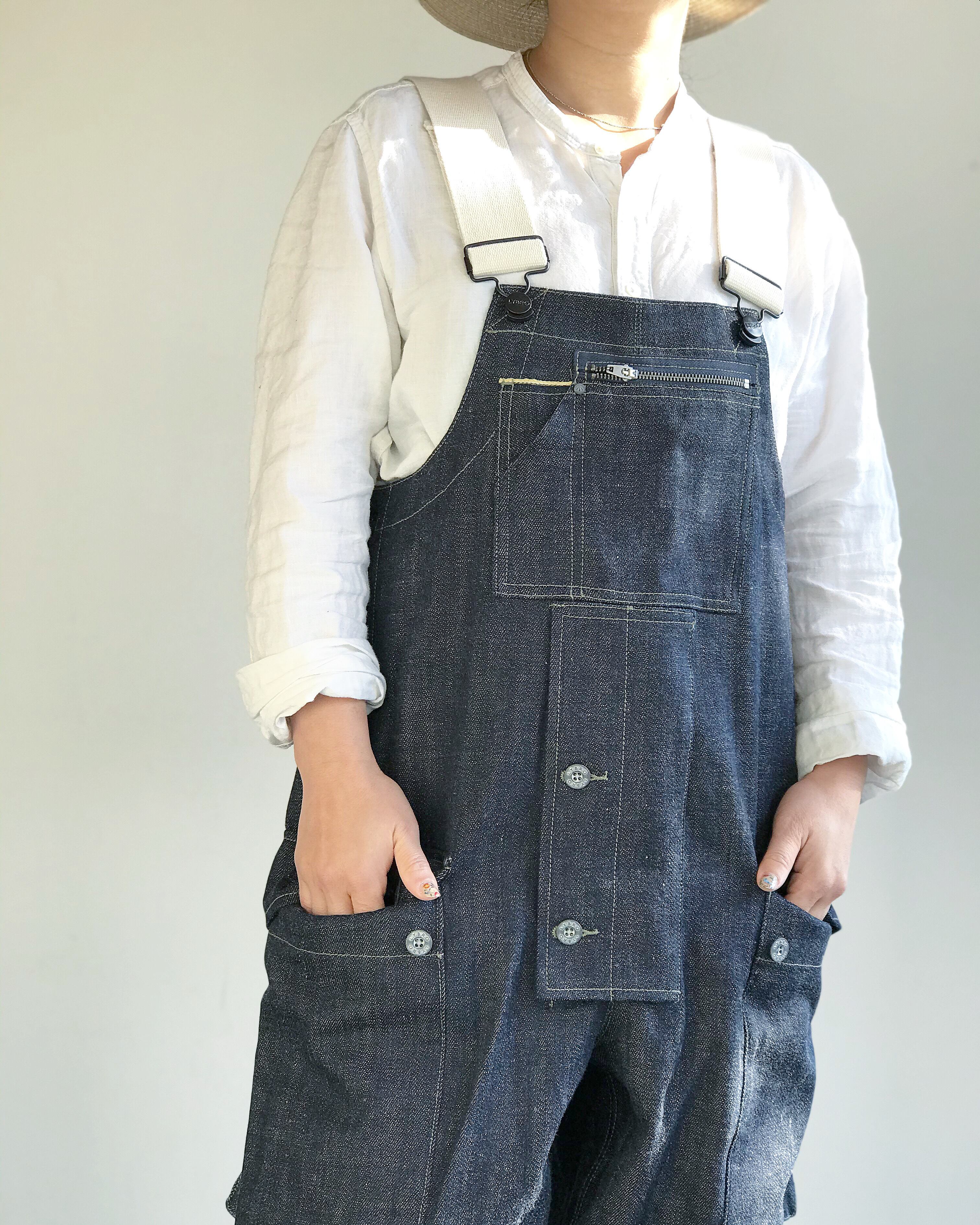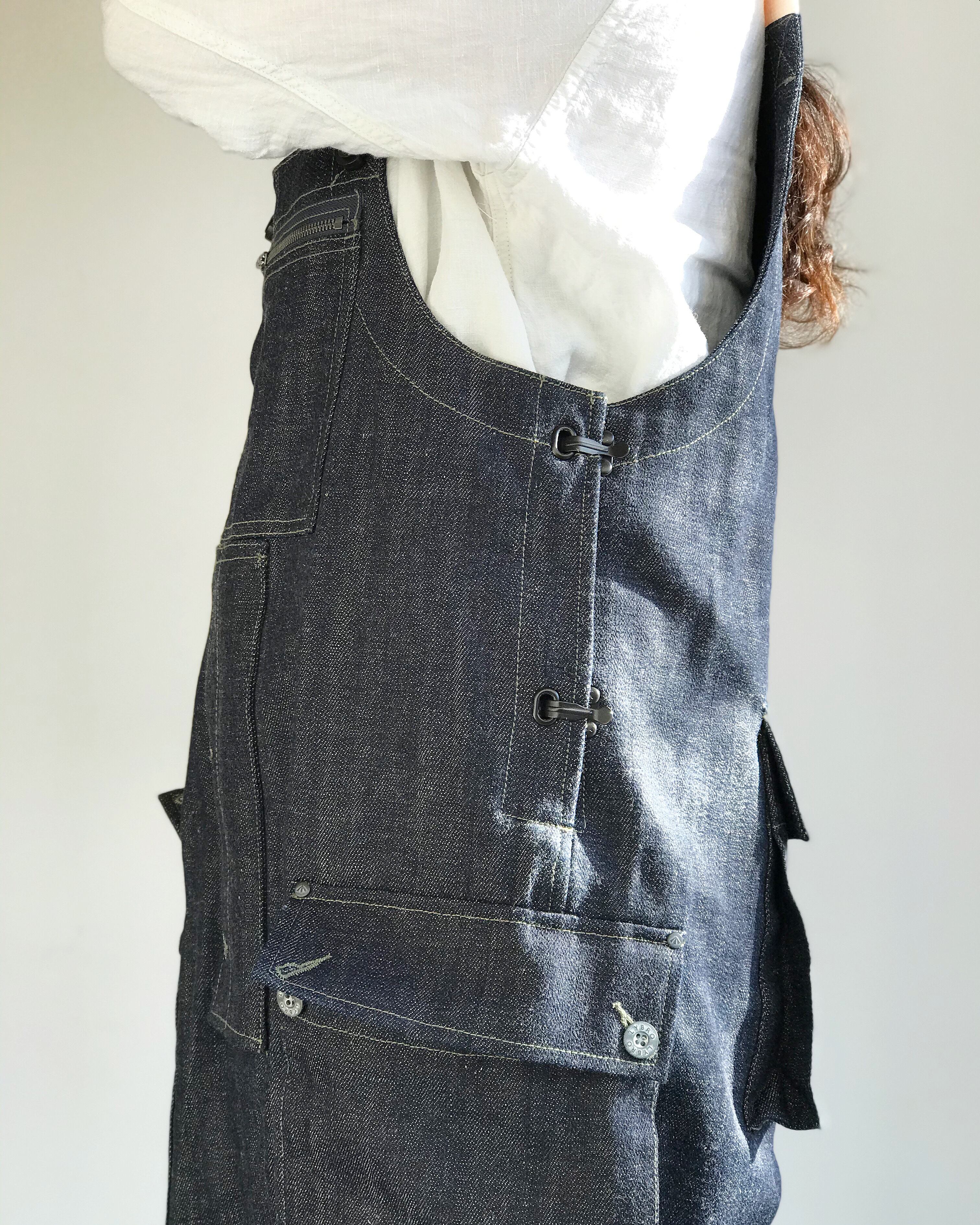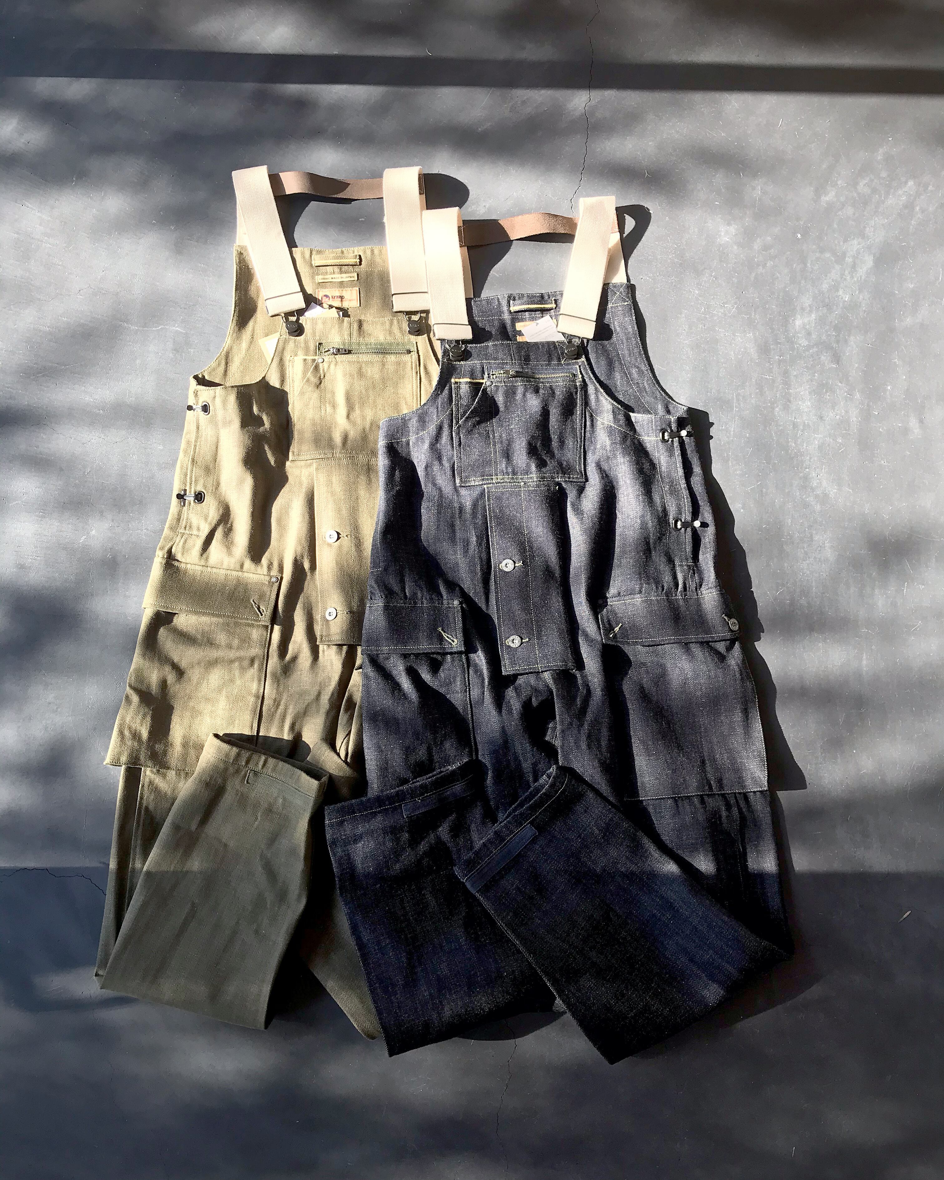 LYBROを代表する定番アイテムの一つであるNAVAL DUNGAREEは言わずもがな、ナイジェルのお気に入りのアイテムです。米国海軍のワークウェアとして艦船の甲板で第二次大戦時に着用されていたアイテムは、そのルーズなシルエット、機能的なポケット、また身体を守るための機能が備わったアイテムです。その機能的なポケットはジップ付きの胸ポケット、ペンの収納から様々な物を収納可能な足元の大型ポケットまで多岐に渡ります。側部には着用を容易にする剛性の高いクリップと、オーバーオールにありがちな肩のストラップの滑落防止の為のレザーストラップが配されています。素材は柔らかく織られた日本製の12オンスのデニムで、極上の肌触りと高い耐久性を備えます。
