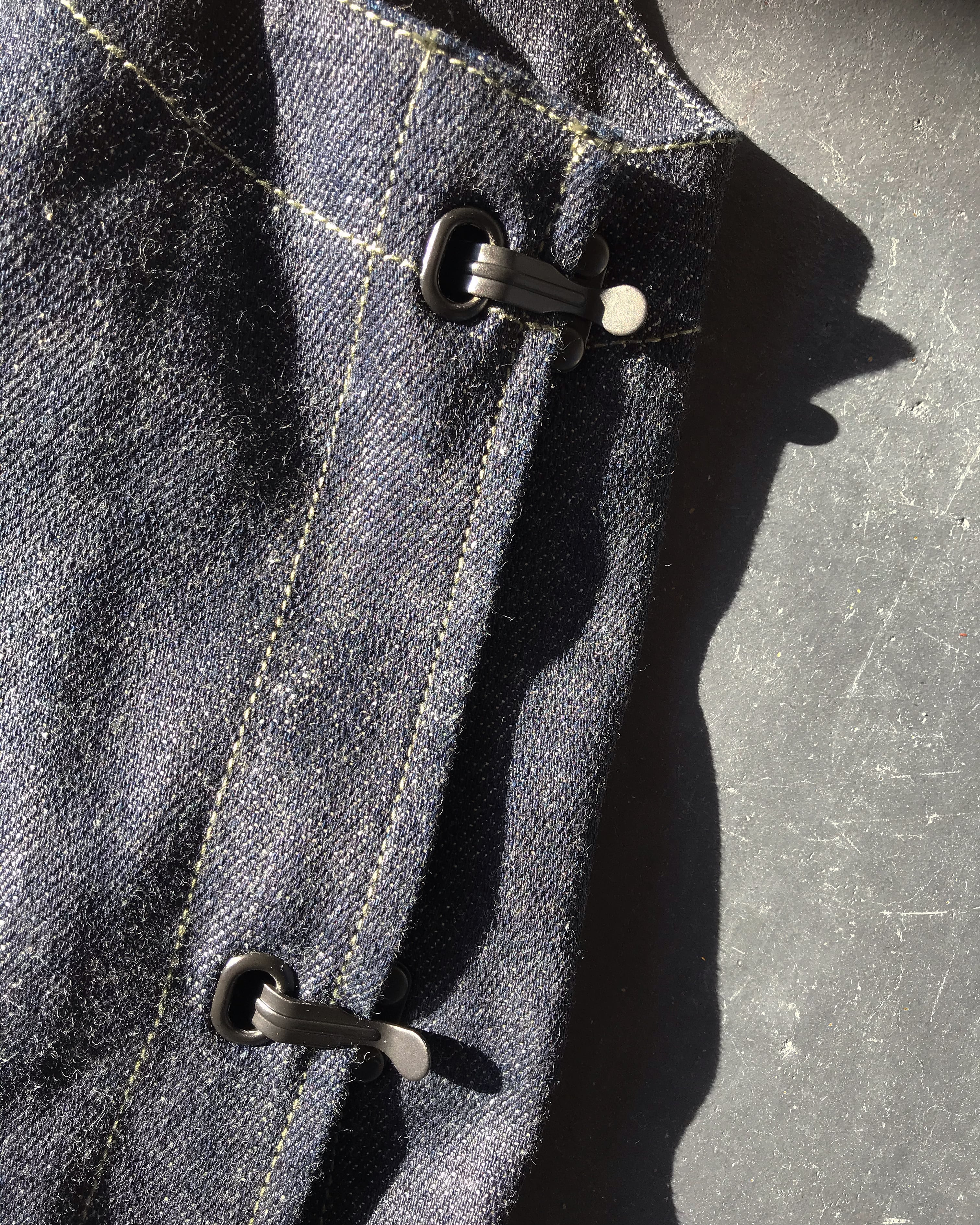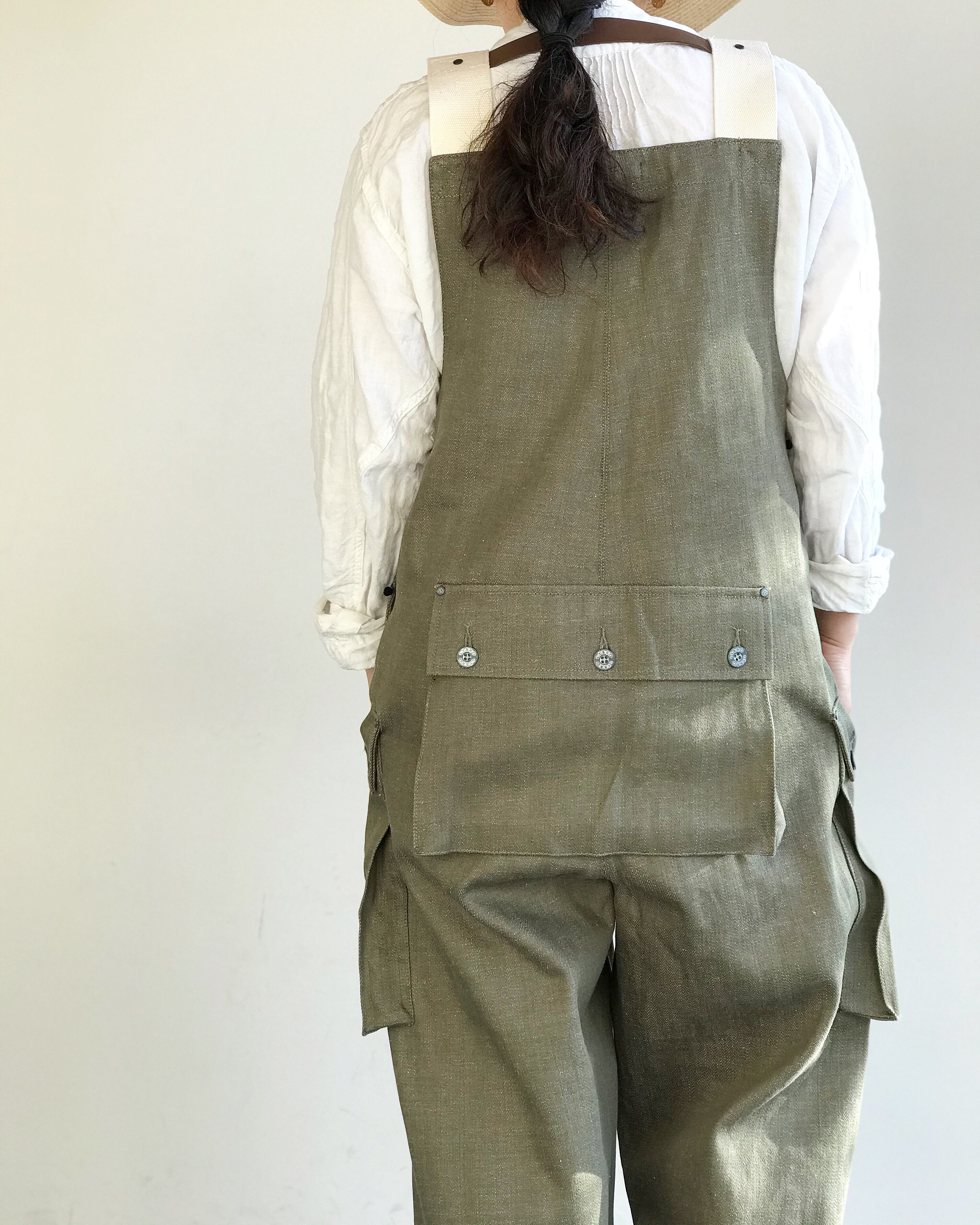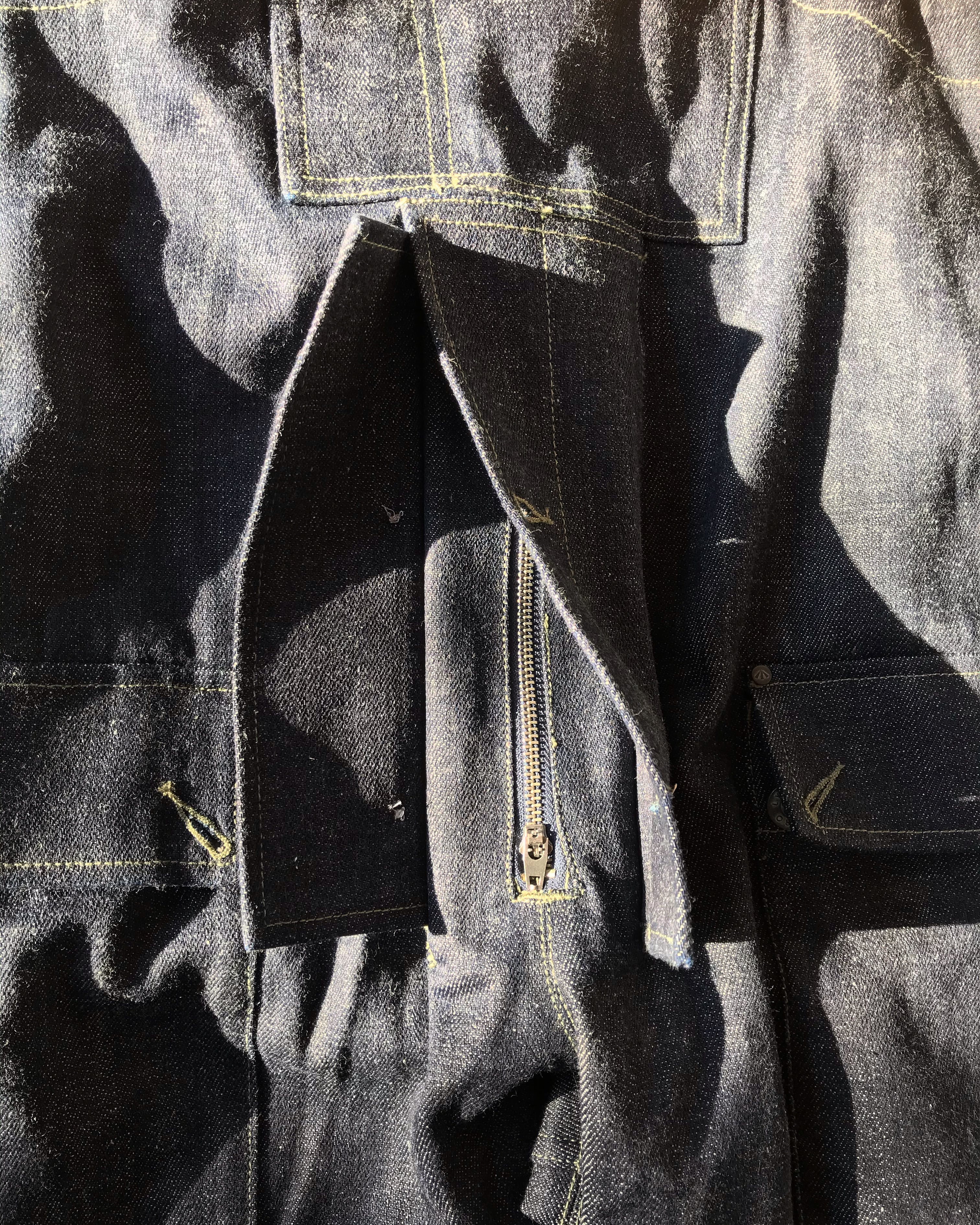 LYBROを代表する定番アイテムの一つであるNAVAL DUNGAREEは言わずもがな、ナイジェルのお気に入りのアイテムです。米国海軍のワークウェアとして艦船の甲板で第二次大戦時に着用されていたアイテムは、そのルーズなシルエット、機能的なポケット、また身体を守るための機能が備わったアイテムです。その機能的なポケットはジップ付きの胸ポケット、ペンの収納から様々な物を収納可能な足元の大型ポケットまで多岐に渡ります。側部には着用を容易にする剛性の高いクリップと、オーバーオールにありがちな肩のストラップの滑落防止の為のレザーストラップが配されています。素材は柔らかく織られた日本製の12オンスのデニムで、極上の肌触りと高い耐久性を備えます。
