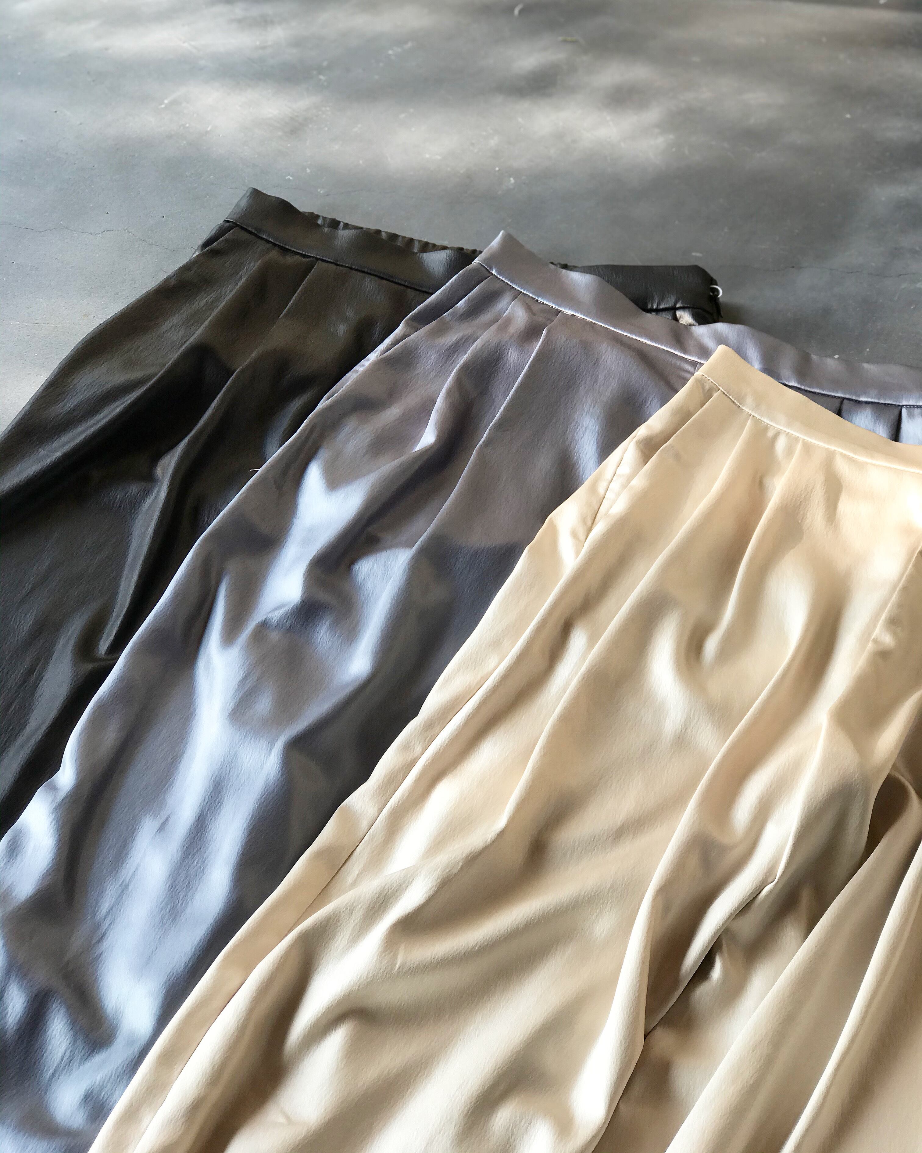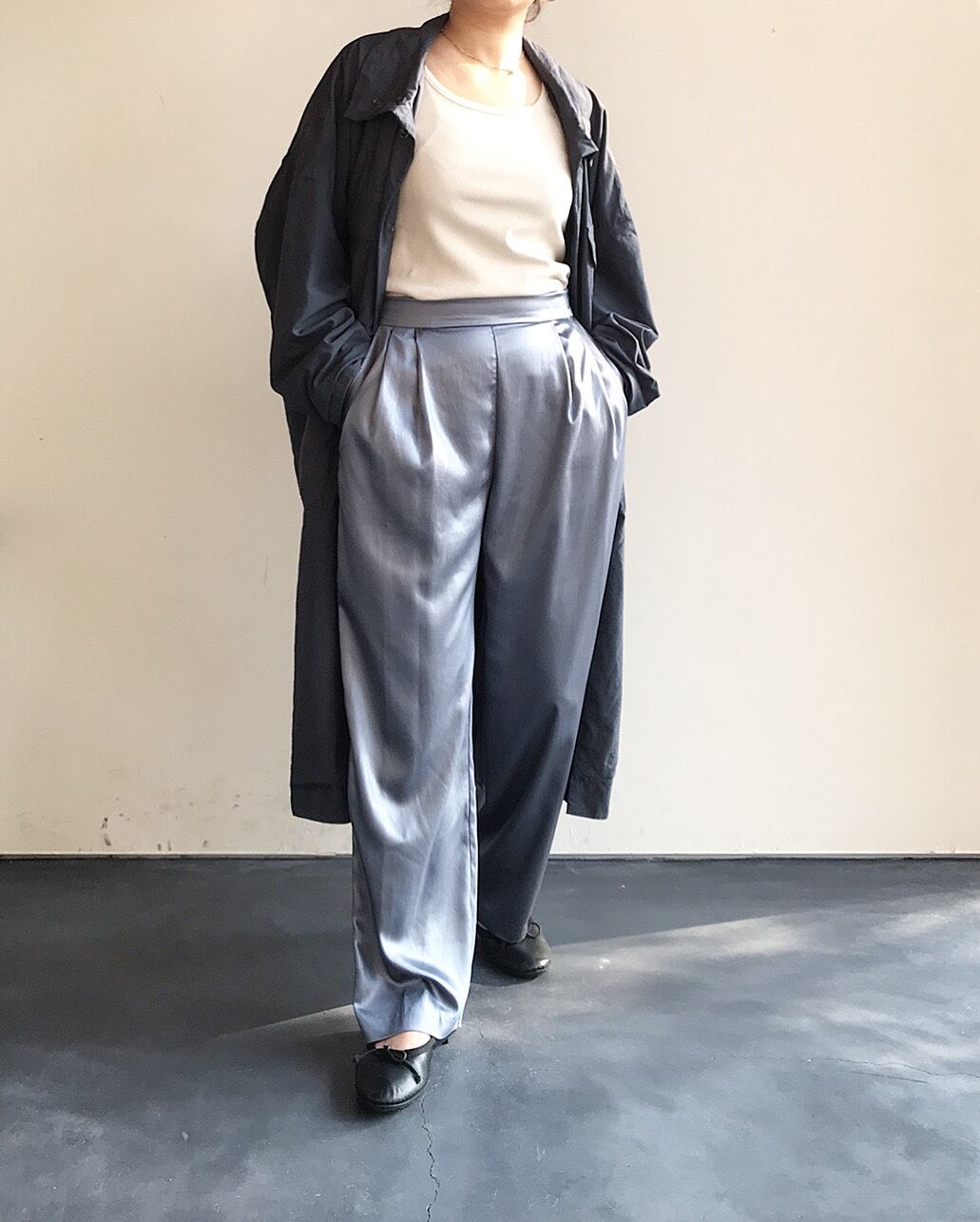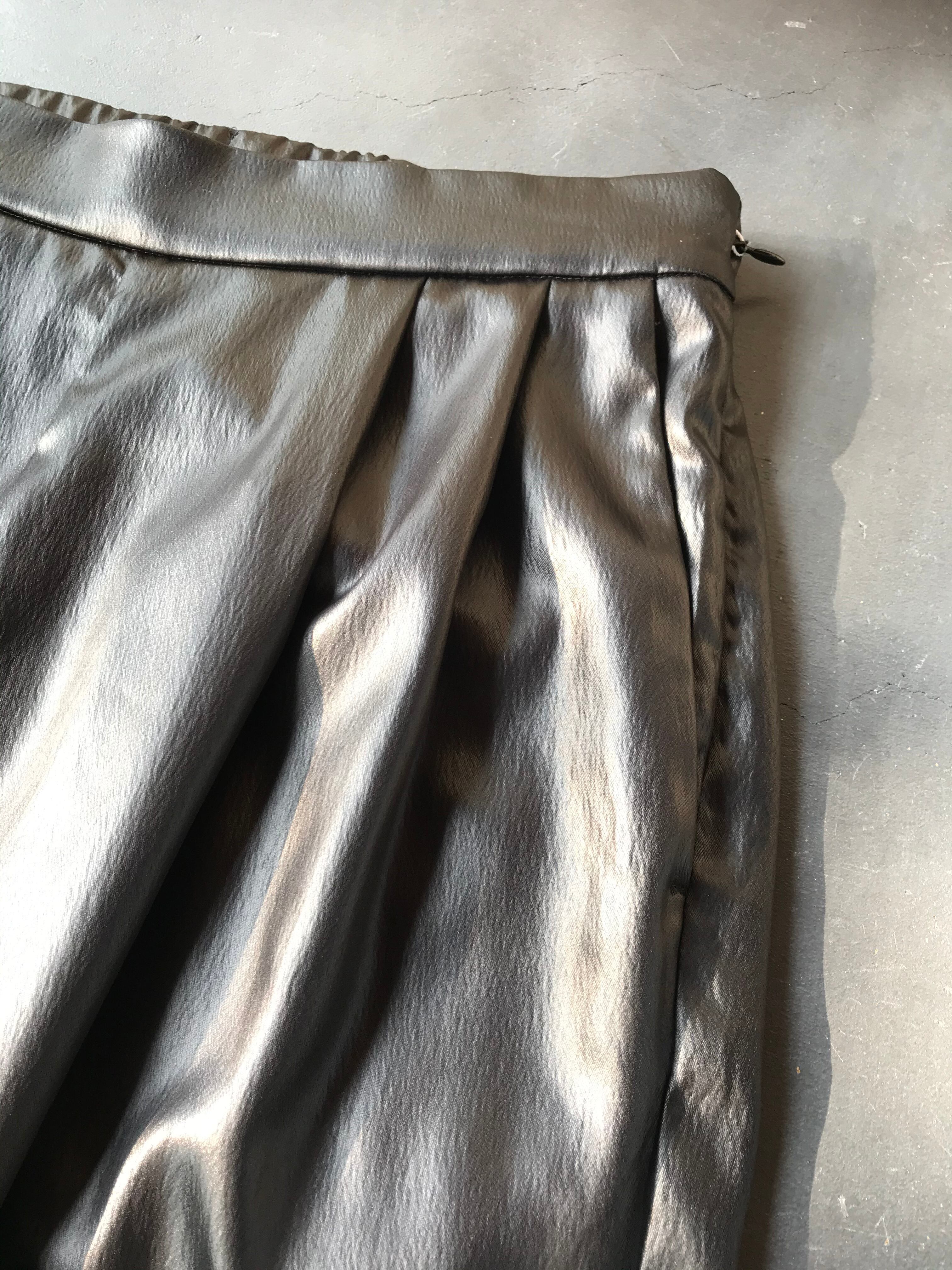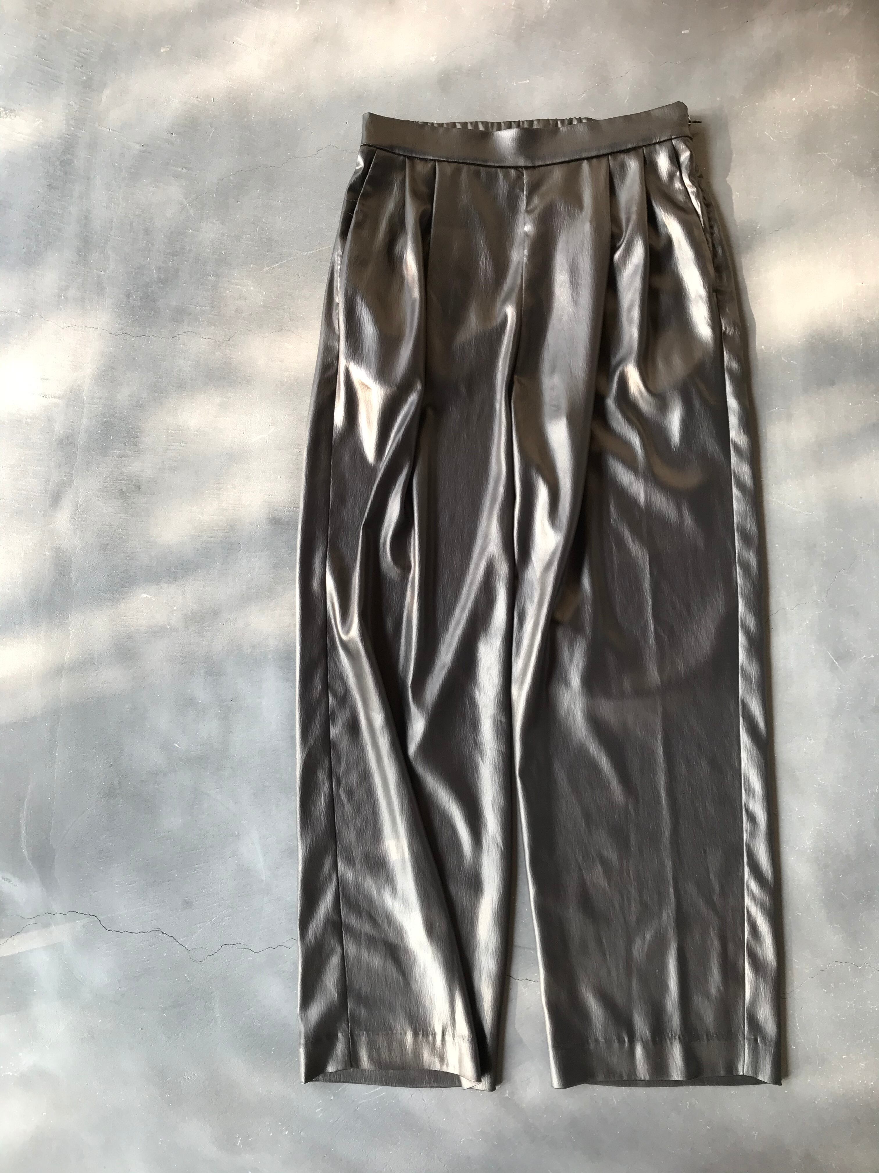 サテン生地に鏡面加工を施し、レザーのような表情を加えたストレートパンツ。