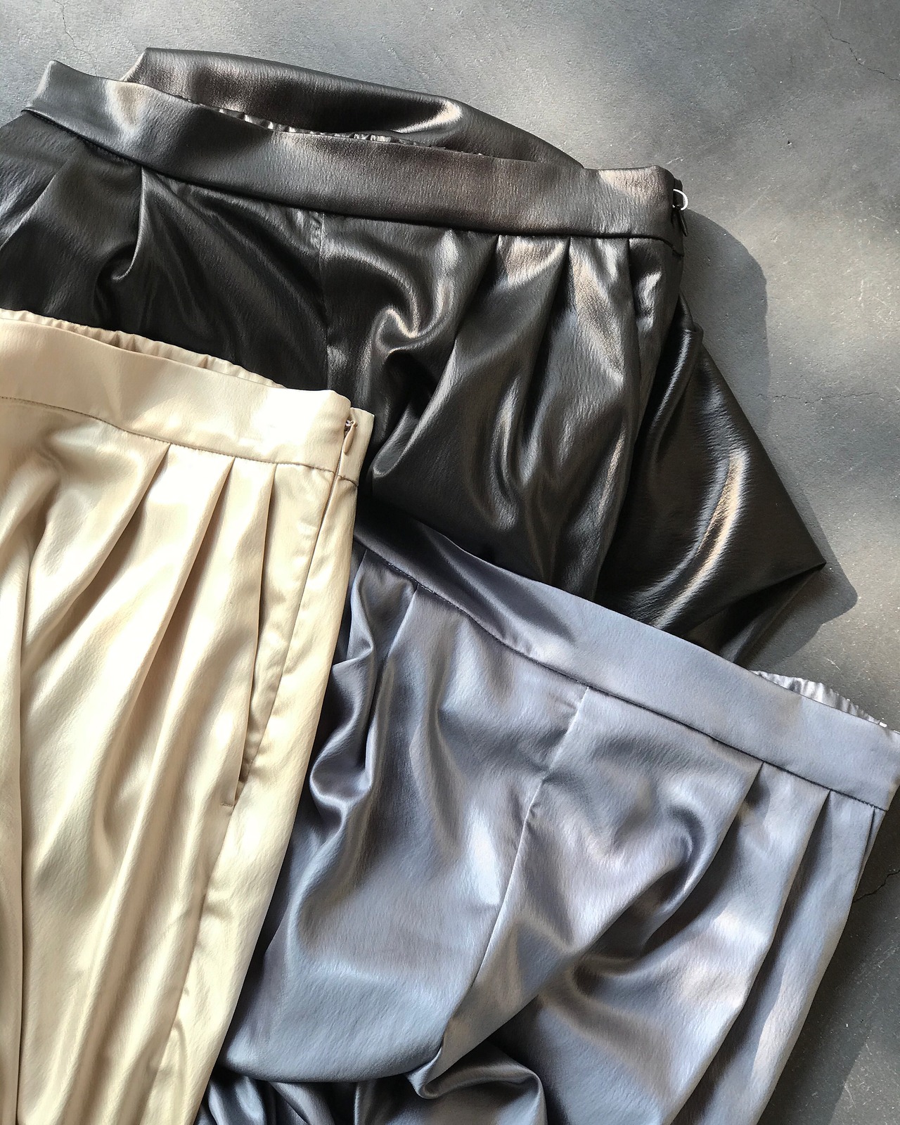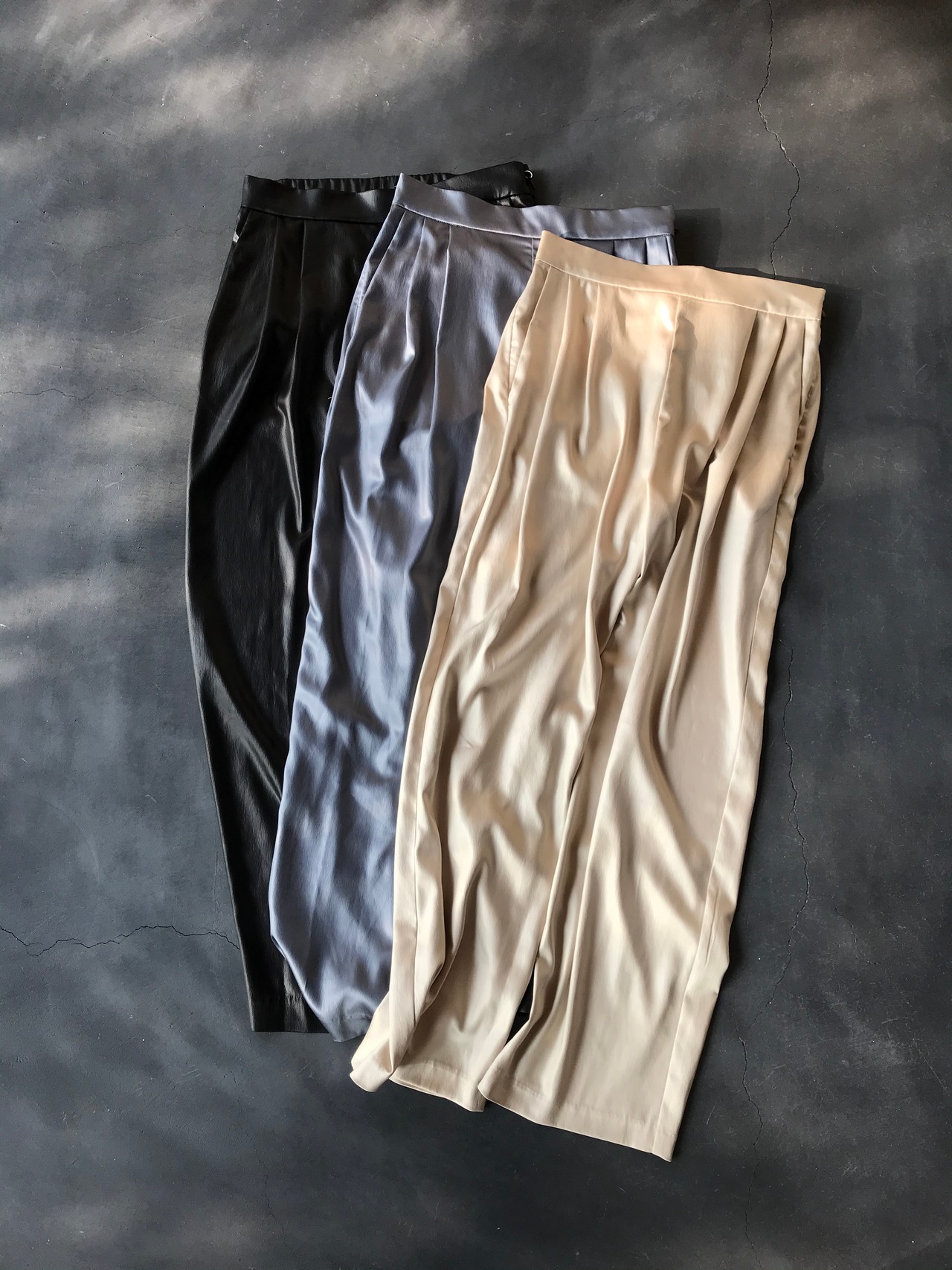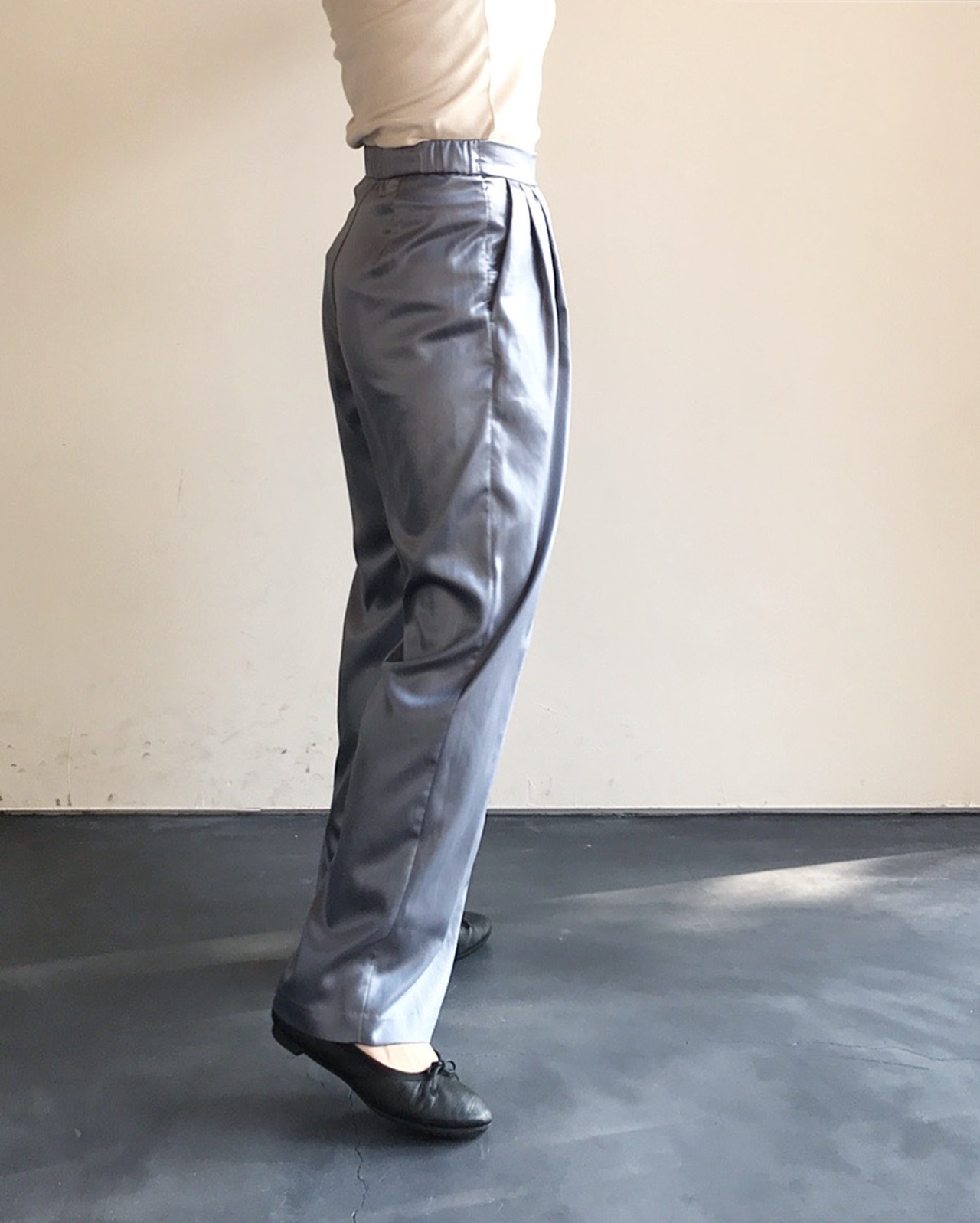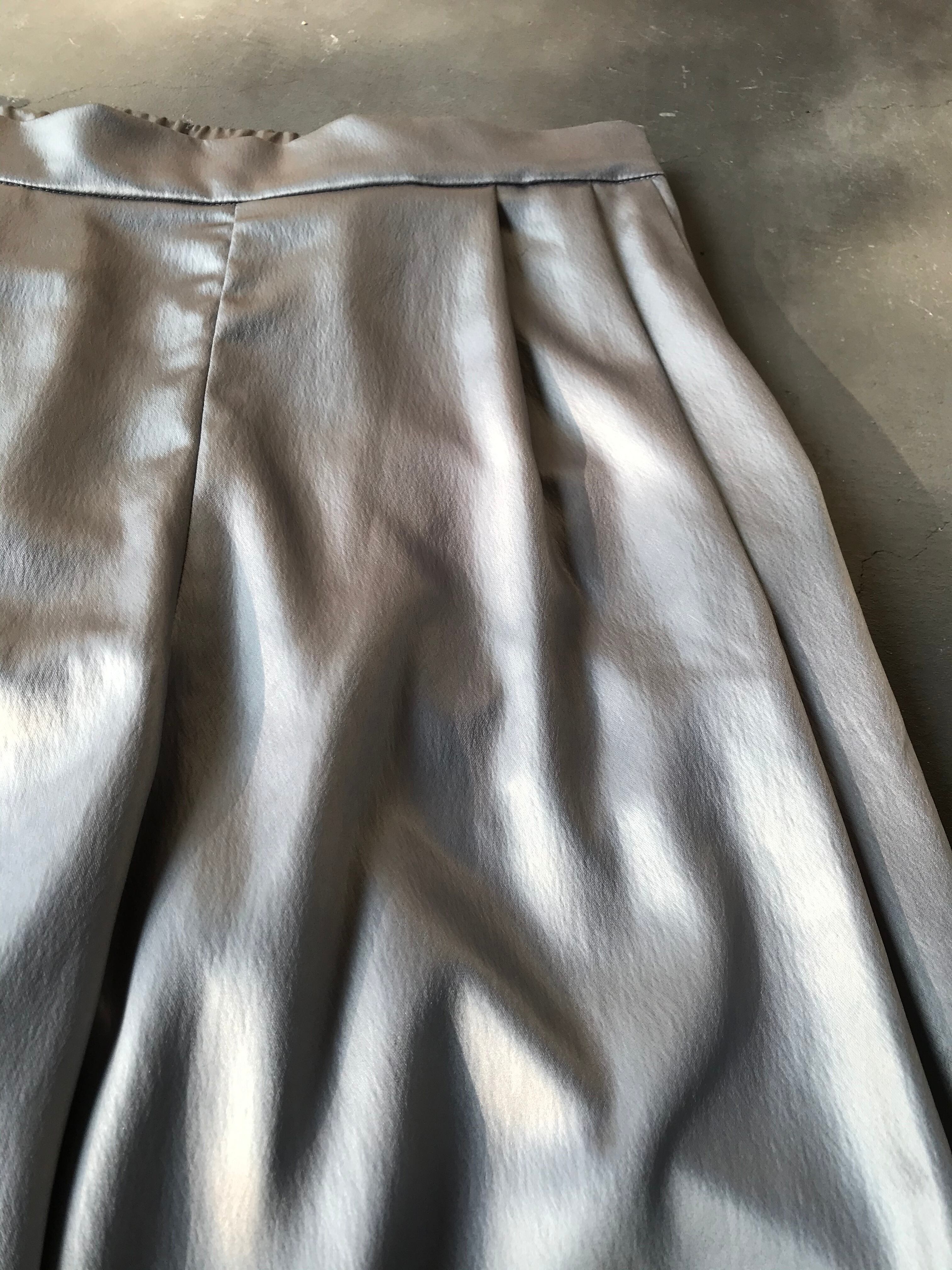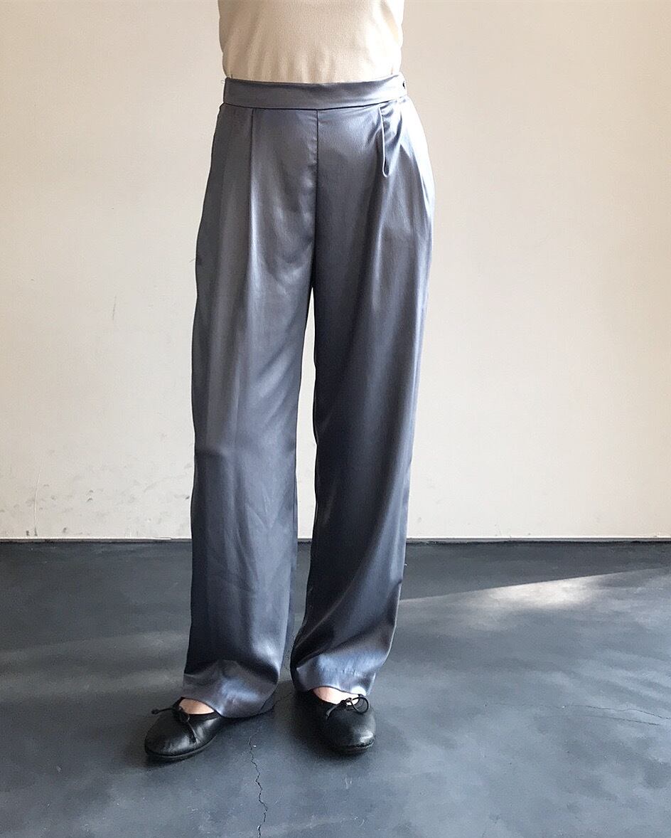 サテン生地に鏡面加工を施し、レザーのような表情を加えたストレートパンツ。