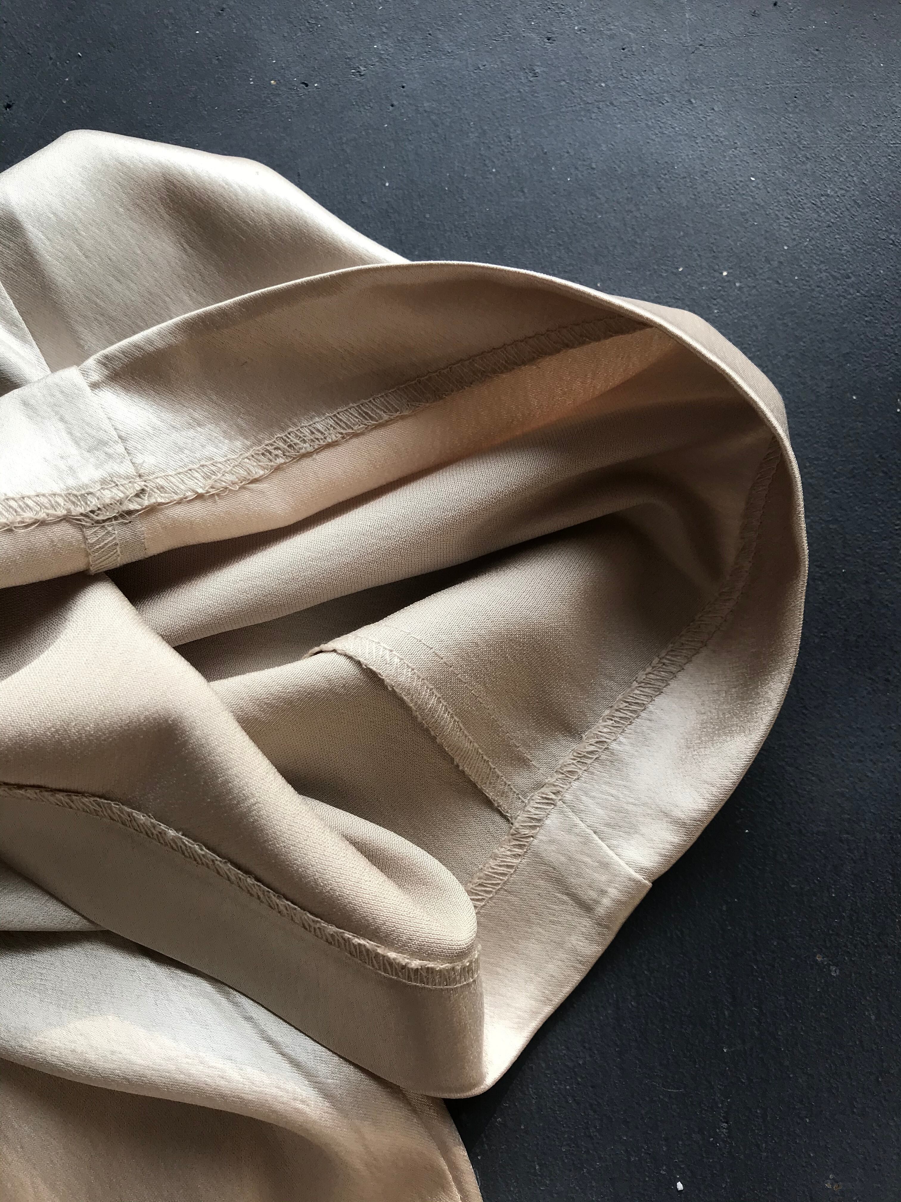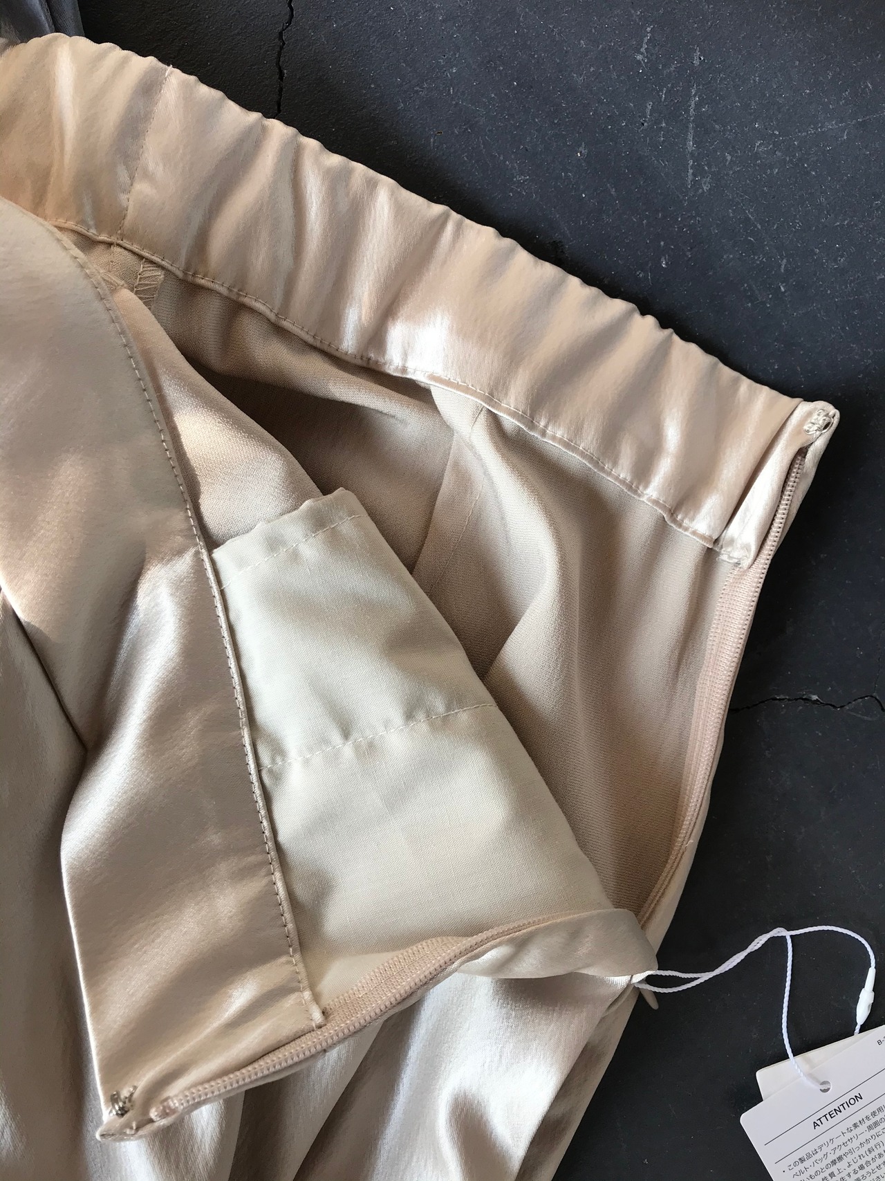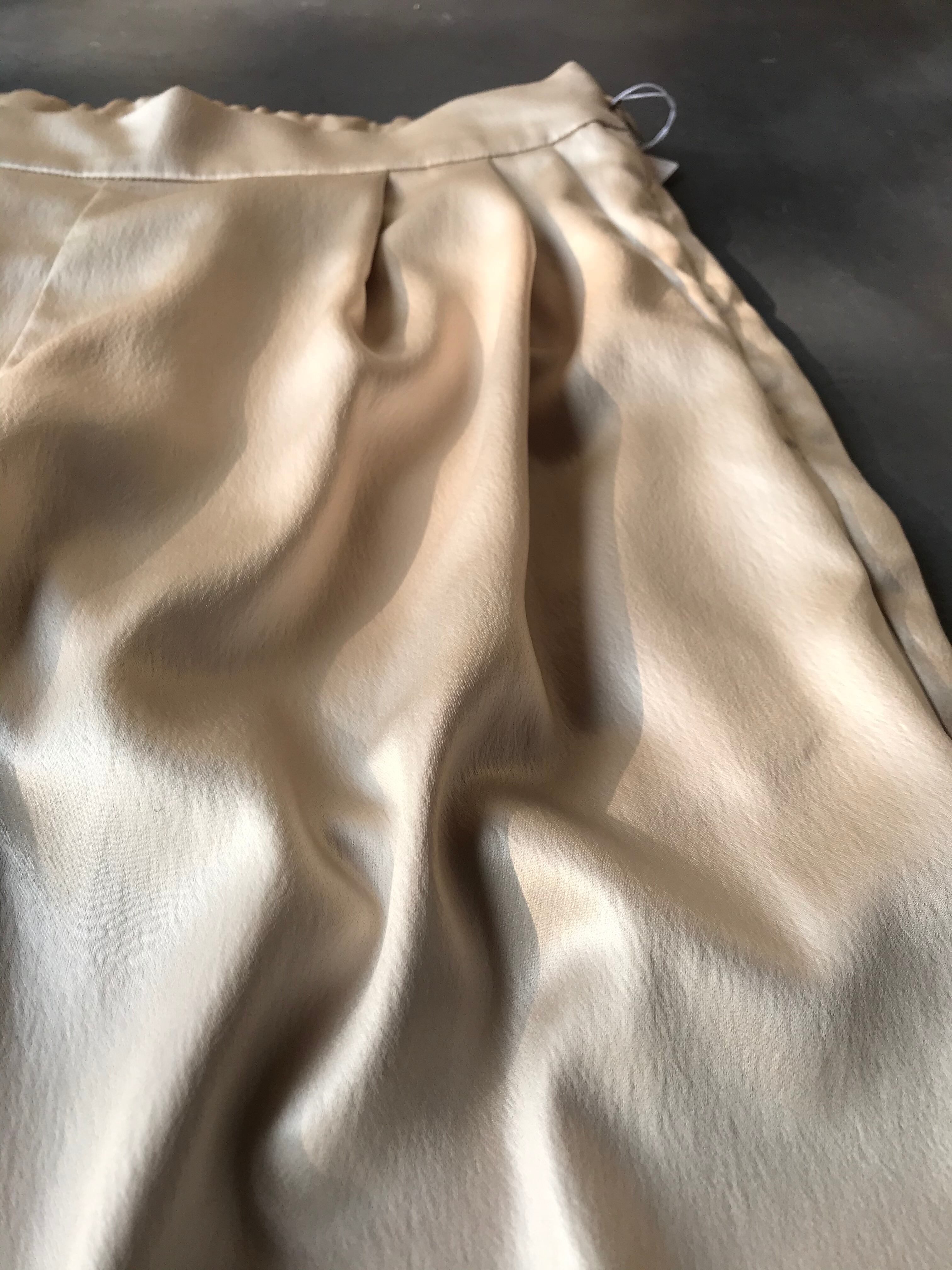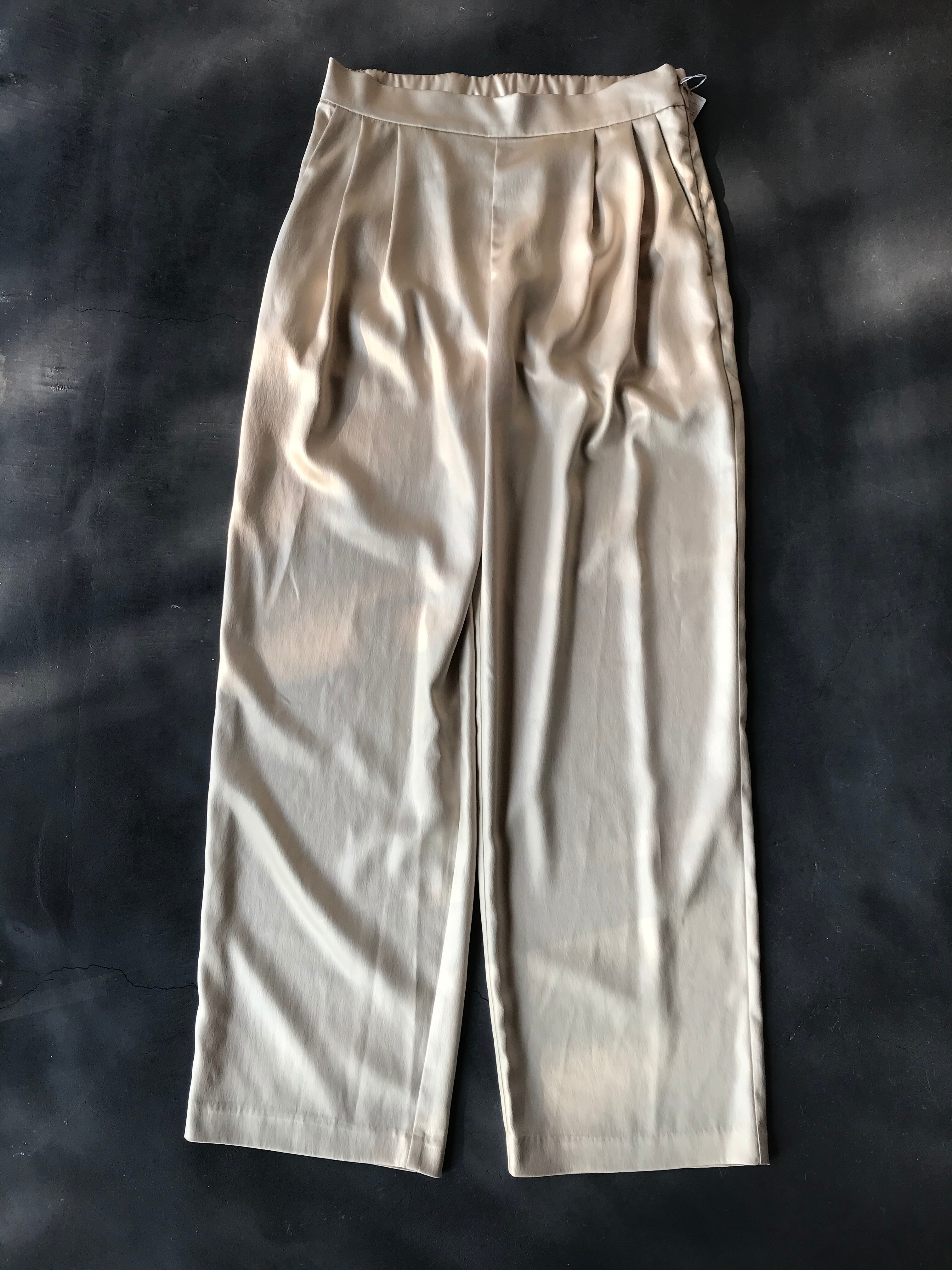 サテン生地に鏡面加工を施し、レザーのような表情を加えたストレートパンツ。