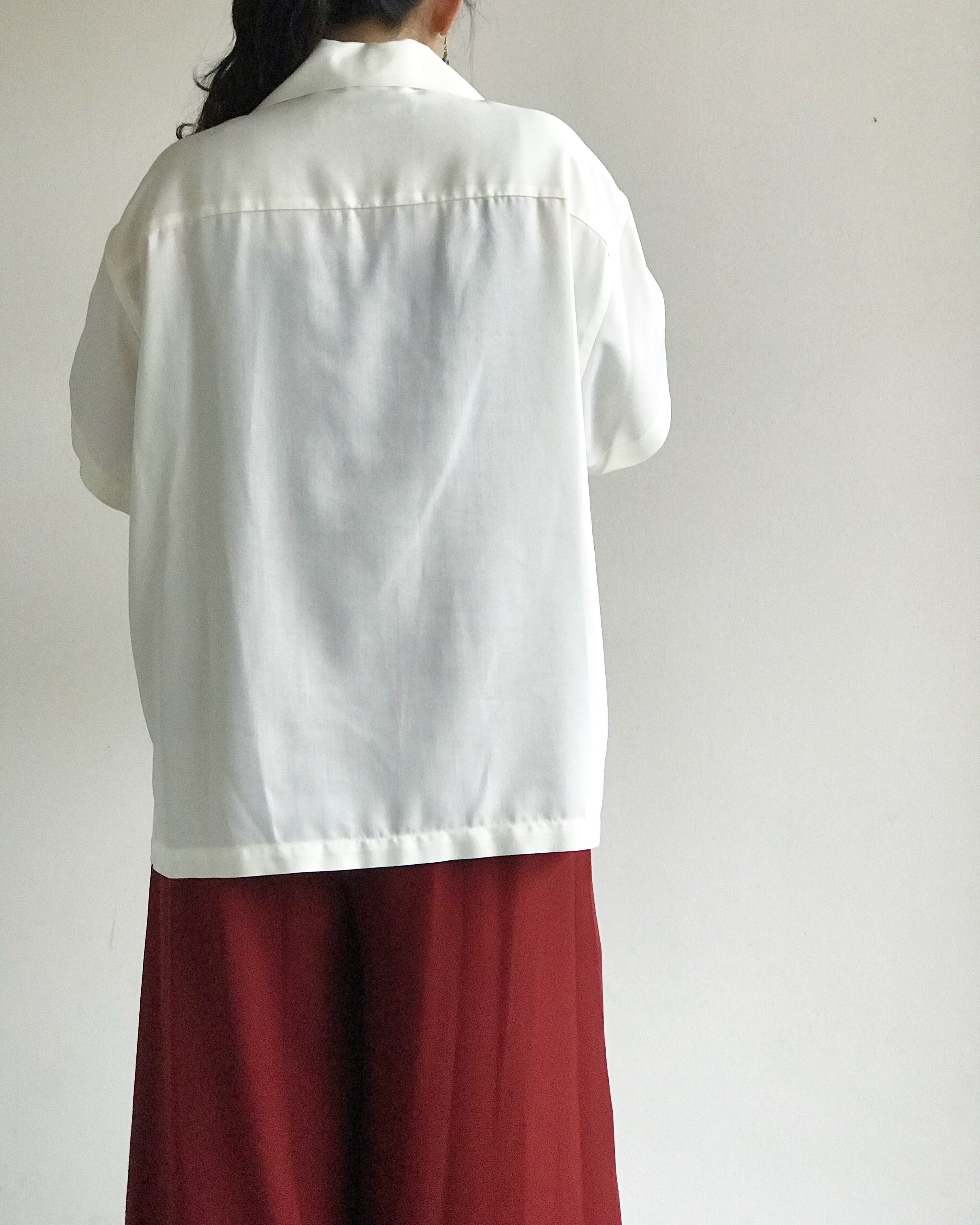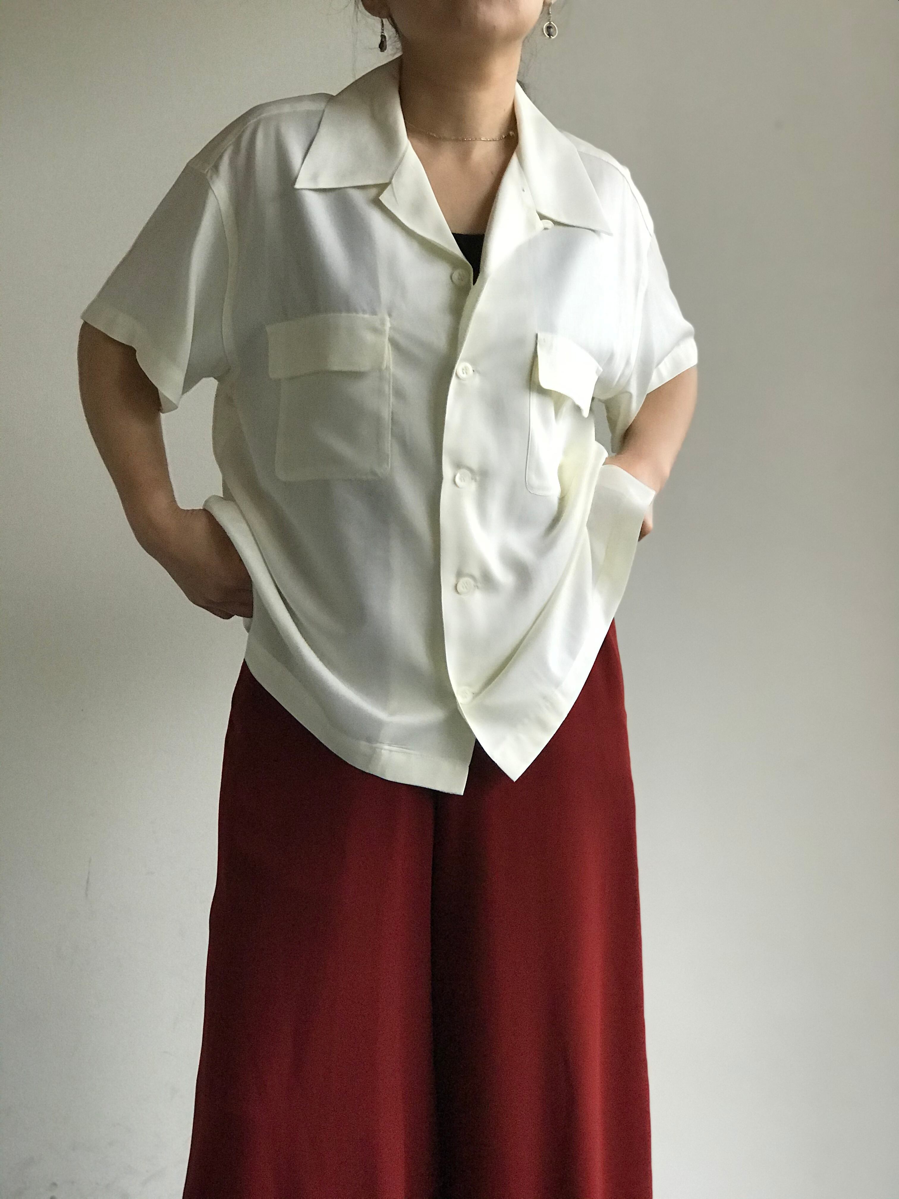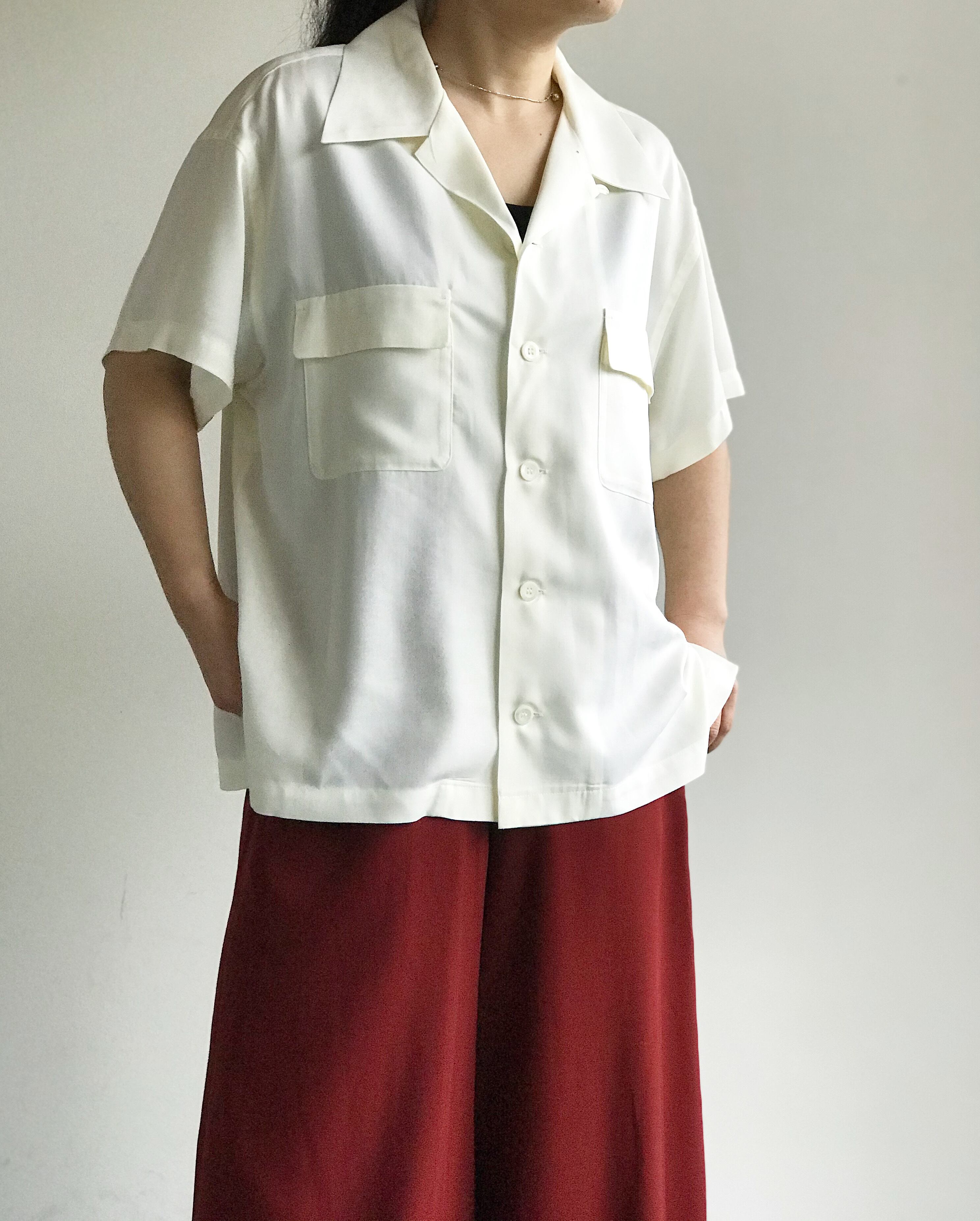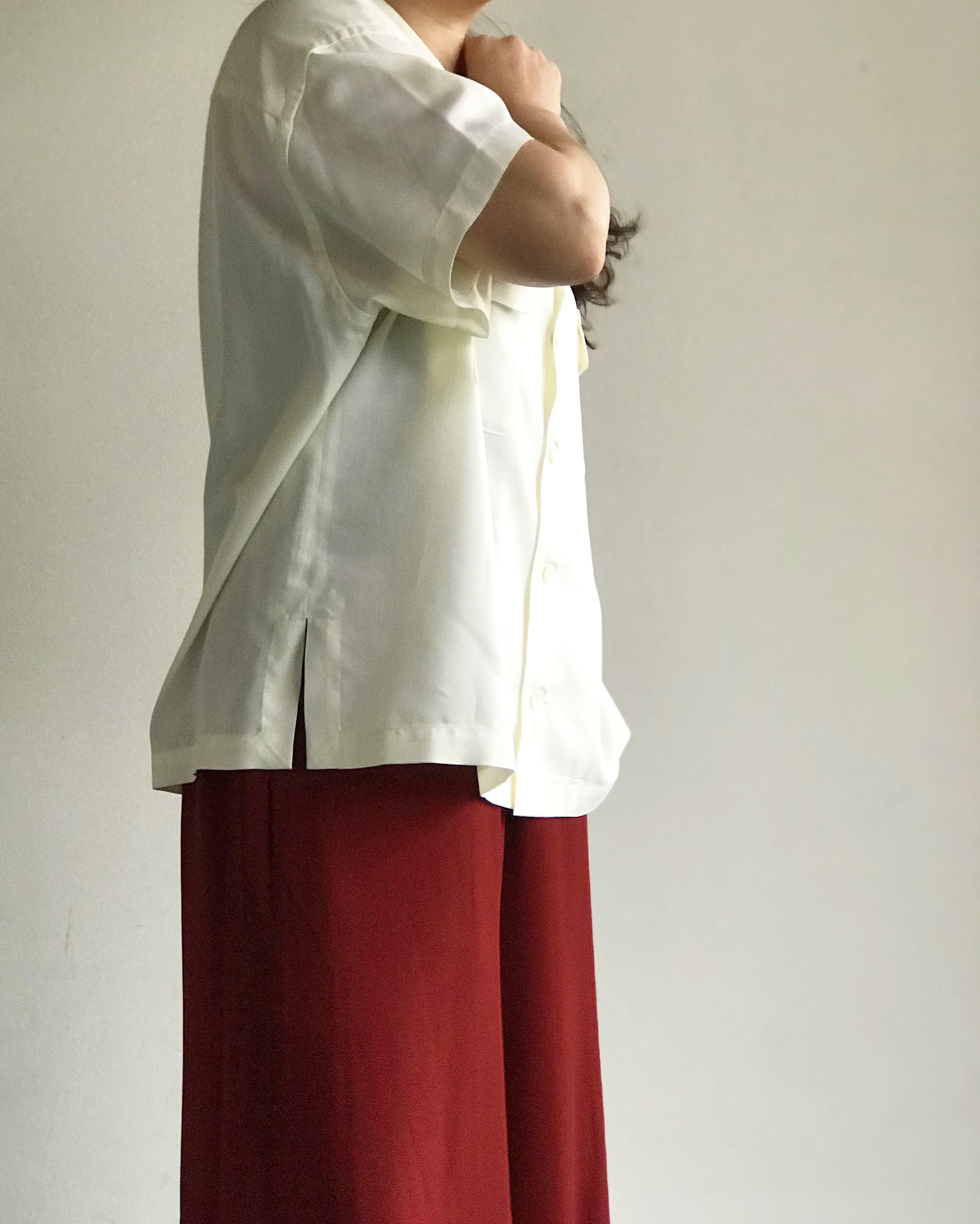 ゆったりとしたサイズ感が魅力のオープンカラーシャツ。メンズライクなシルエットが逆に女性らしいスタイリングに合うシャツです。
