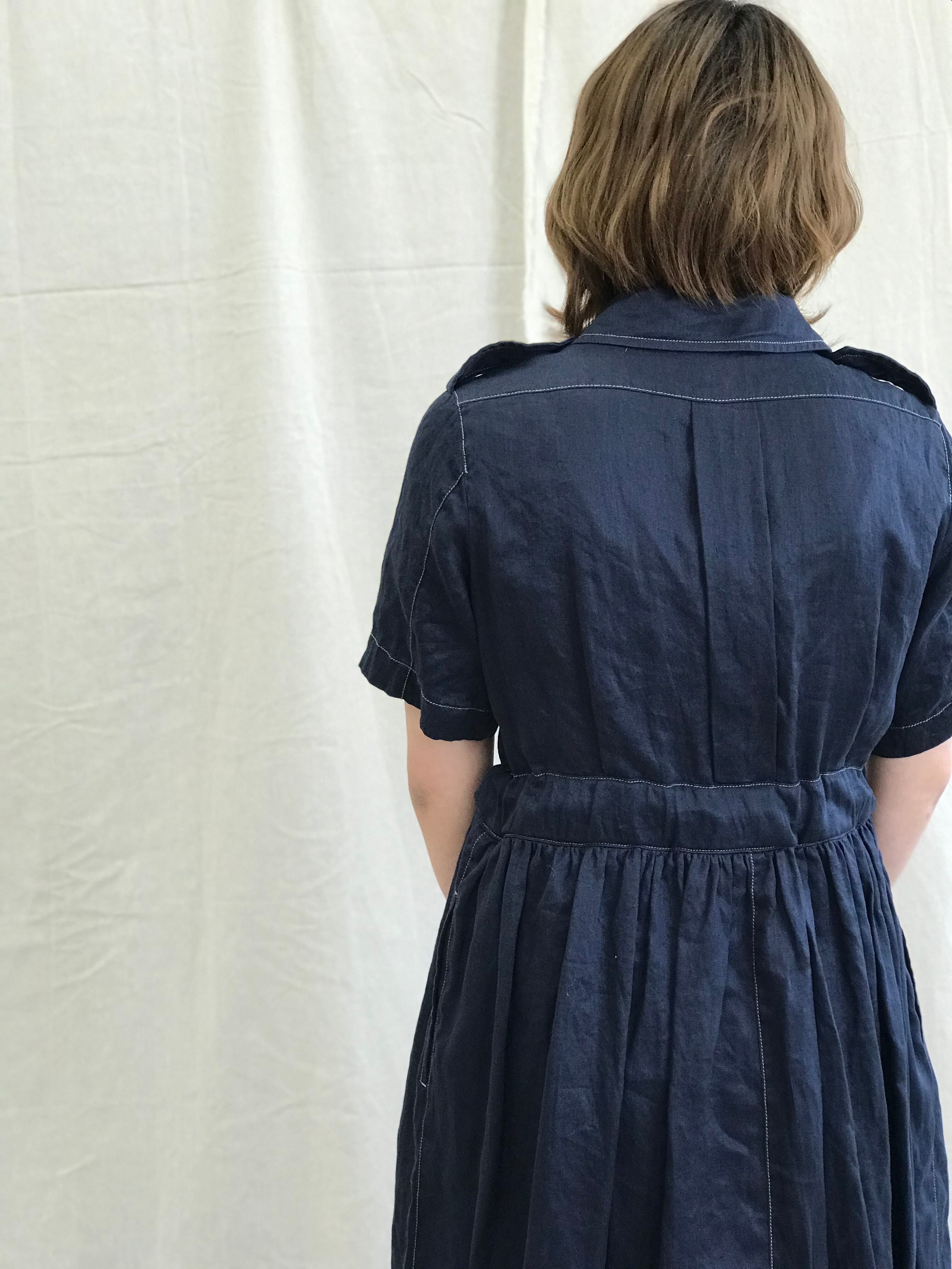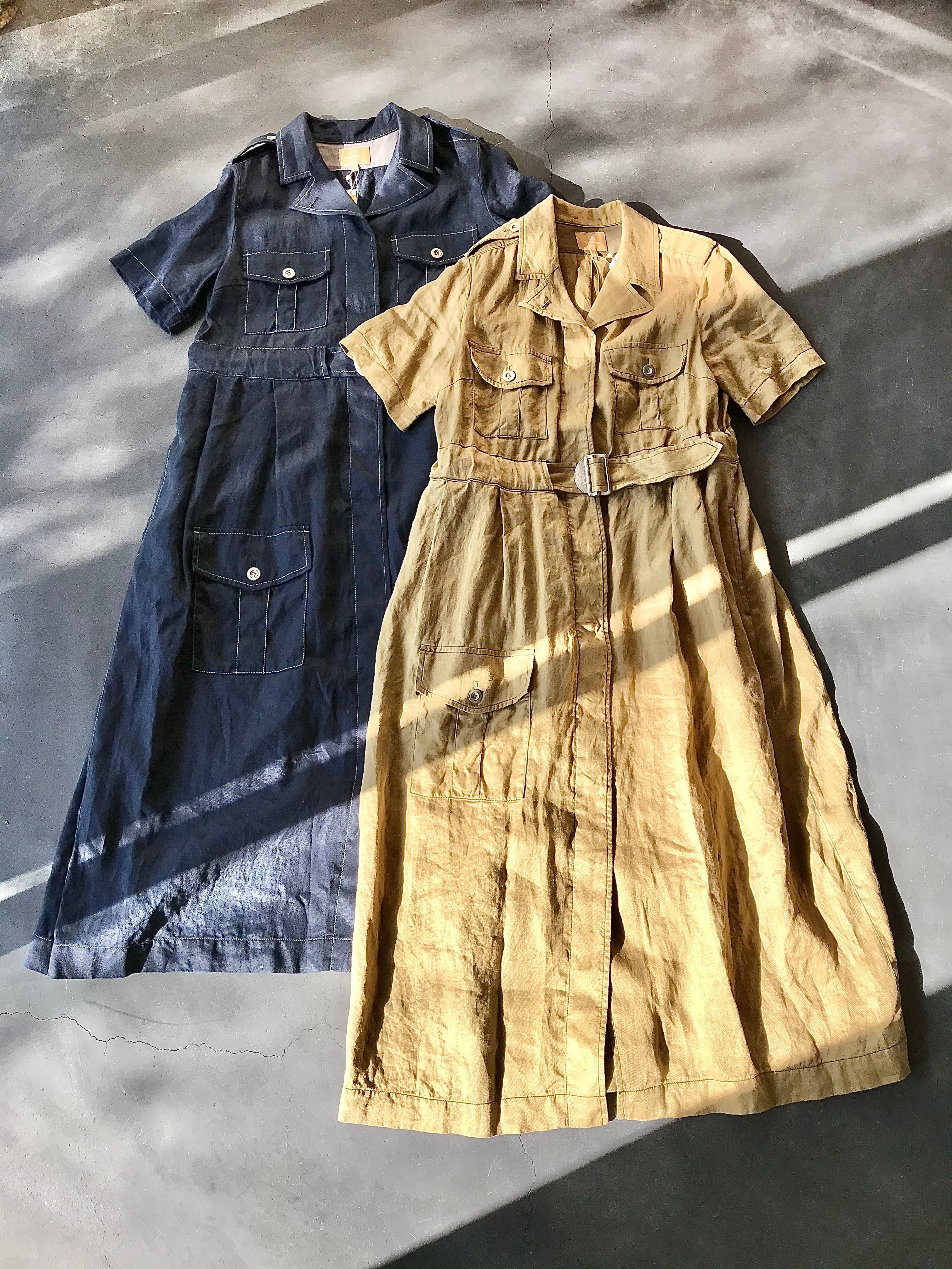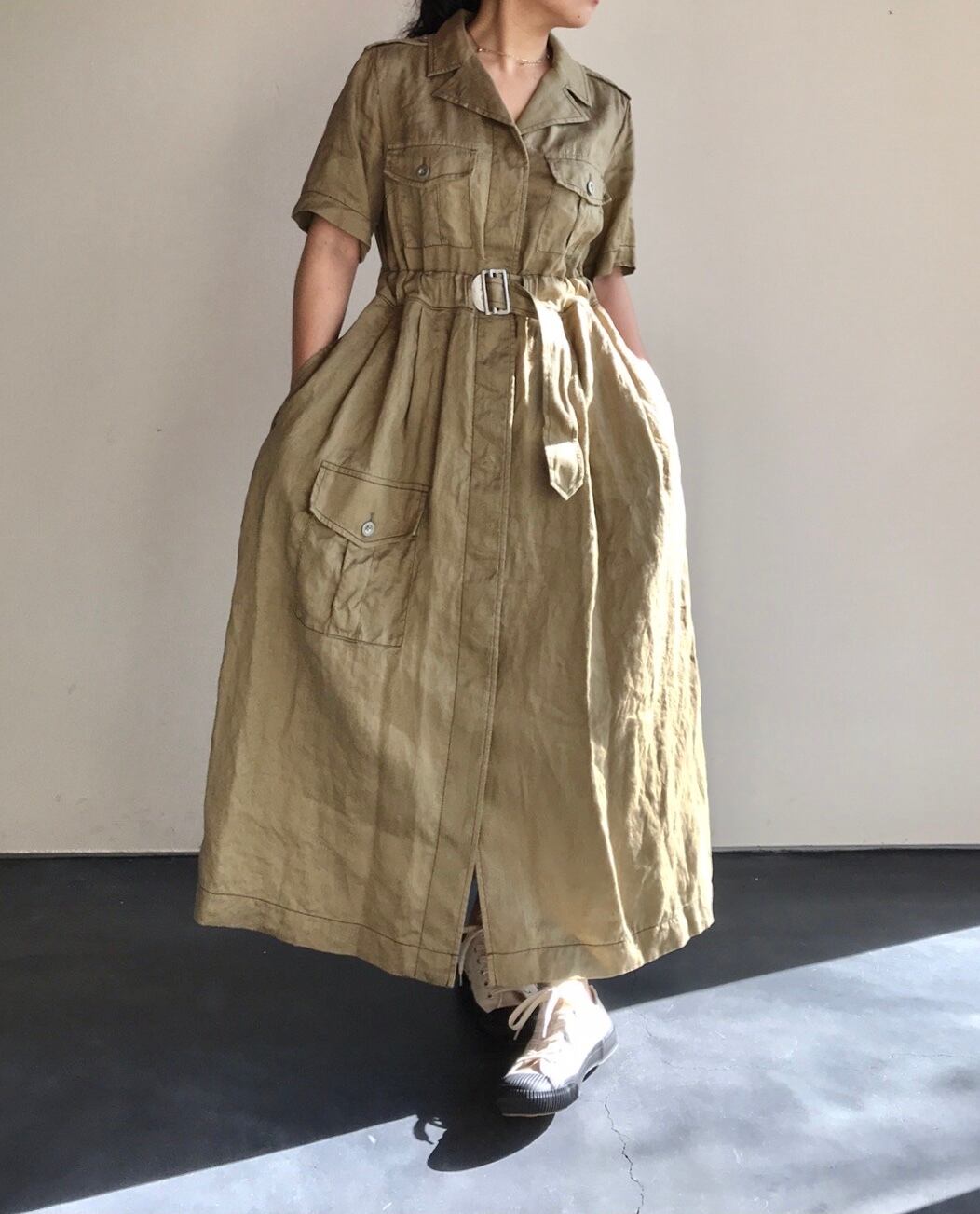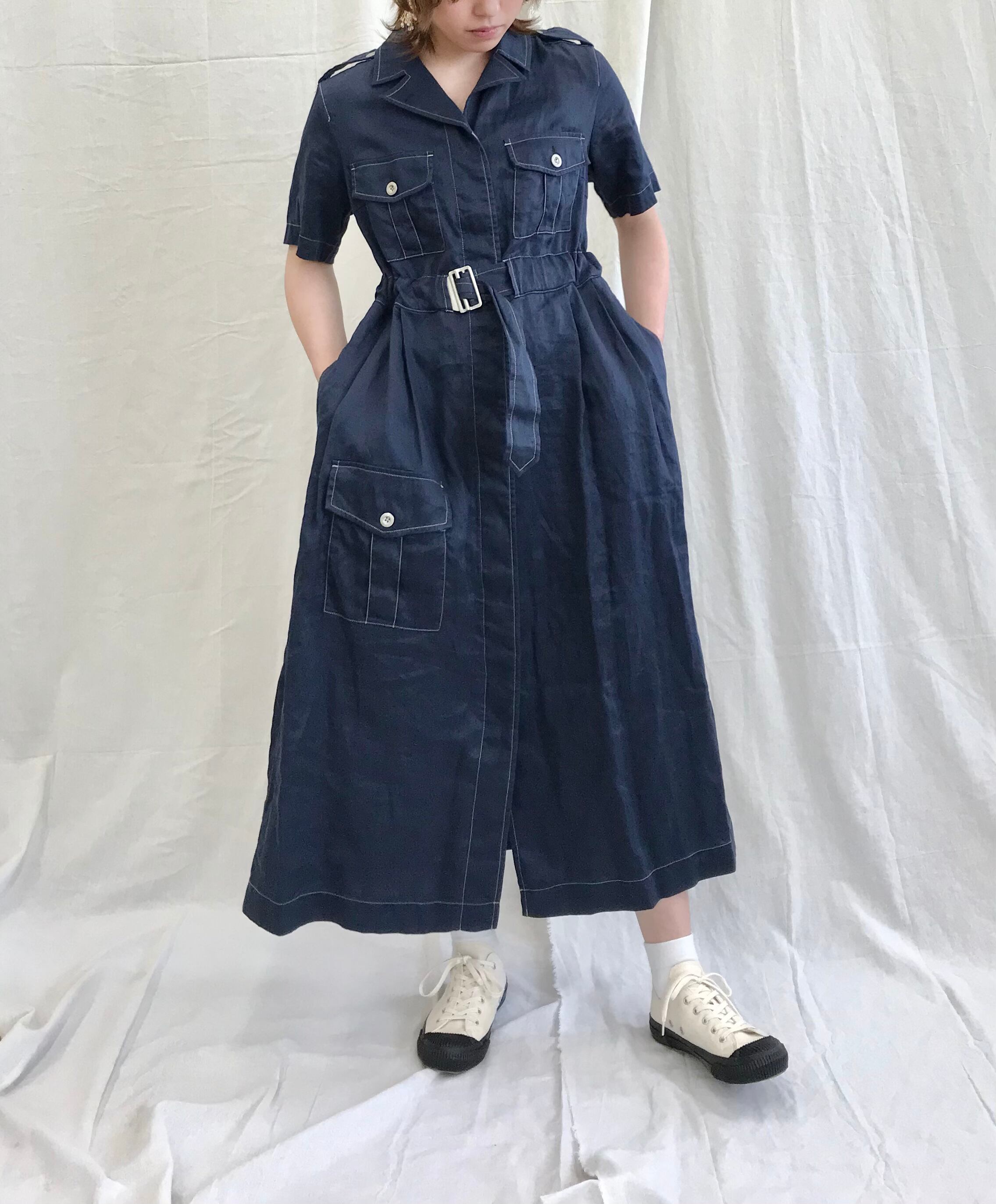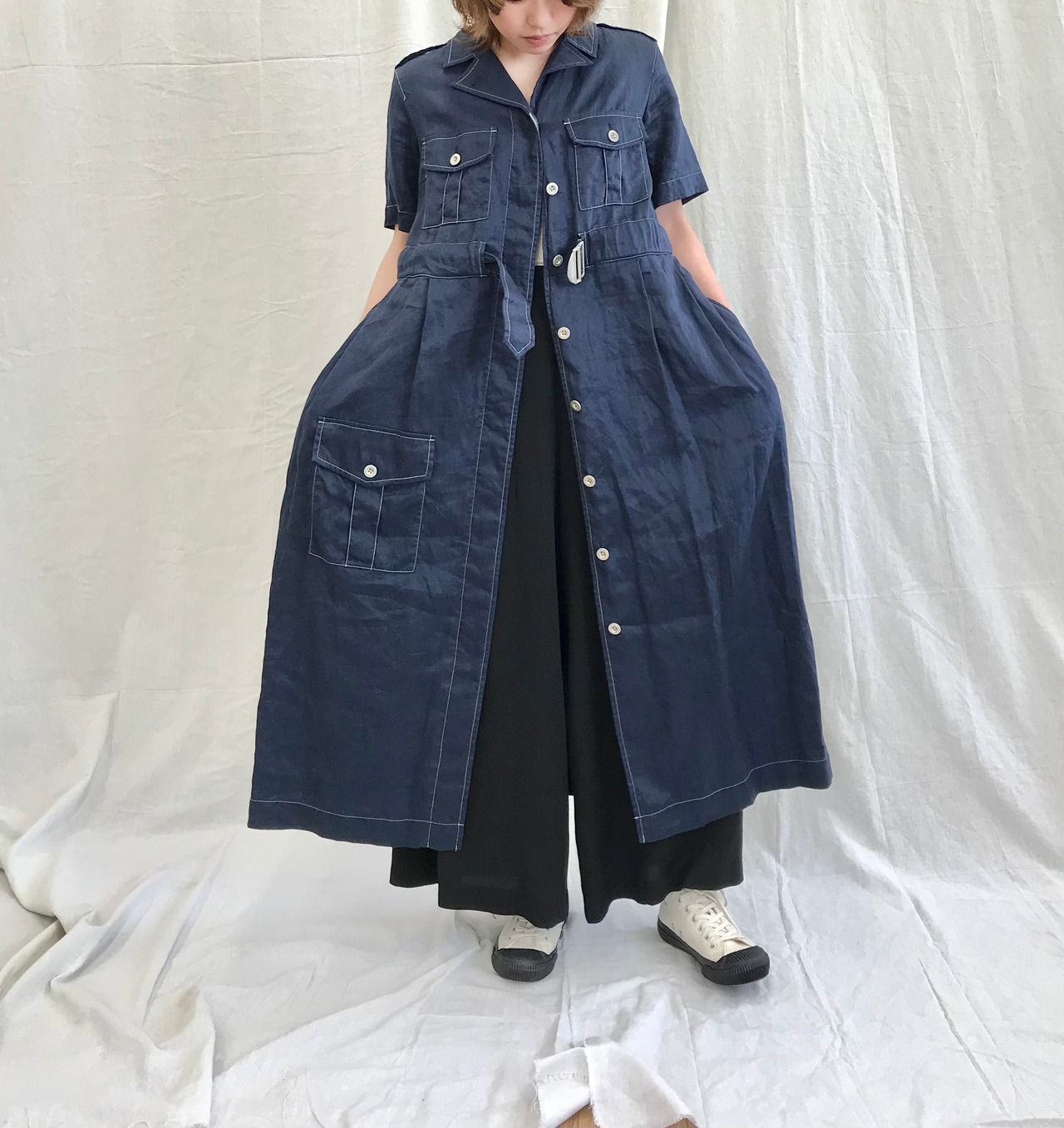 レーシングカーの整備士が着用していたジャンプスーツをデザインモチーフに、ワンピースにアレンジしました。ヴィンテージと同じ重厚感のある大きなバックルでウェストをぎゅっと絞ると素敵なシルエットに。前のボタンを外し、コートのようにルーズに羽織ることもできます。光沢感があるリネンツイル素材を使用しています。