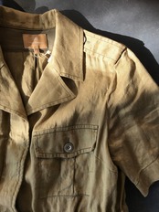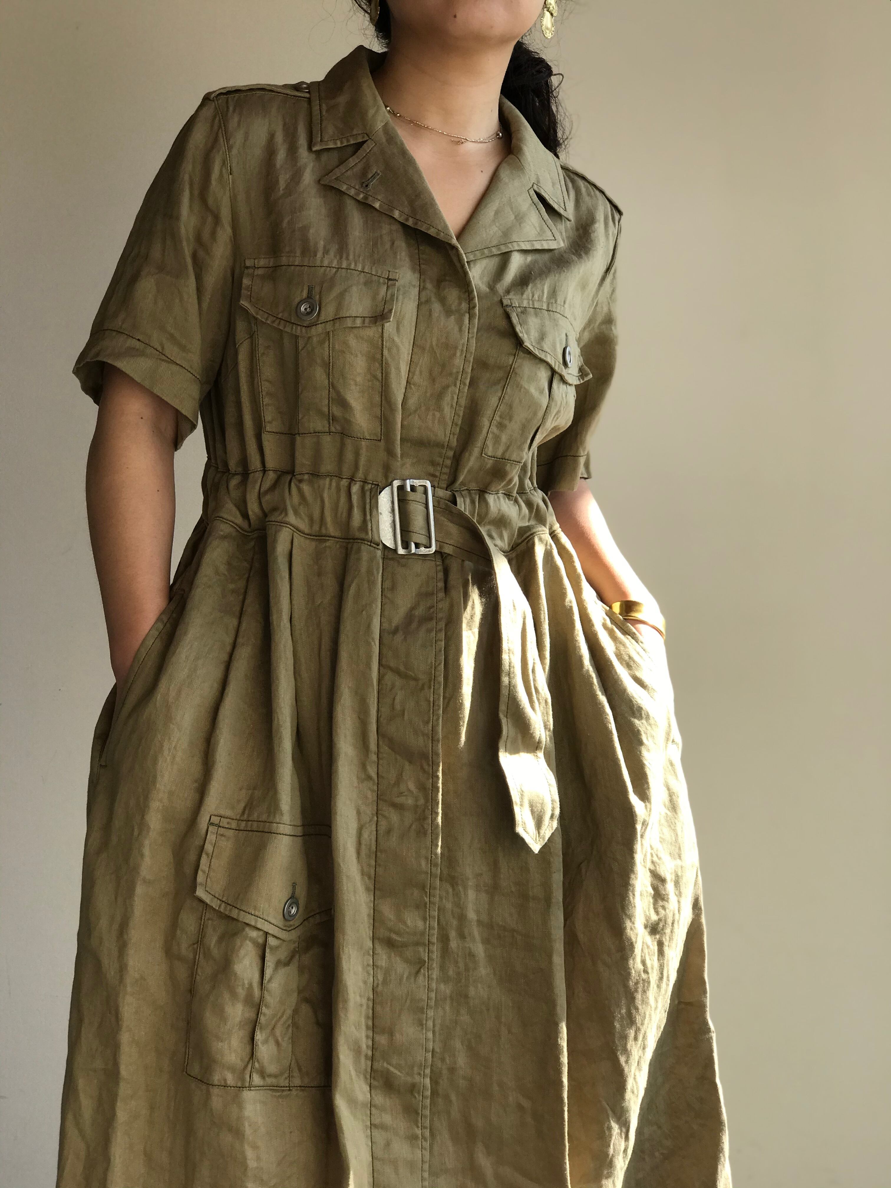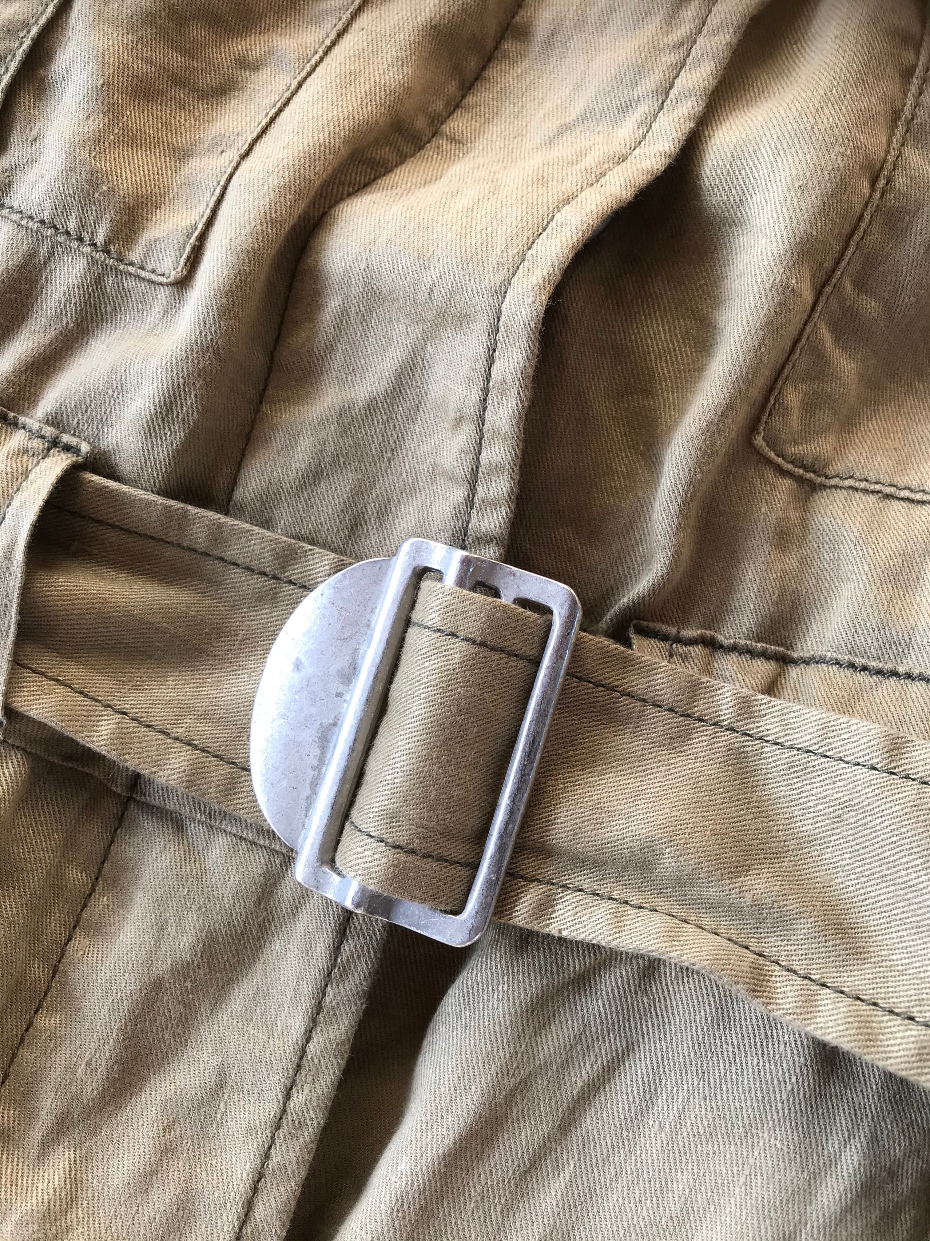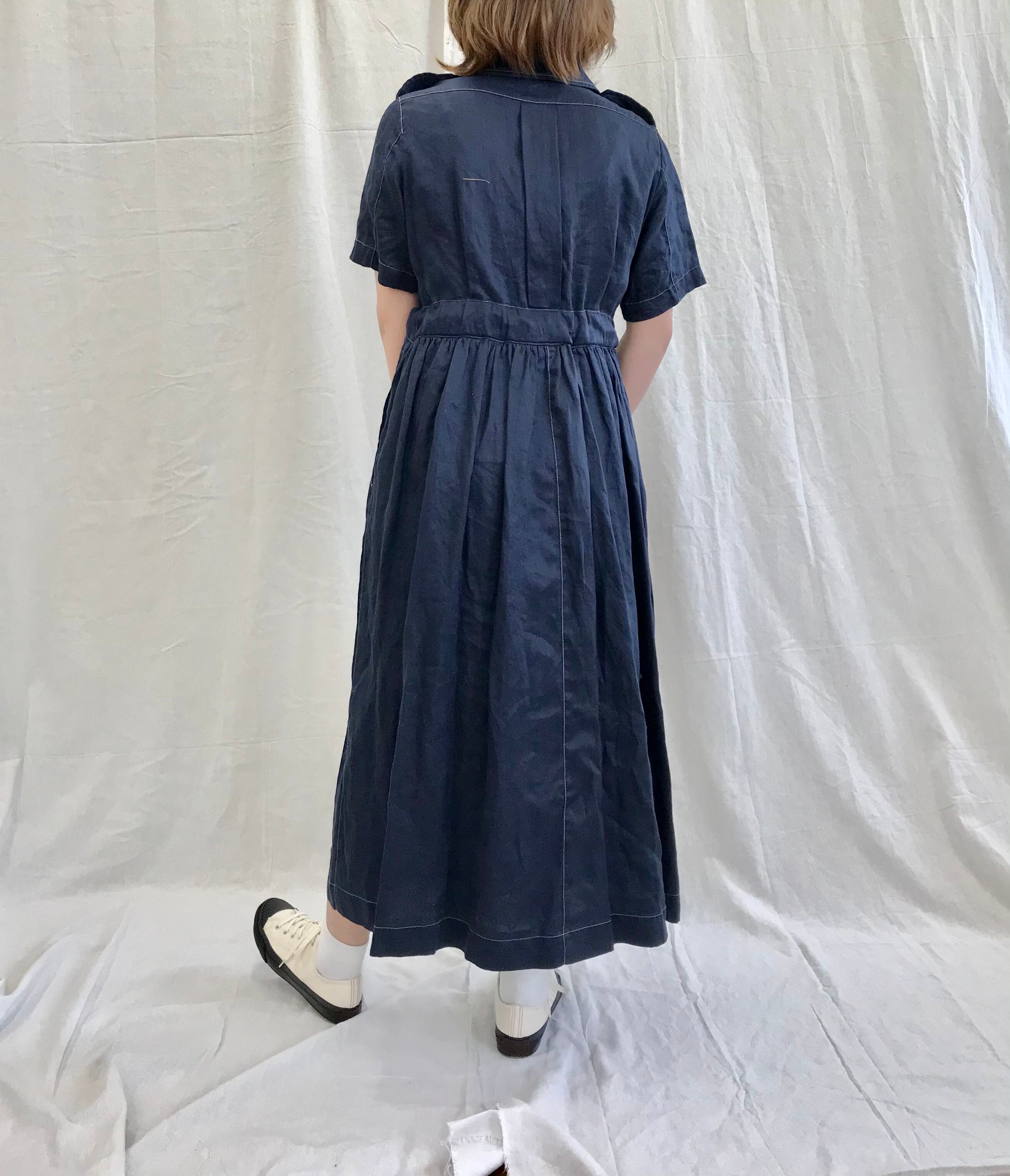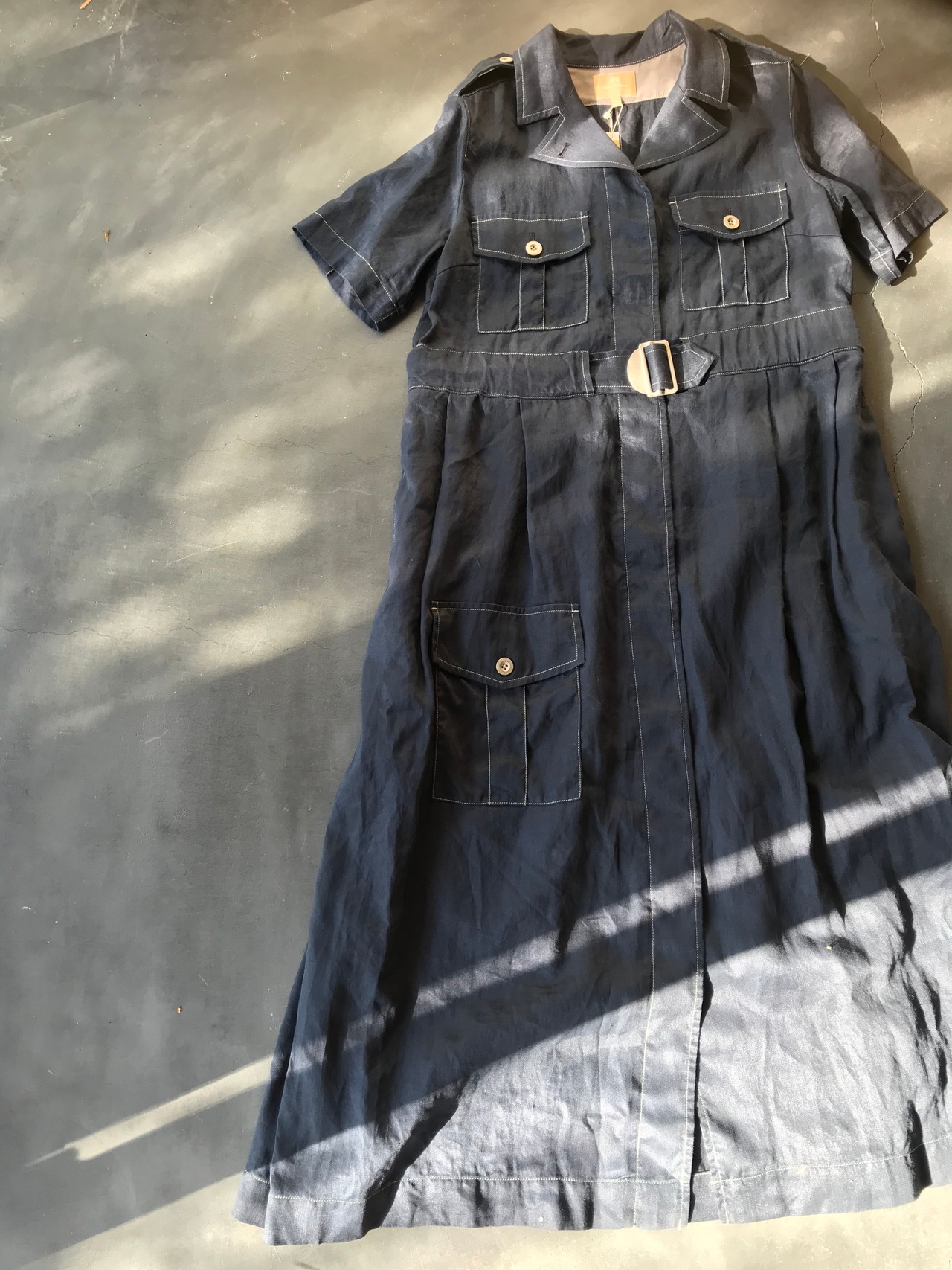レーシングカーの整備士が着用していたジャンプスーツをデザインモチーフに、ワンピースにアレンジしました。ヴィンテージと同じ重厚感のある大きなバックルでウェストをぎゅっと絞ると素敵なシルエットに。前のボタンを外し、コートのようにルーズに羽織ることもできます。光沢感があるリネンツイル素材を使用しています。