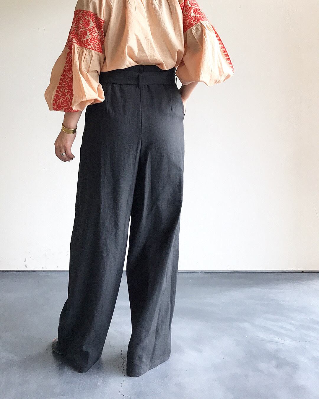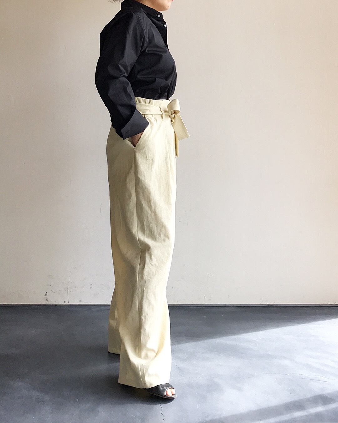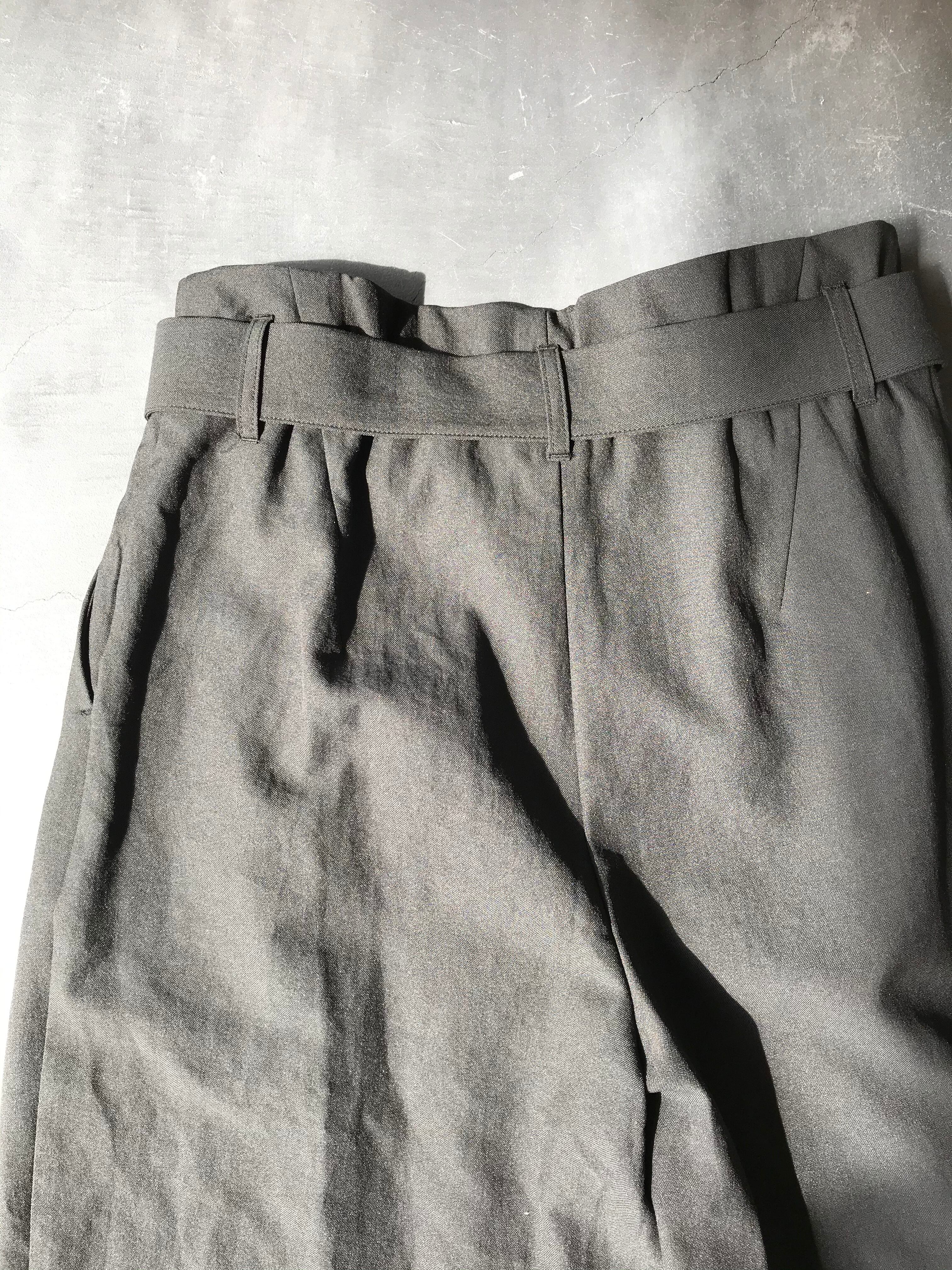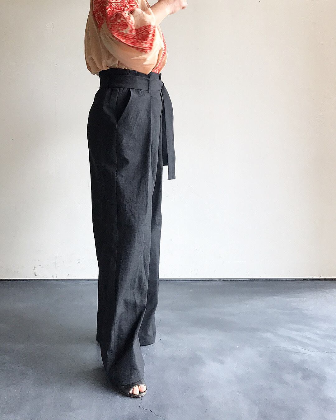 ウエストにリボンベルトが付属したタックパンツ。