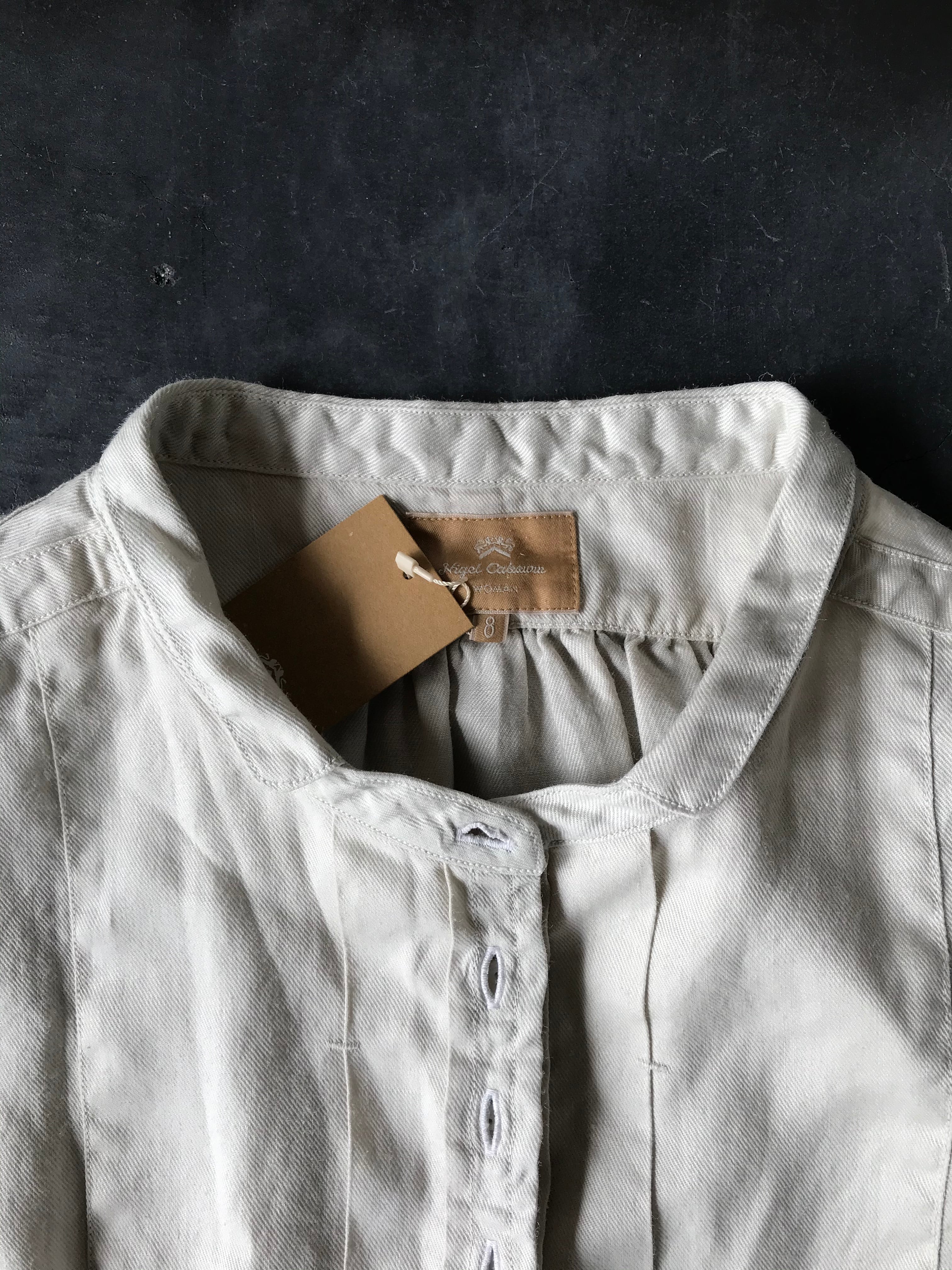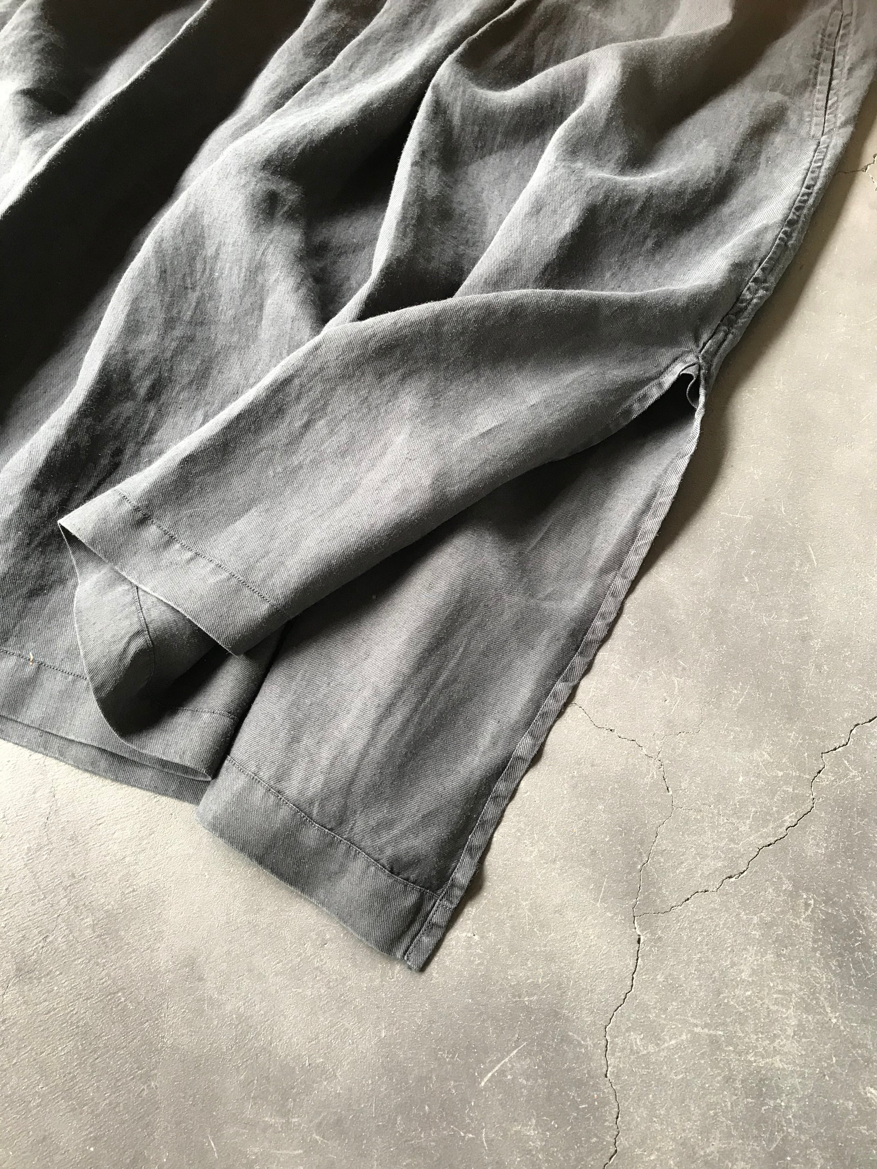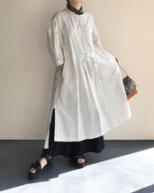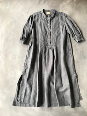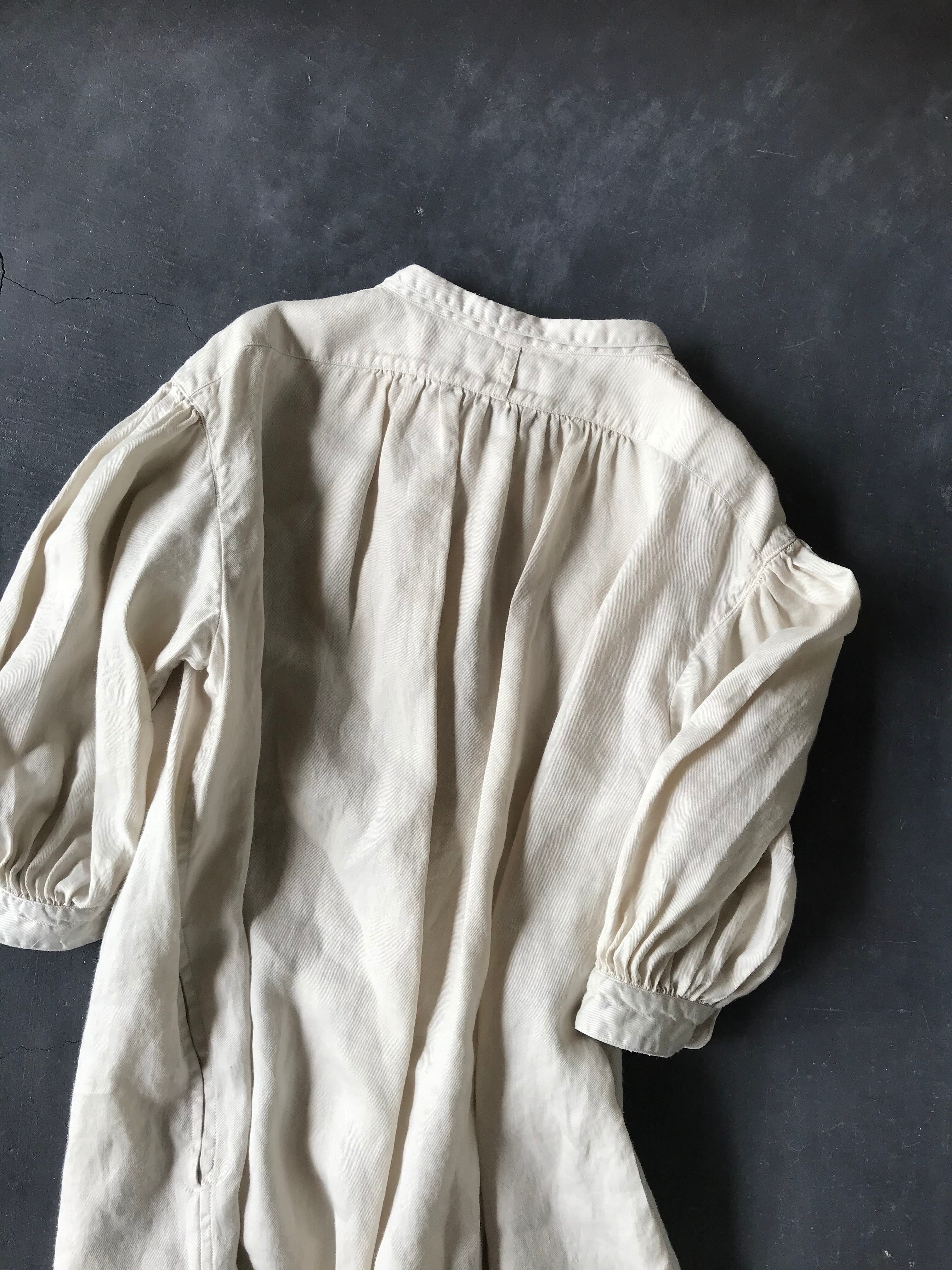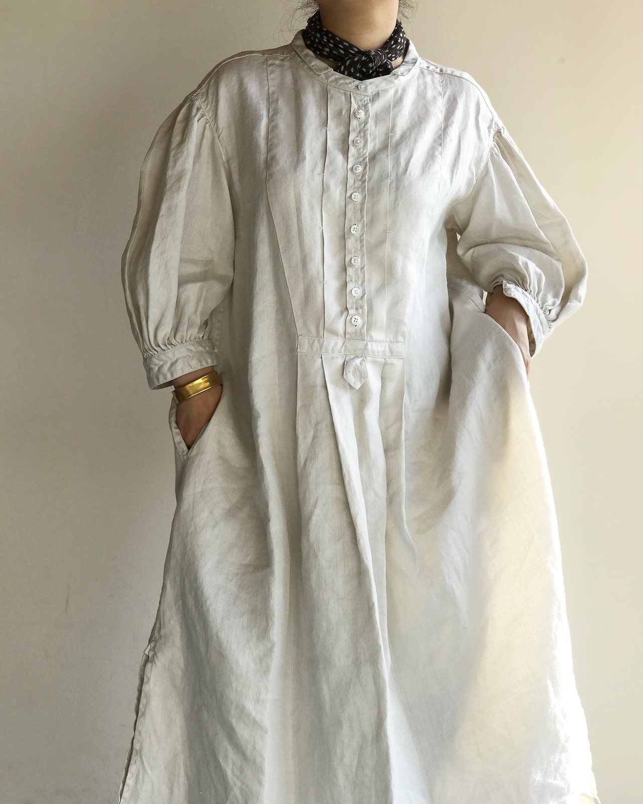 1930年代のスリープドレスをベースに、1920年代に見られるボリュームのある袖を取り入れたワンピースです。一枚でさらりと来ても雰囲気がでる一着です。光沢とハリが特徴の綾織のラミー素材を使い、ヴィンテージ感のある出すティーホワイトとダークネイビーの2色に染め上げました。