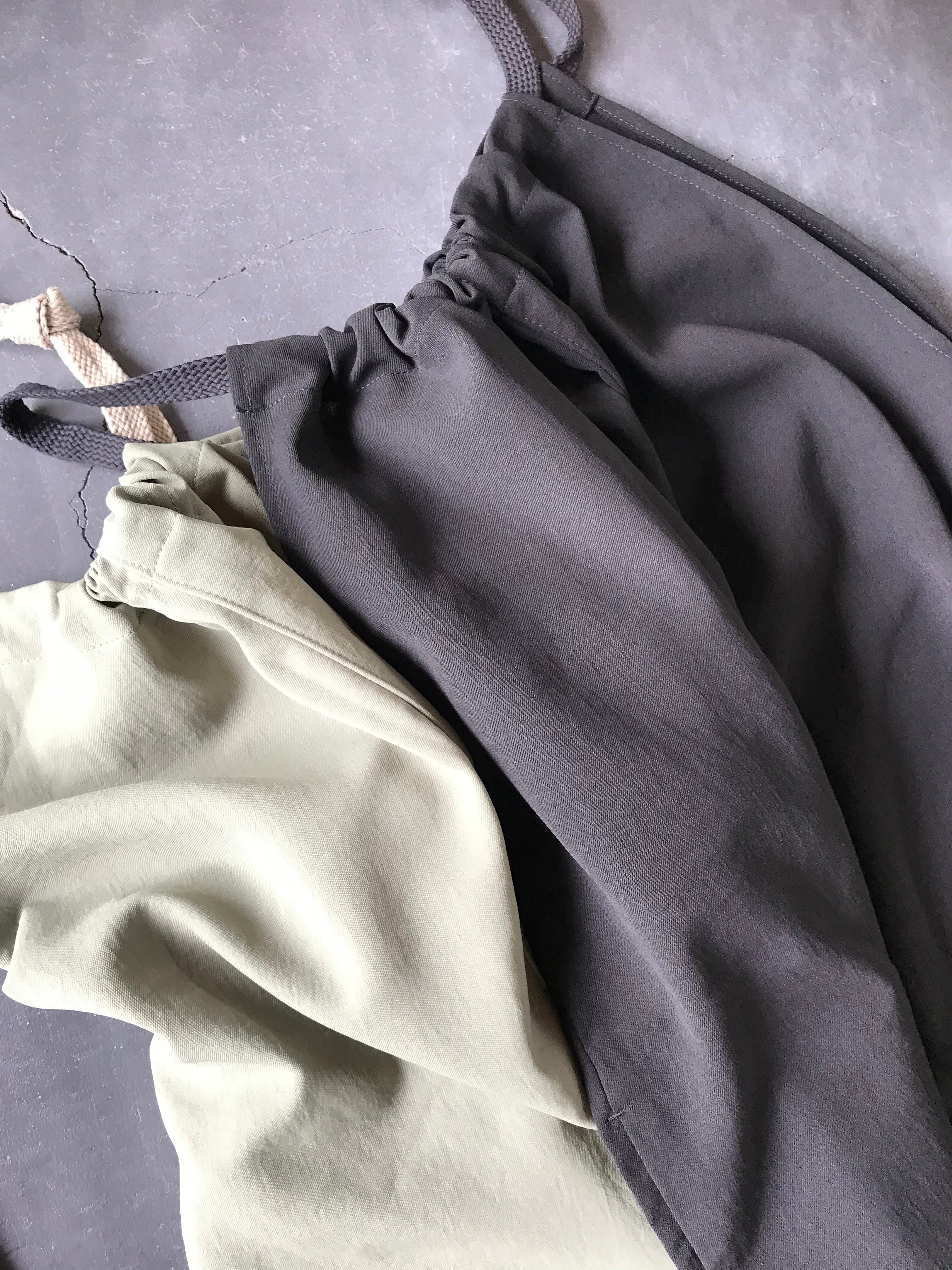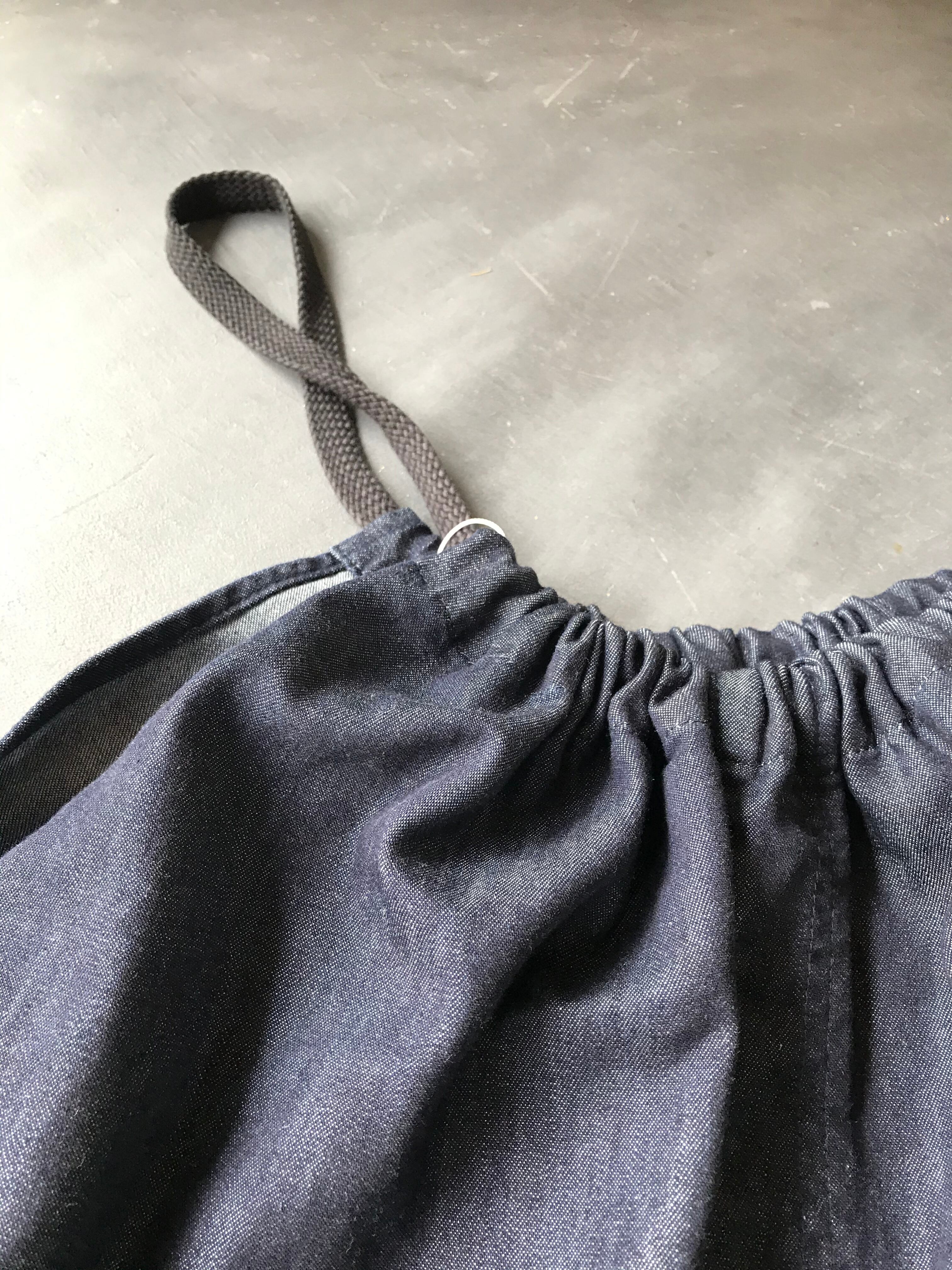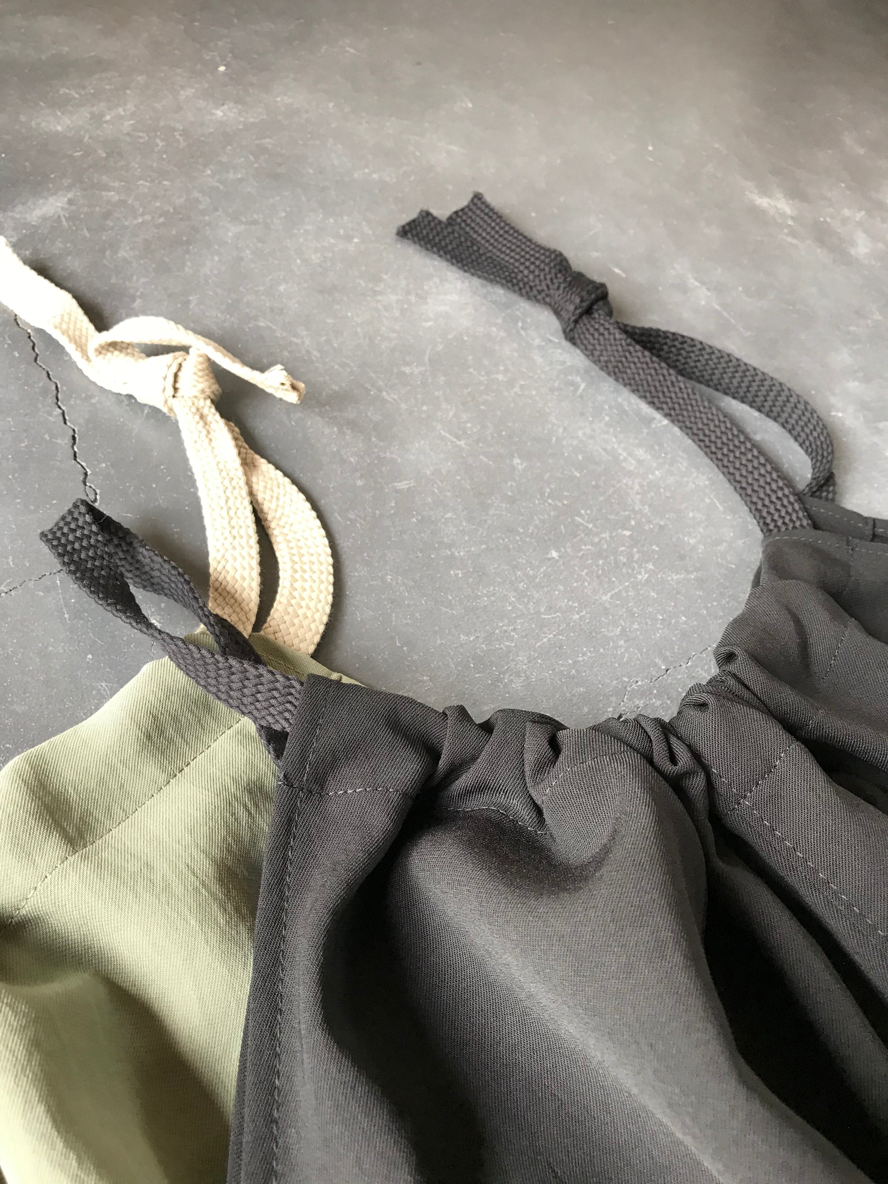 巾着袋のように左右のひもを絞り、それを肩ひもにして着用頂けます。