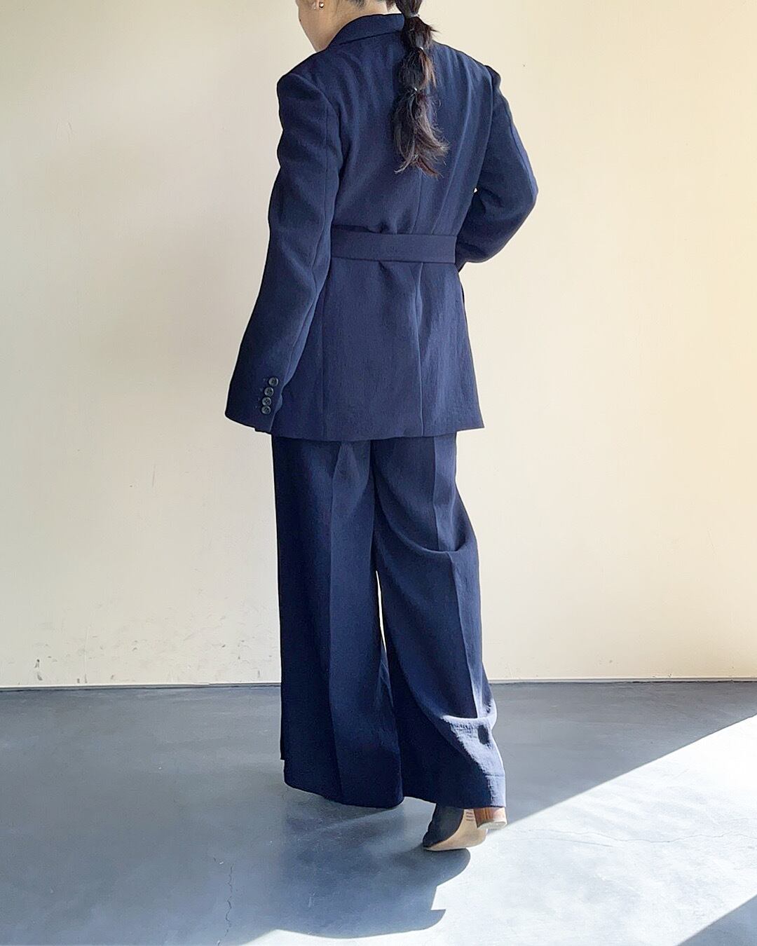 ウエストのベルトをギュッと締めると、女性らしい着こなしが可能です。