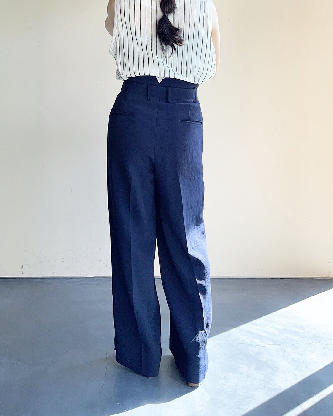 裾サイドのスリット、ウエストの同素材ボタンベルトがアクセント。