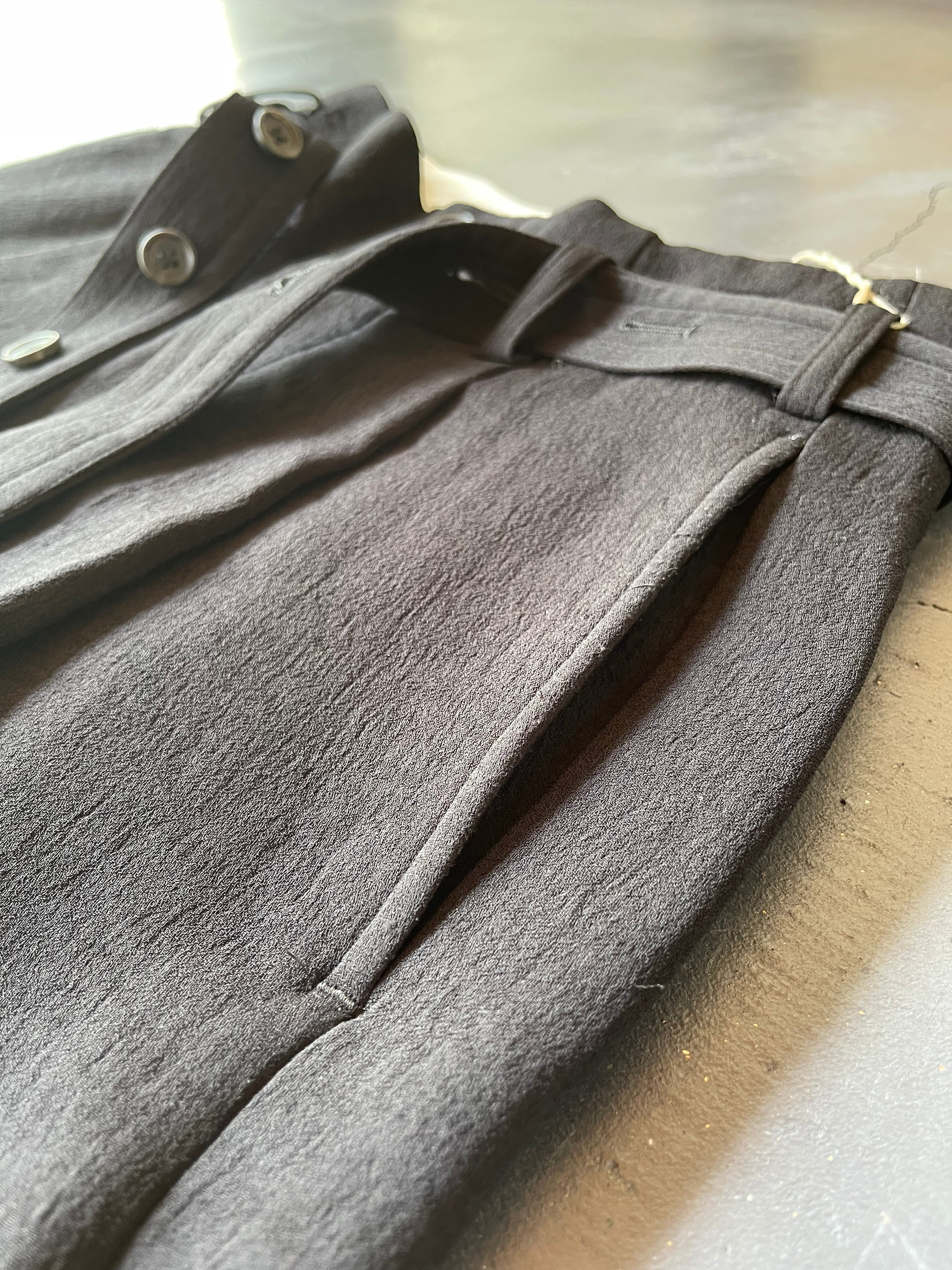 ダブルジョーゼットをヴィンテージフィニッシュで仕上げた素材を使用したバギーパンツです。