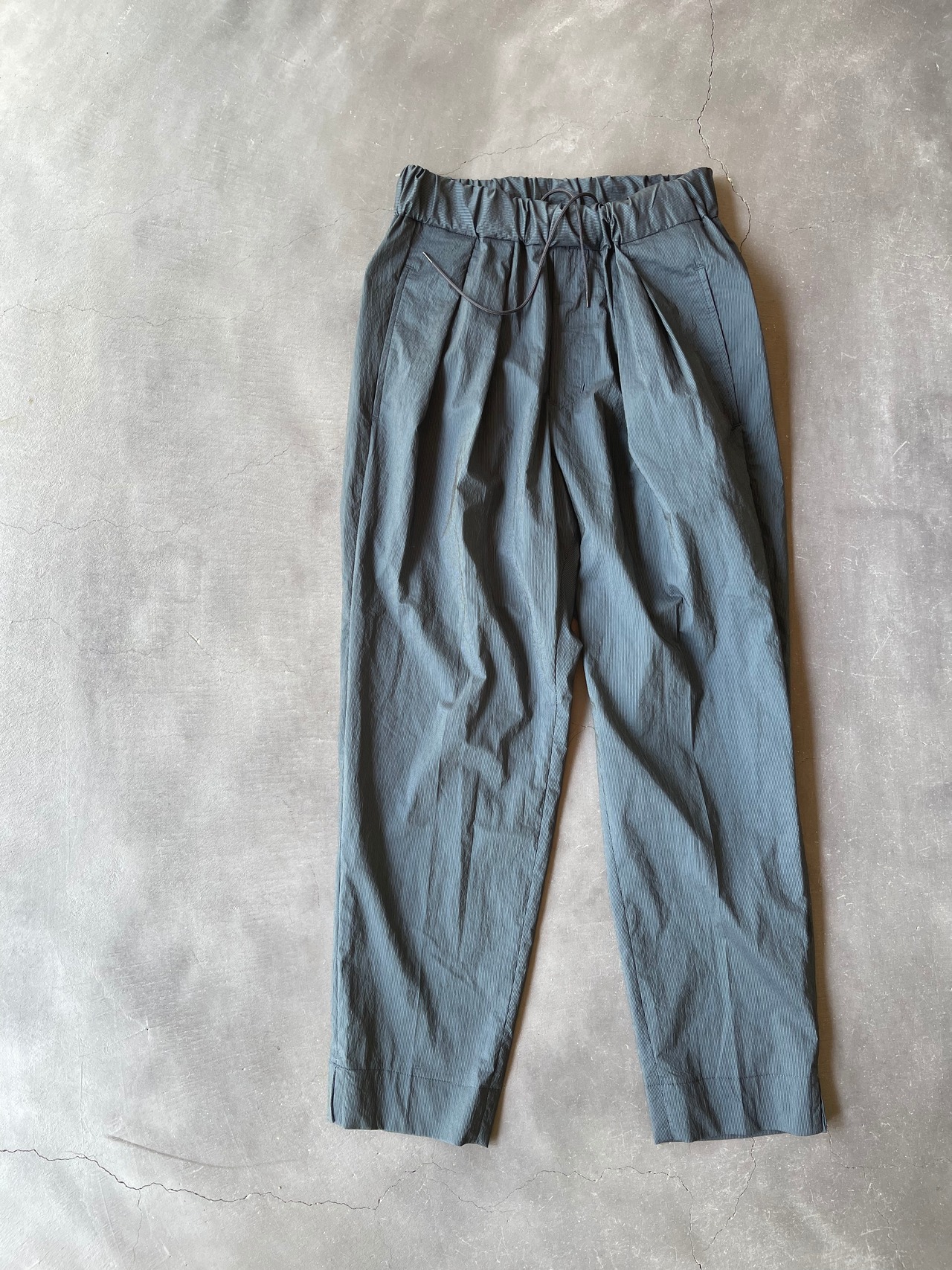 ストライプナイロンシャンブレーのテーパードイージーパンツ。