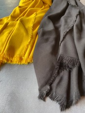 20/1のレーヨン100%の綾織ビエラの生地を整品染めしてコシを抜き、ドレープ性をもったふんわりとした柔らかなタッチに仕上げたストールです。
