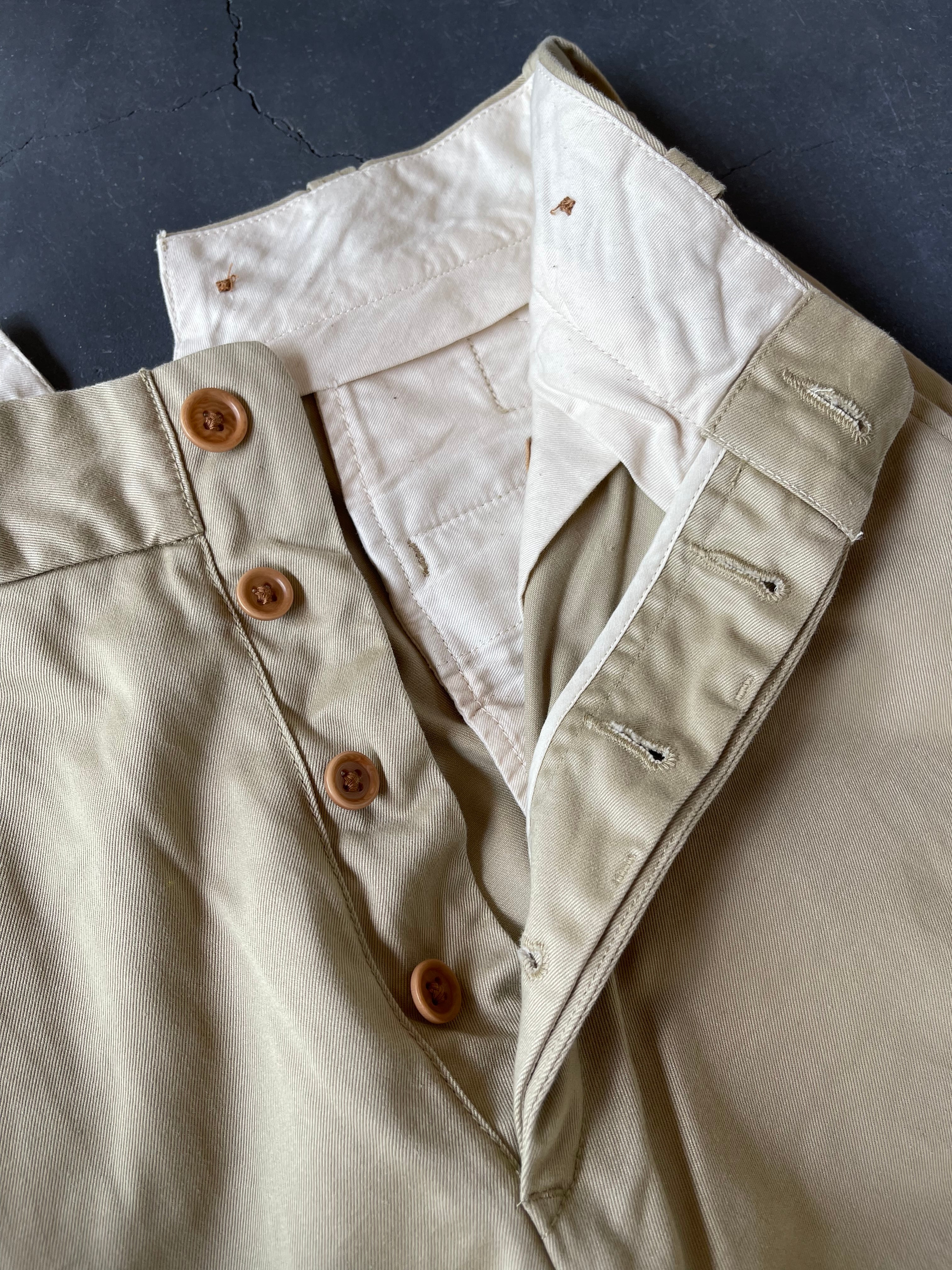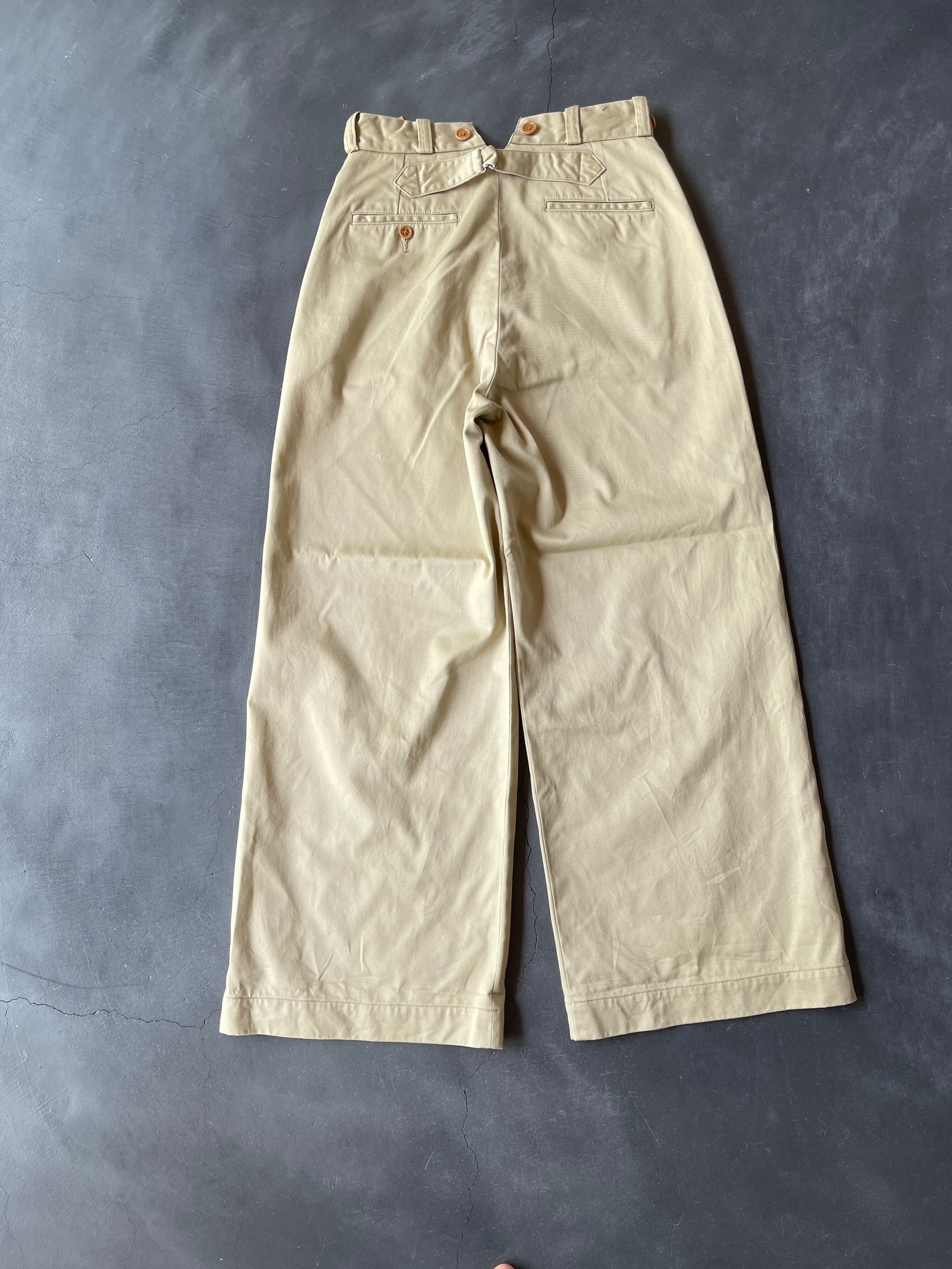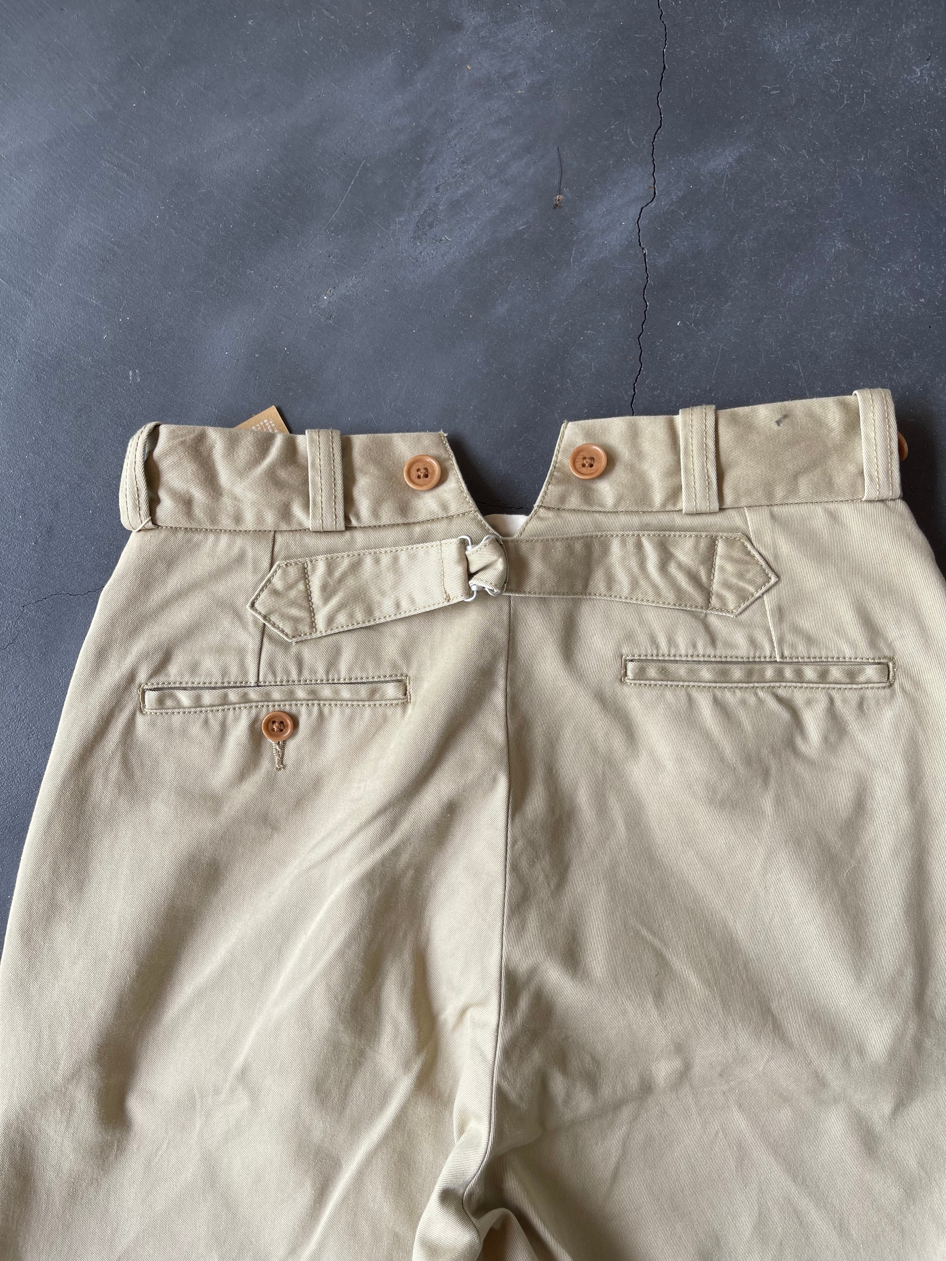 ヴィンテージのディティールを再現し、ウェストにはサスペンダーボタンとベルトループが配されています。