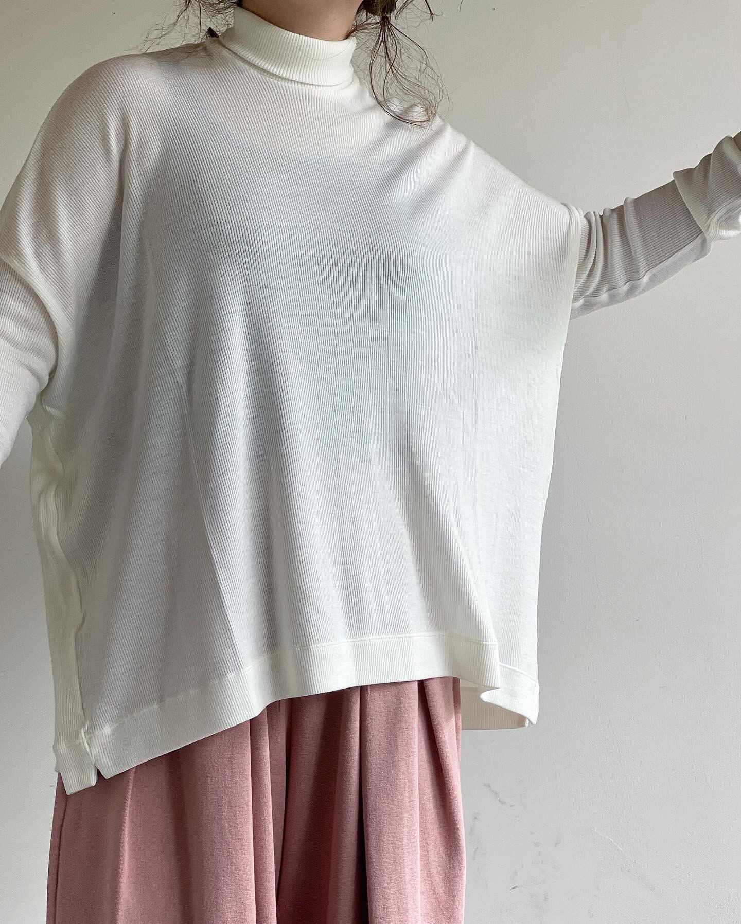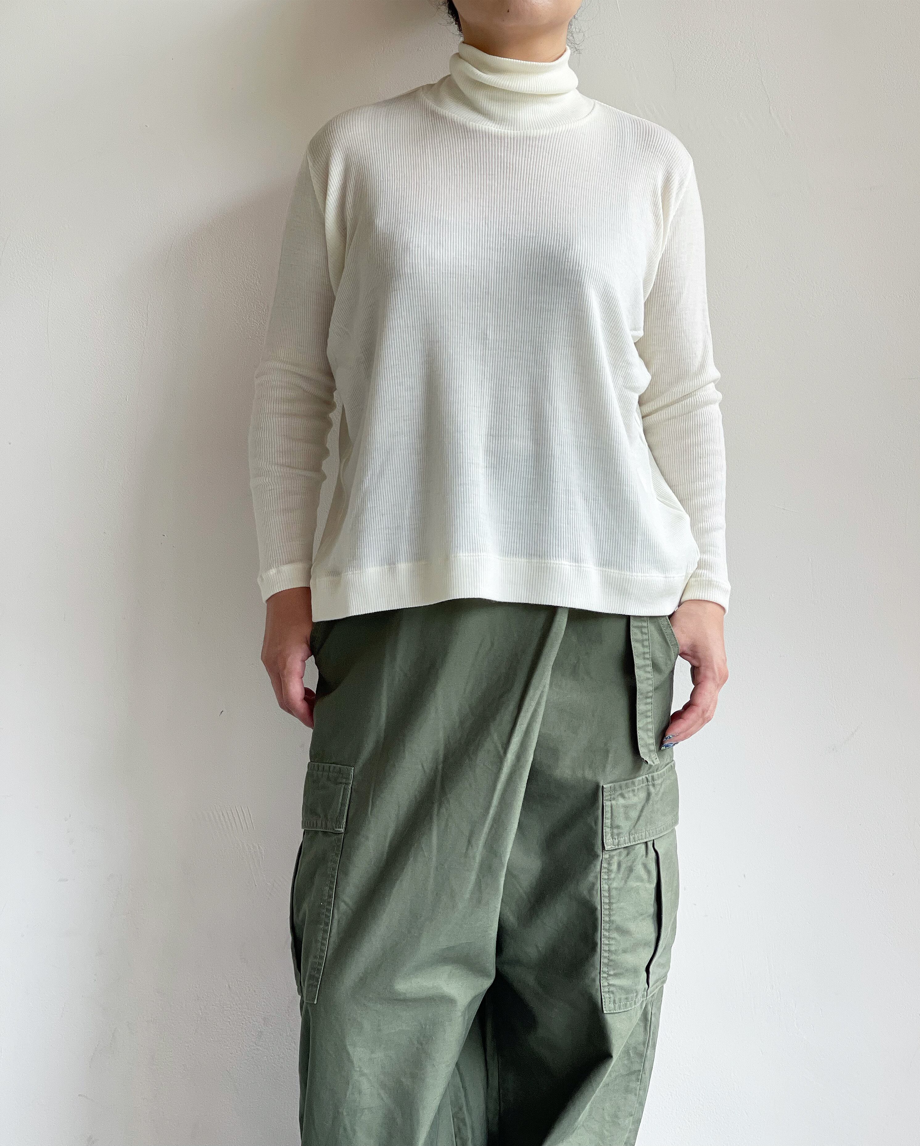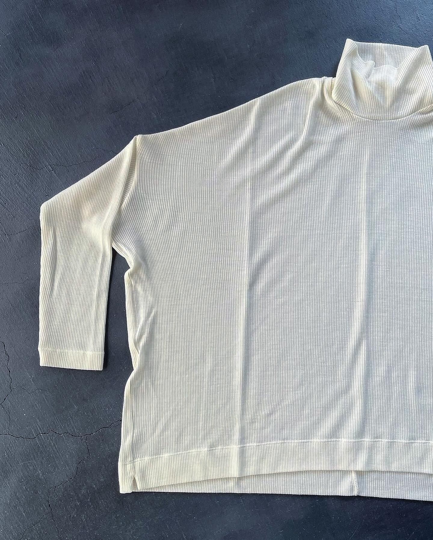 細番手の72番双糸の梳毛で編まれたテレコのタートルネック。