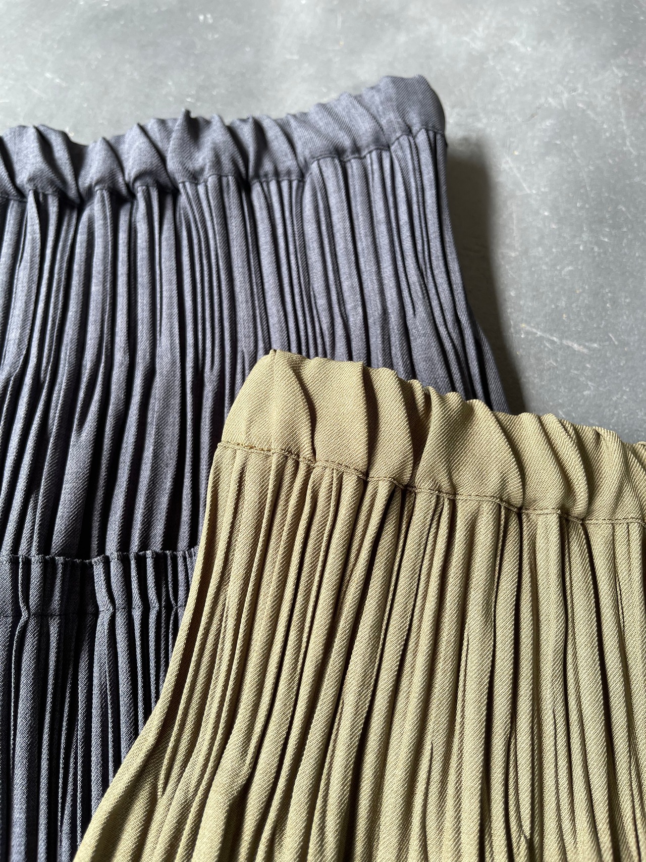 コットンライクなポリエステル素材を使用し、半永久的にクラッシュプリーツ加工を施しました。