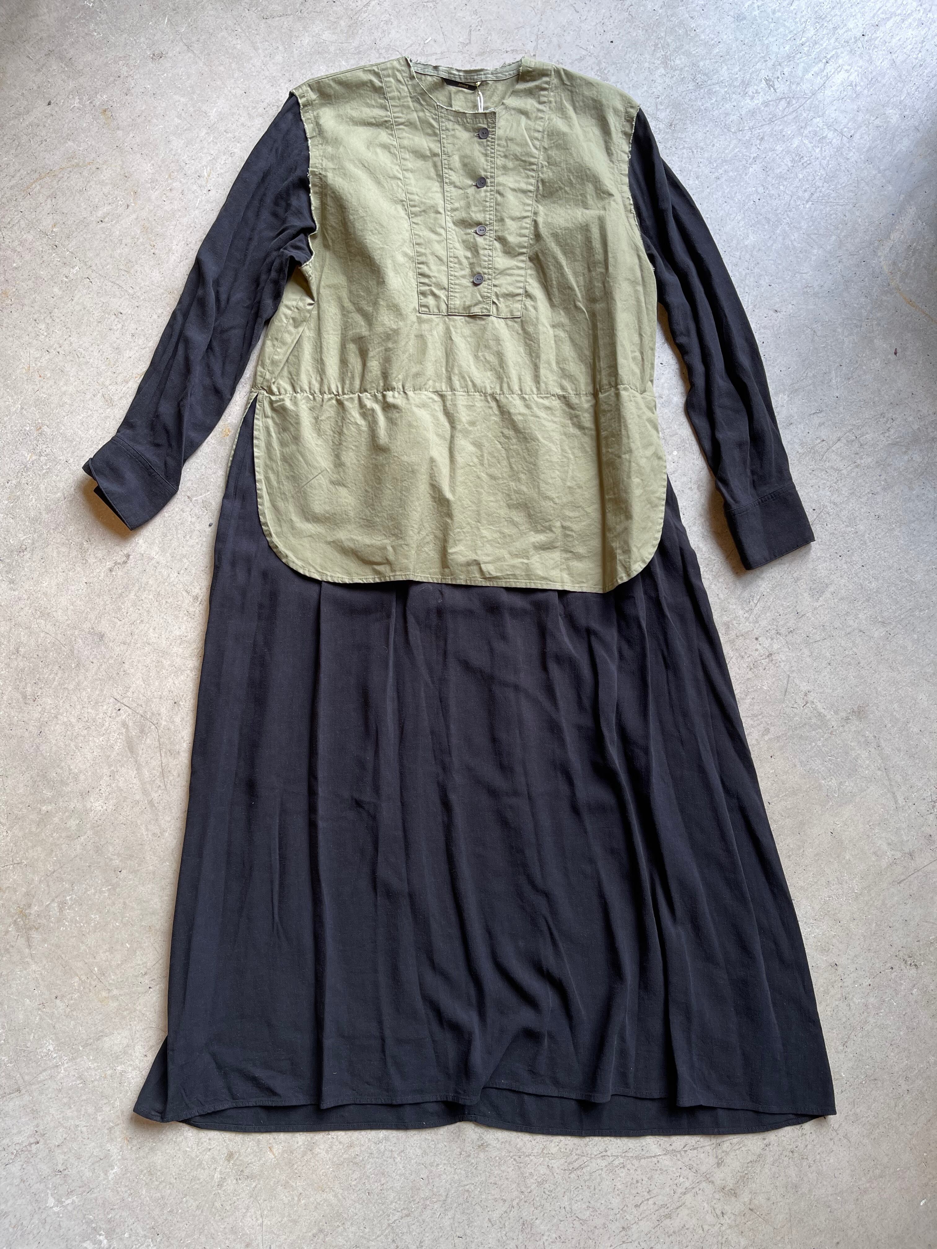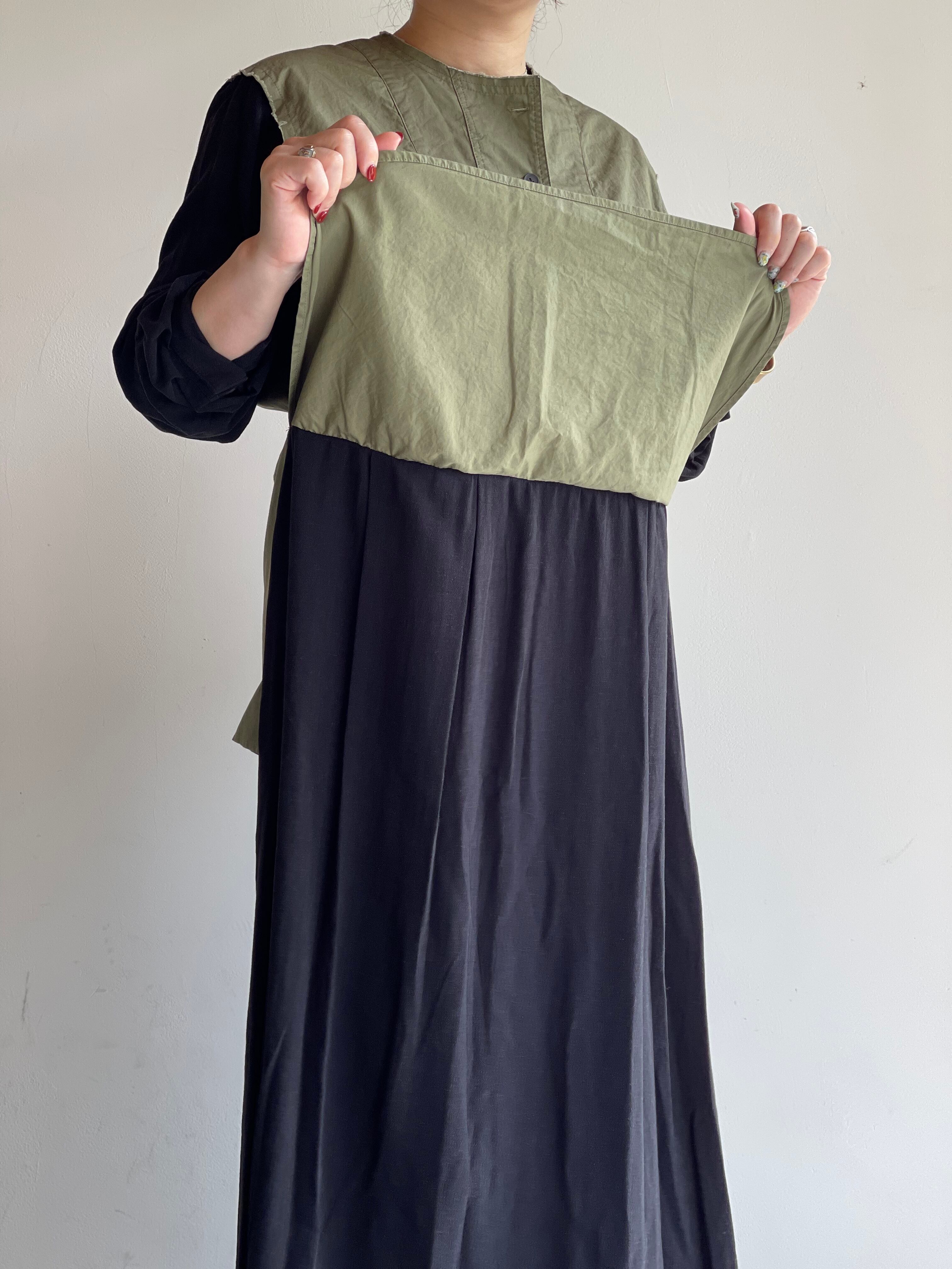 ブラウス生地とミリタリー生地をドッキングさせたようなデザインがポイントのワンピース。