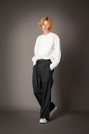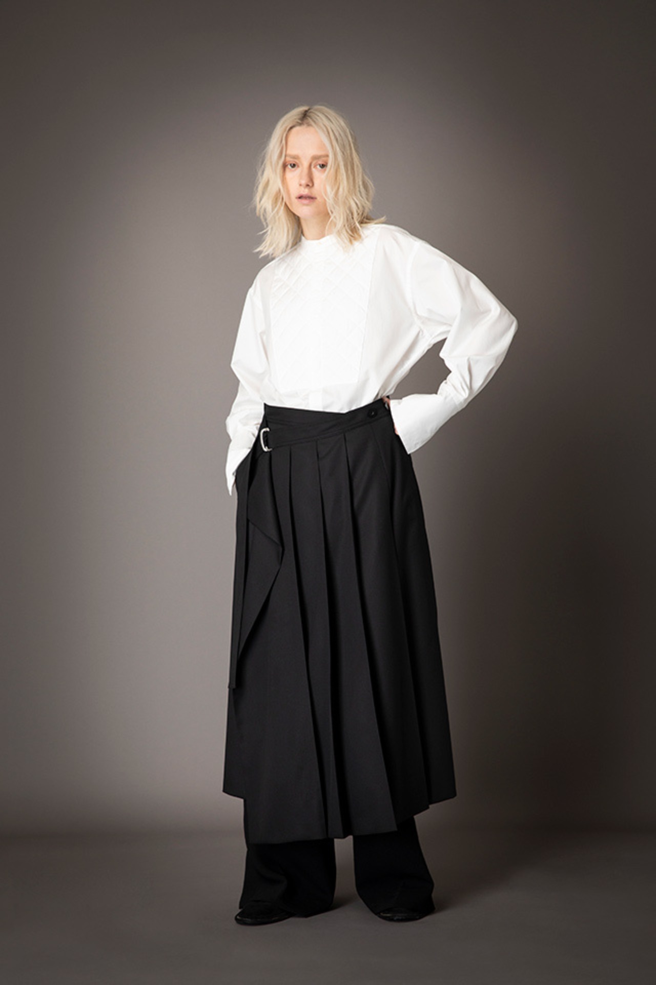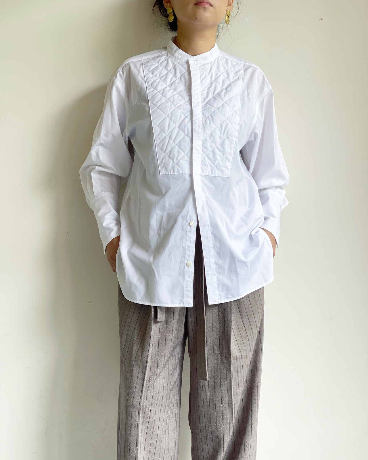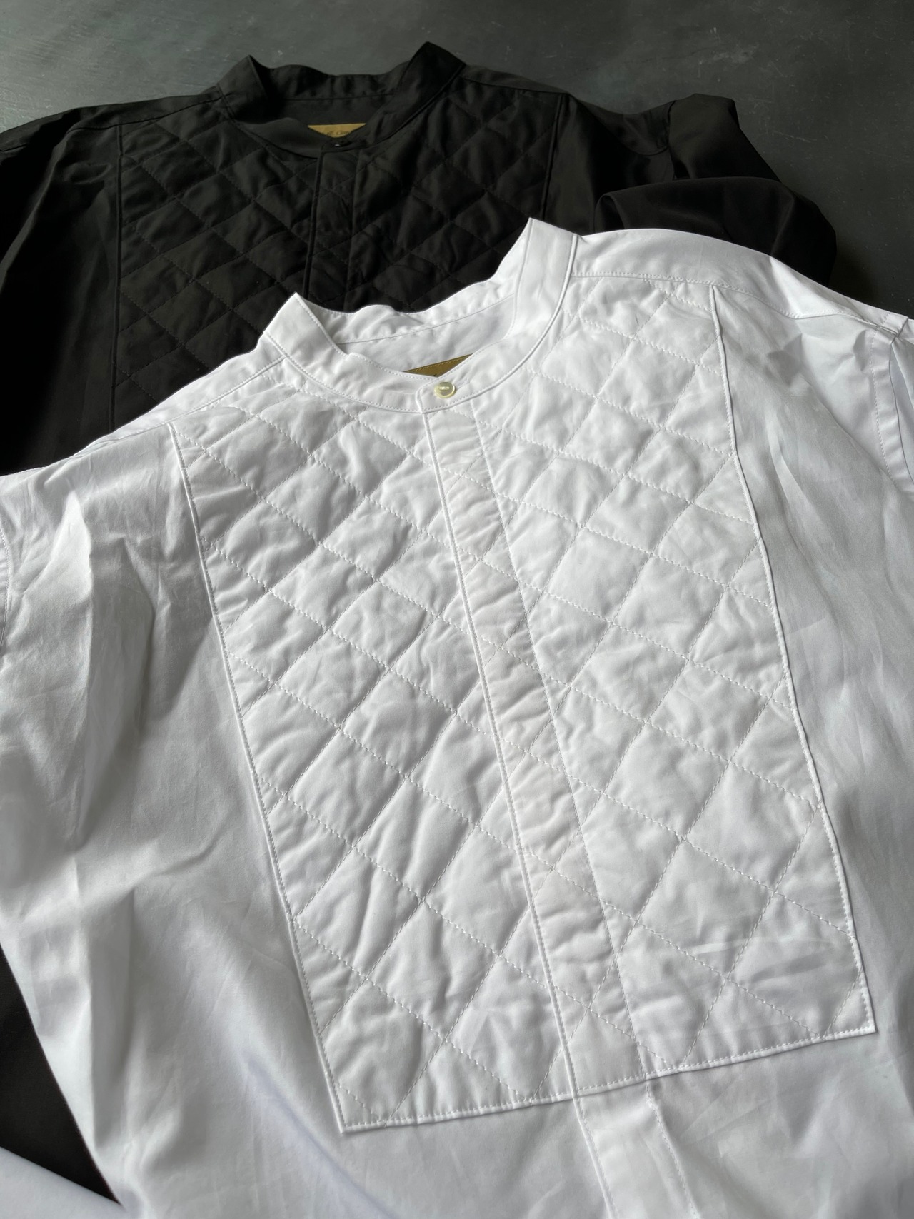 胸当てキルティングと長めのカフスがアクセントになっています。