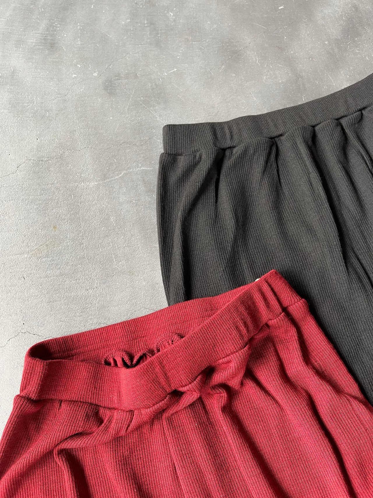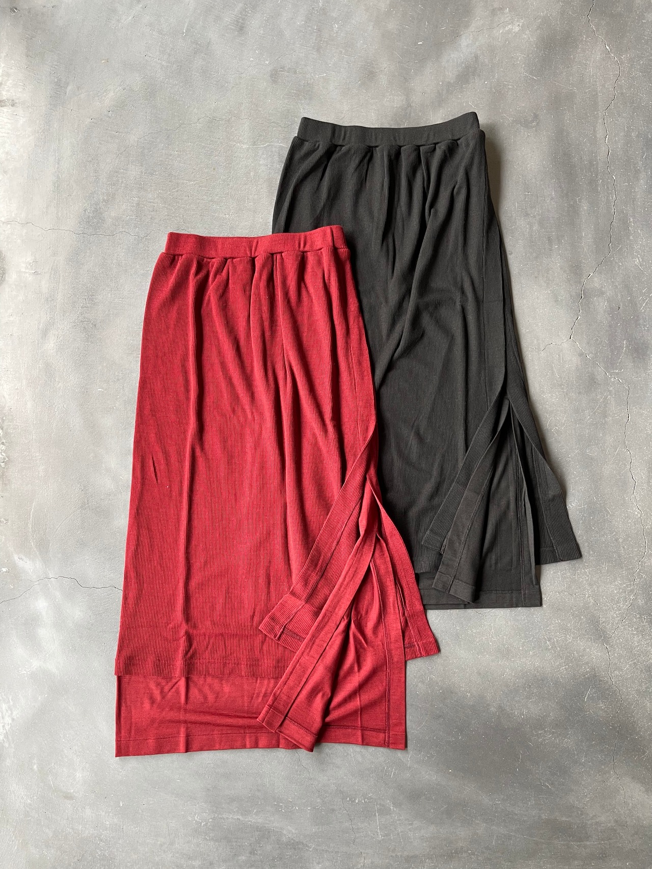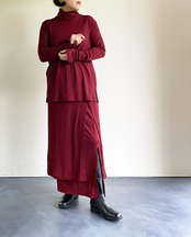 2/72細番手ウール糸で毛羽立ちなく、柔らかで膨らみのあるウール本来の良さを生かして編まれた肌触りの良いテレコ+天竺2種の編み地を組み合わせてデザインされた、モイスチャーな質感が醸し出す高級感が特徴の二重タイトスカート。