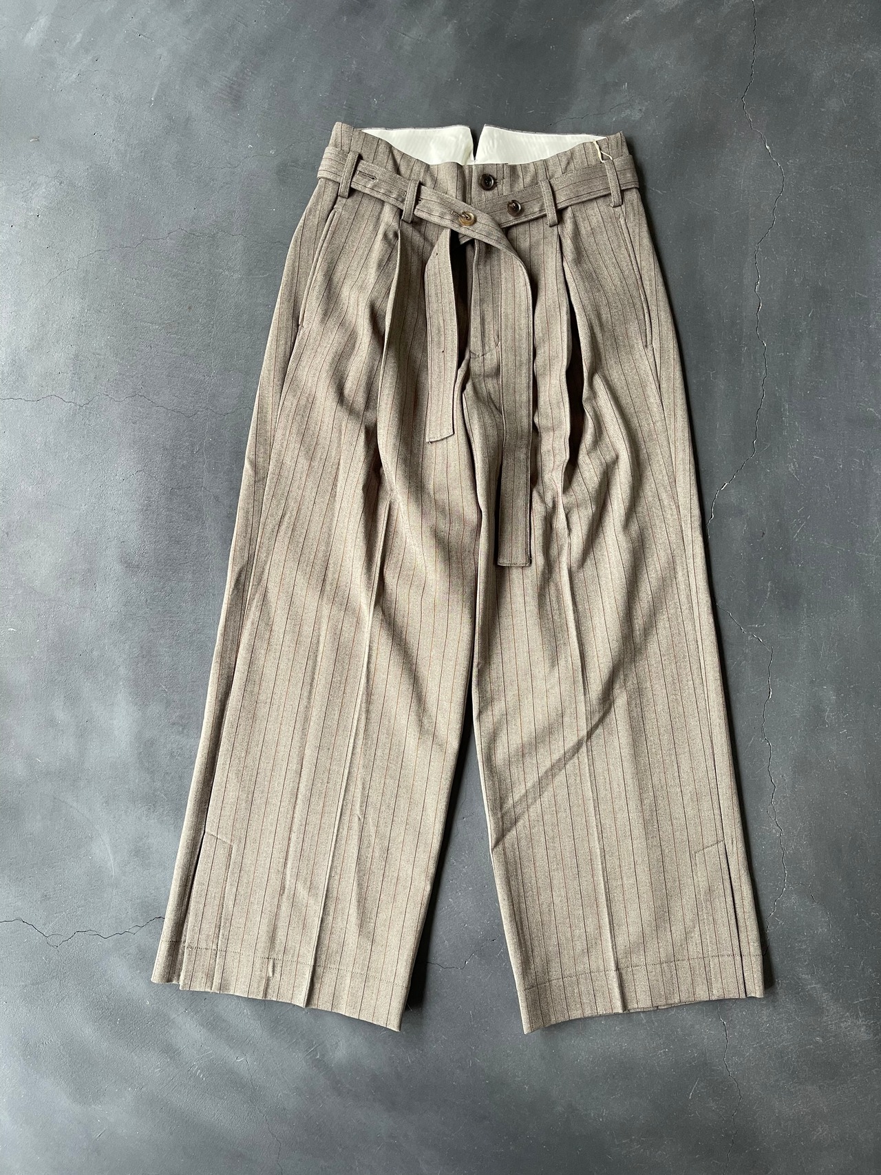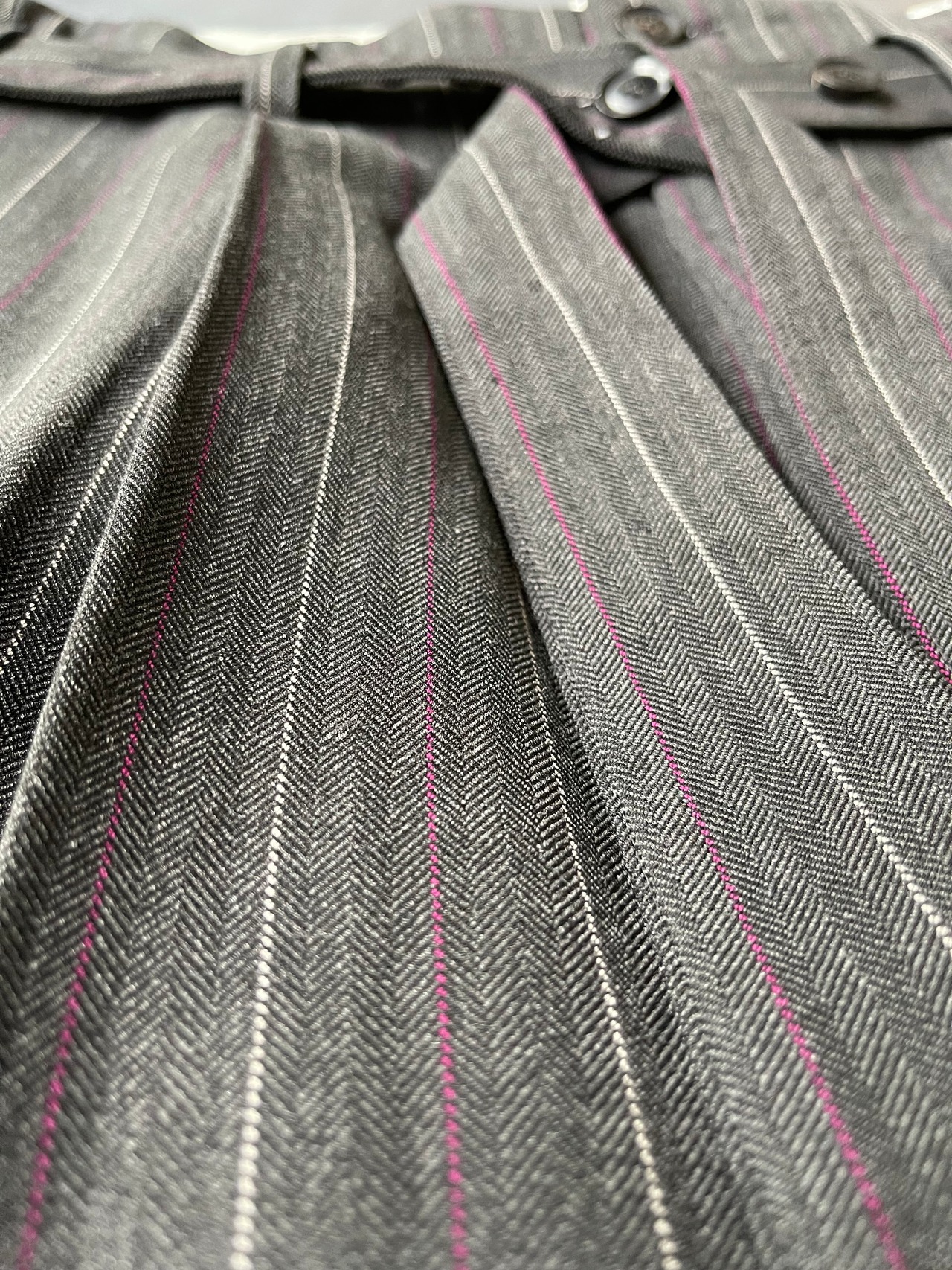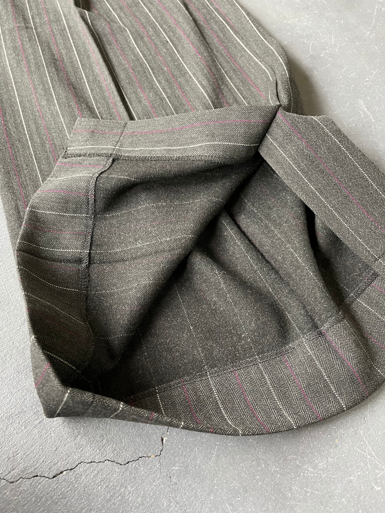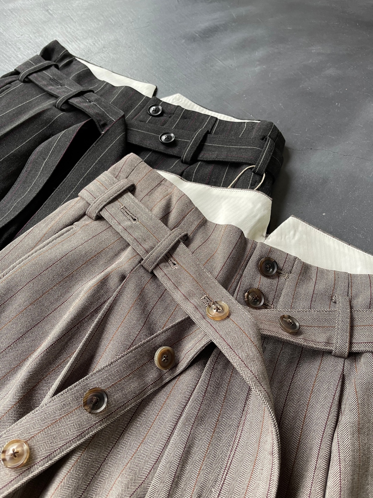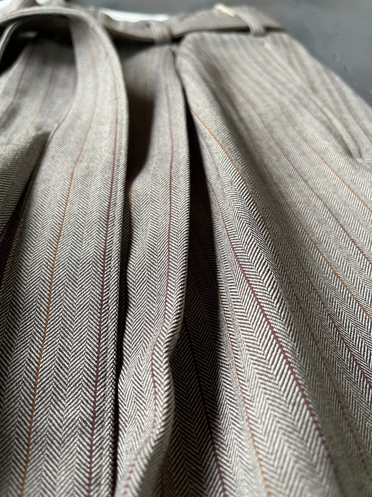 オールドスタイルのヘリンボーンストライプのバギーパンツ。
