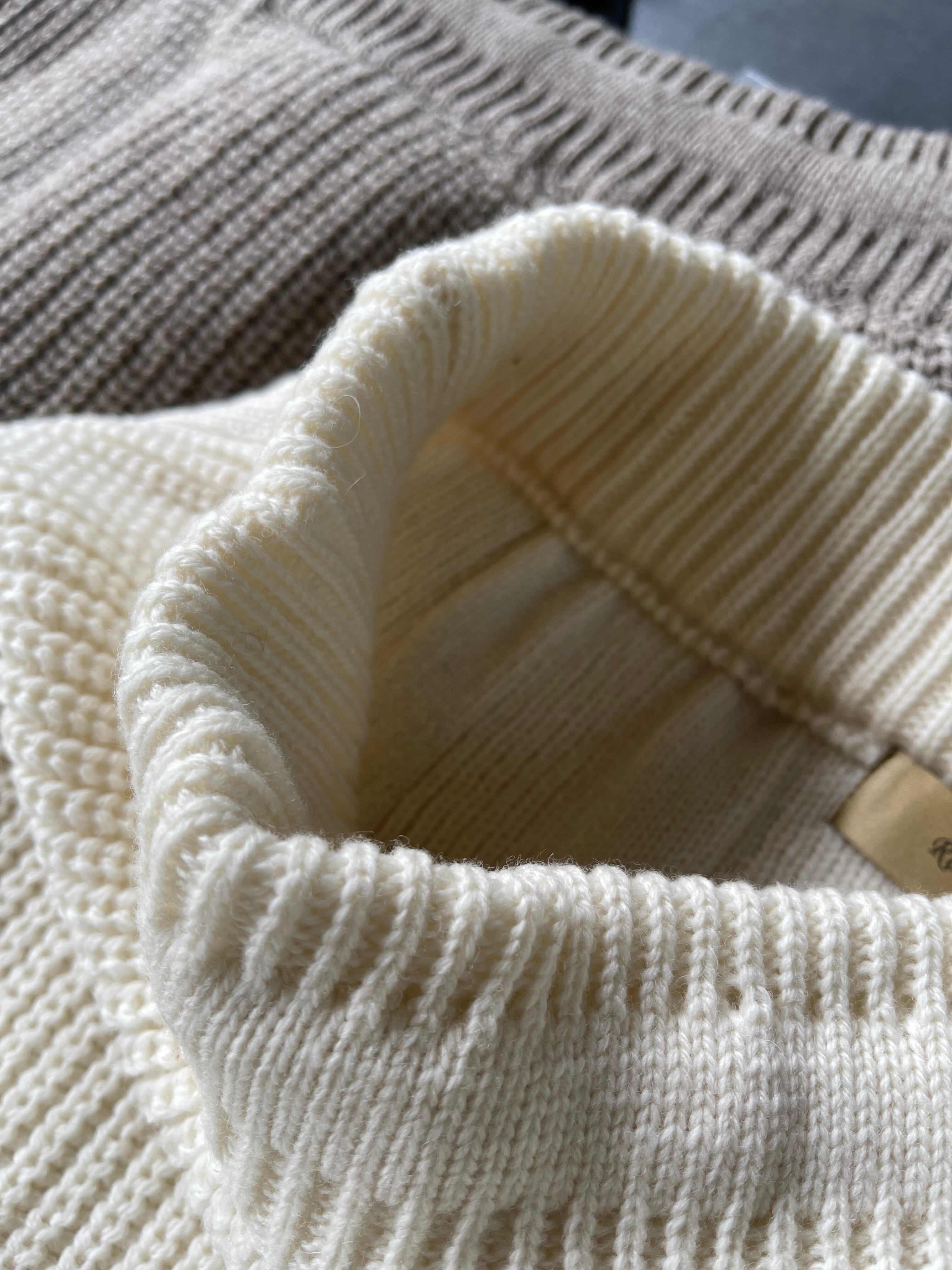 高い保温性、除湿性と天然の防臭性を持ち、ビリング性にも優れた丈夫な糸を3種の異なるリブ編地マルチミックスしてデザインされたニットシリーズです。