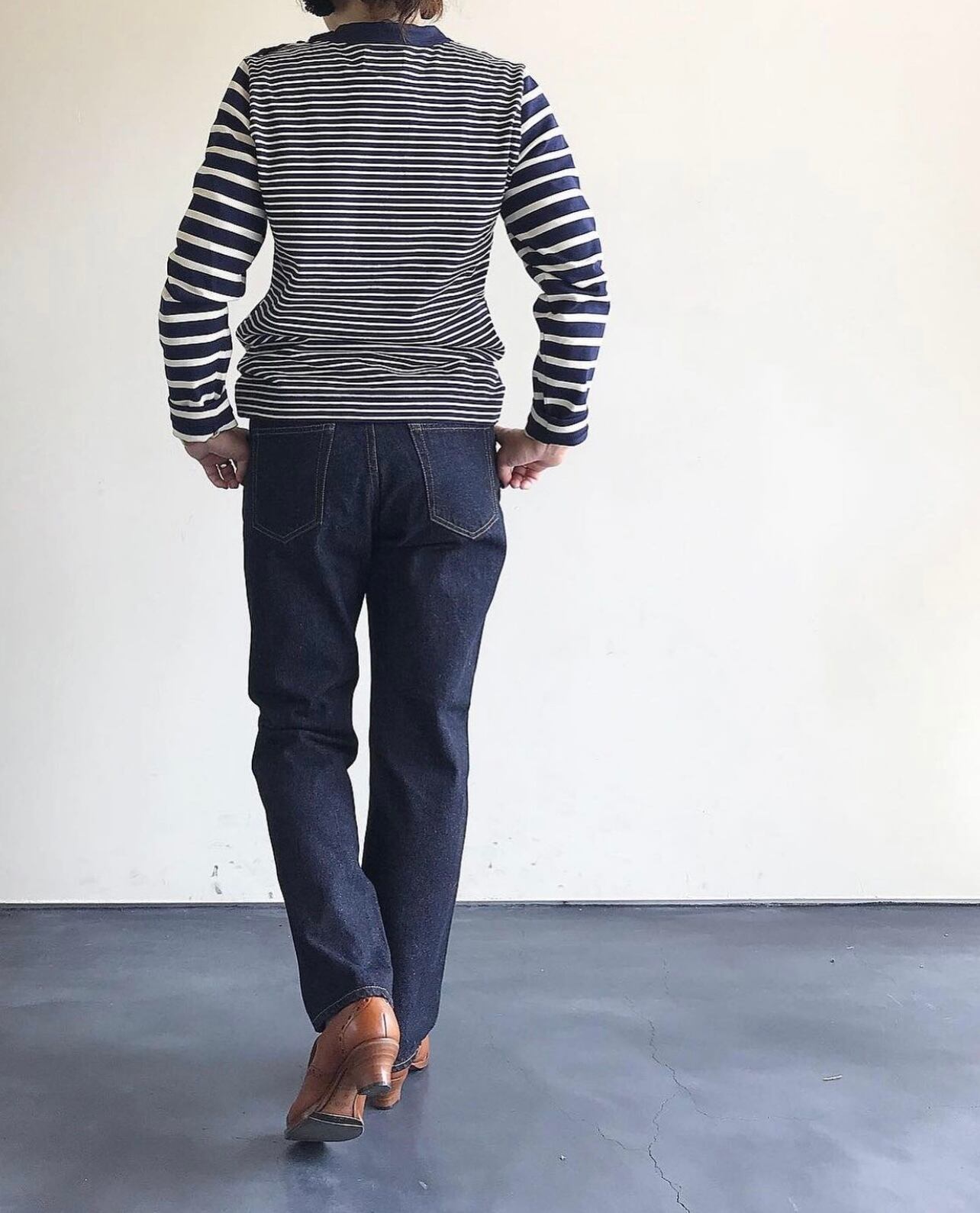前身頃と後ろ身頃で異なるピッチのボーダーを使用しています。