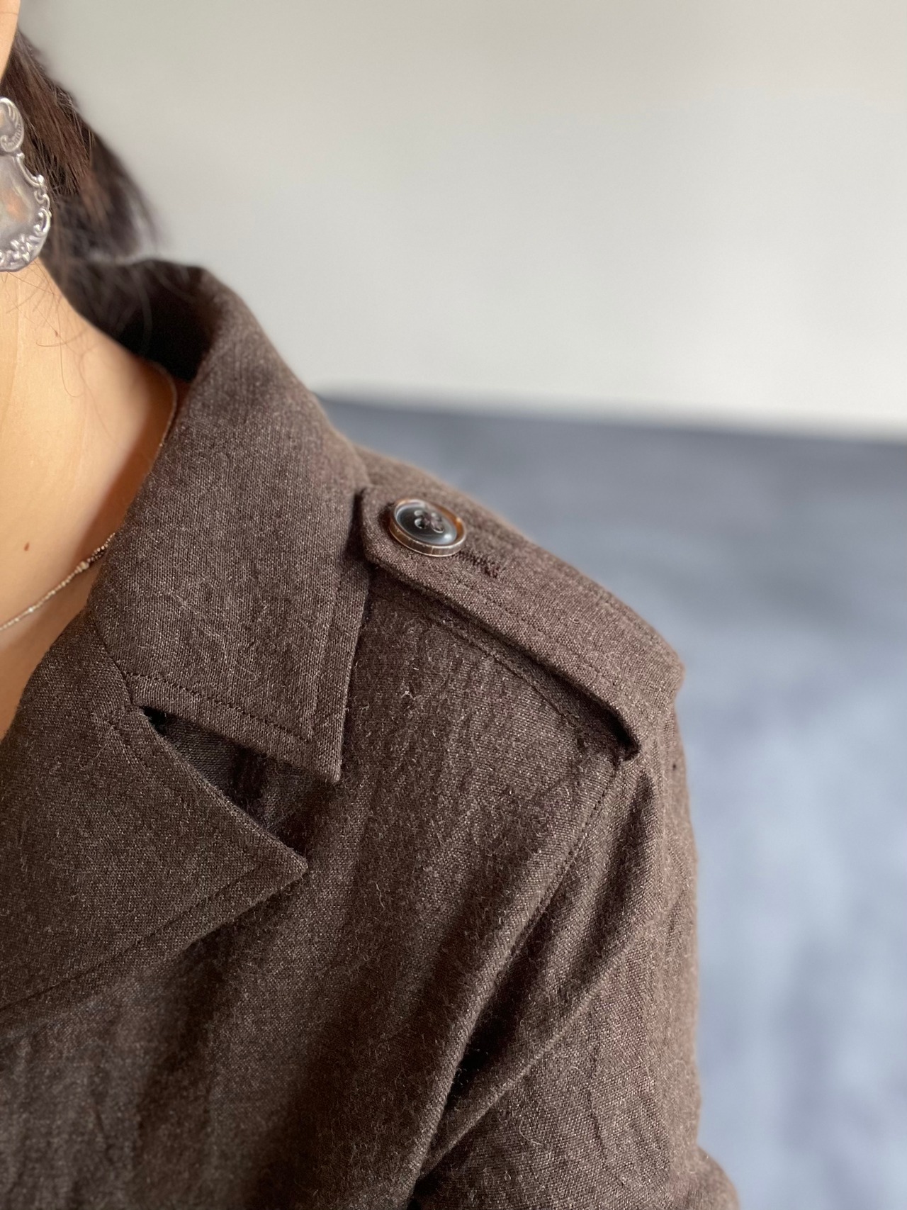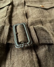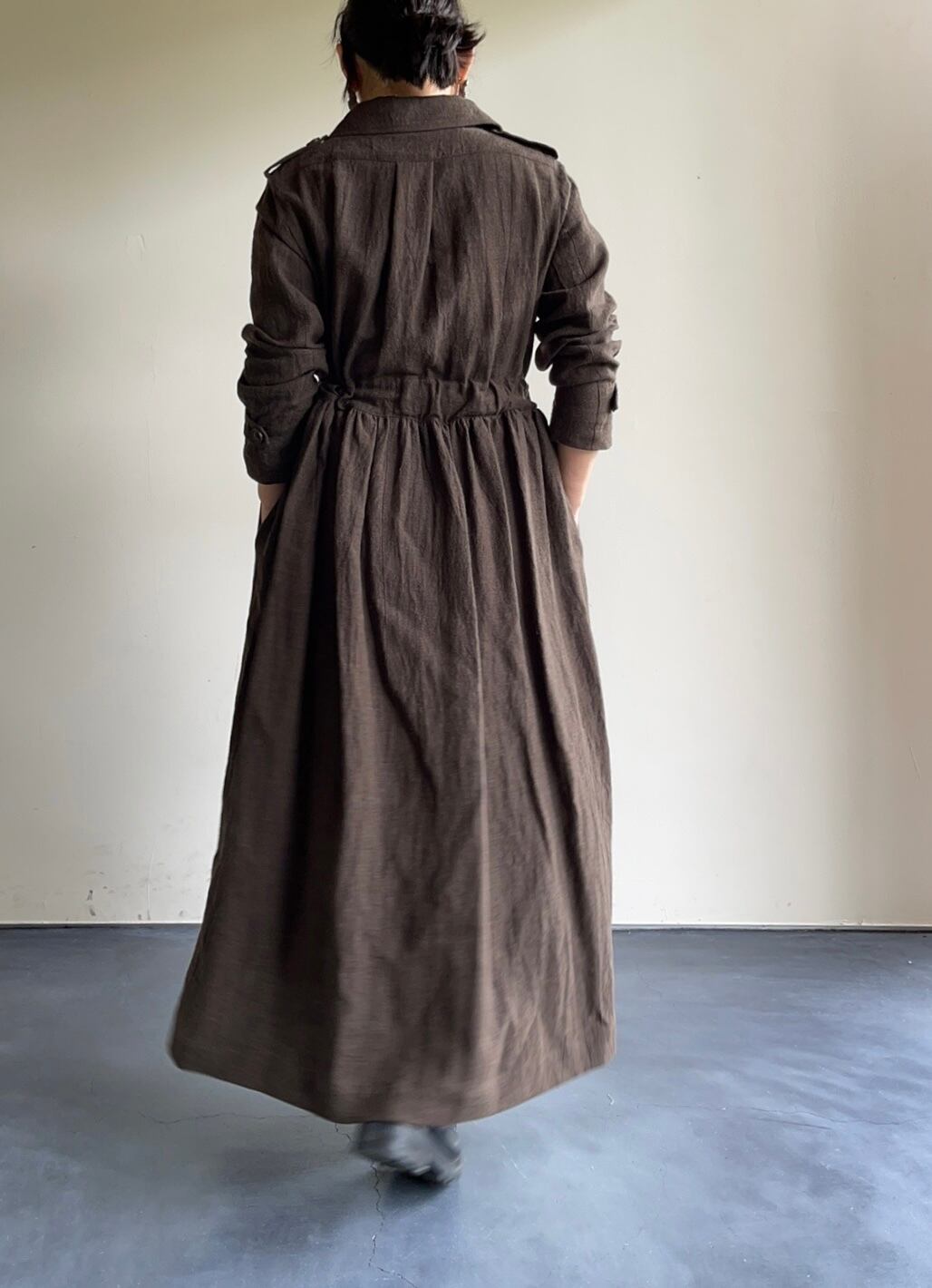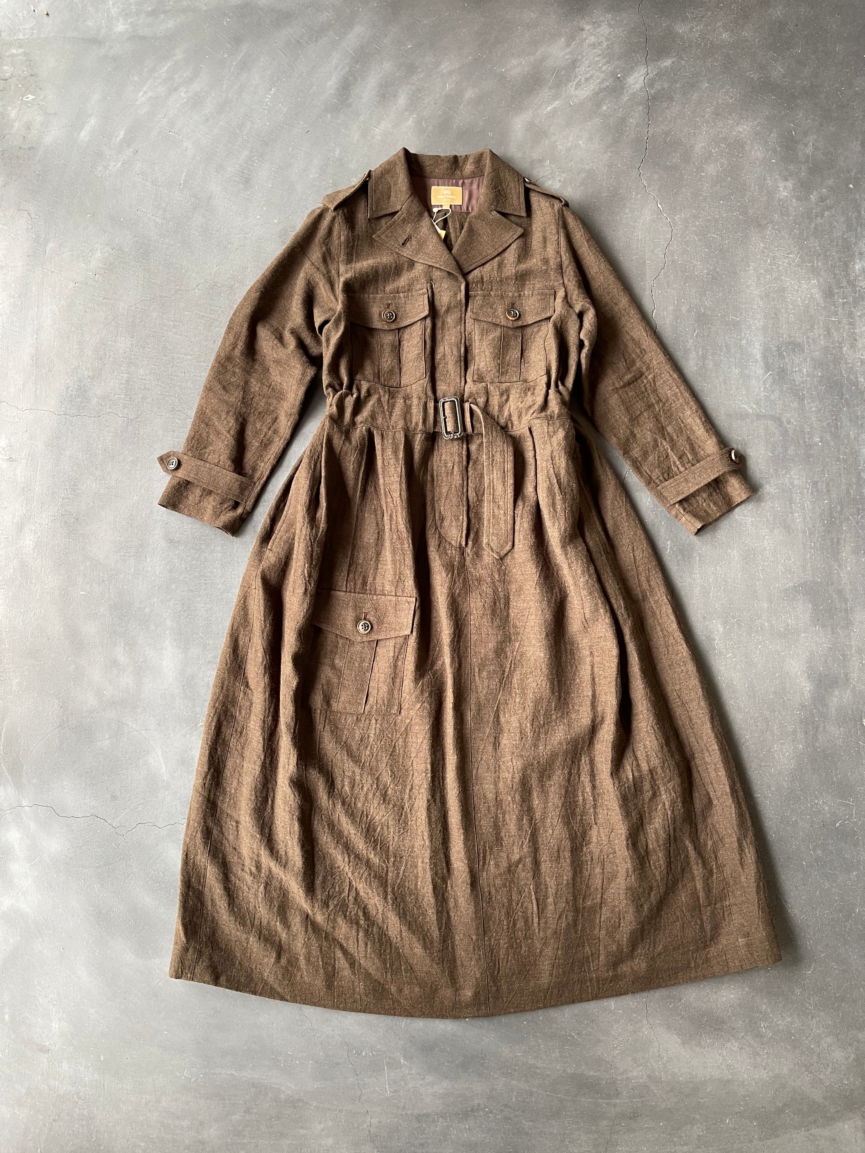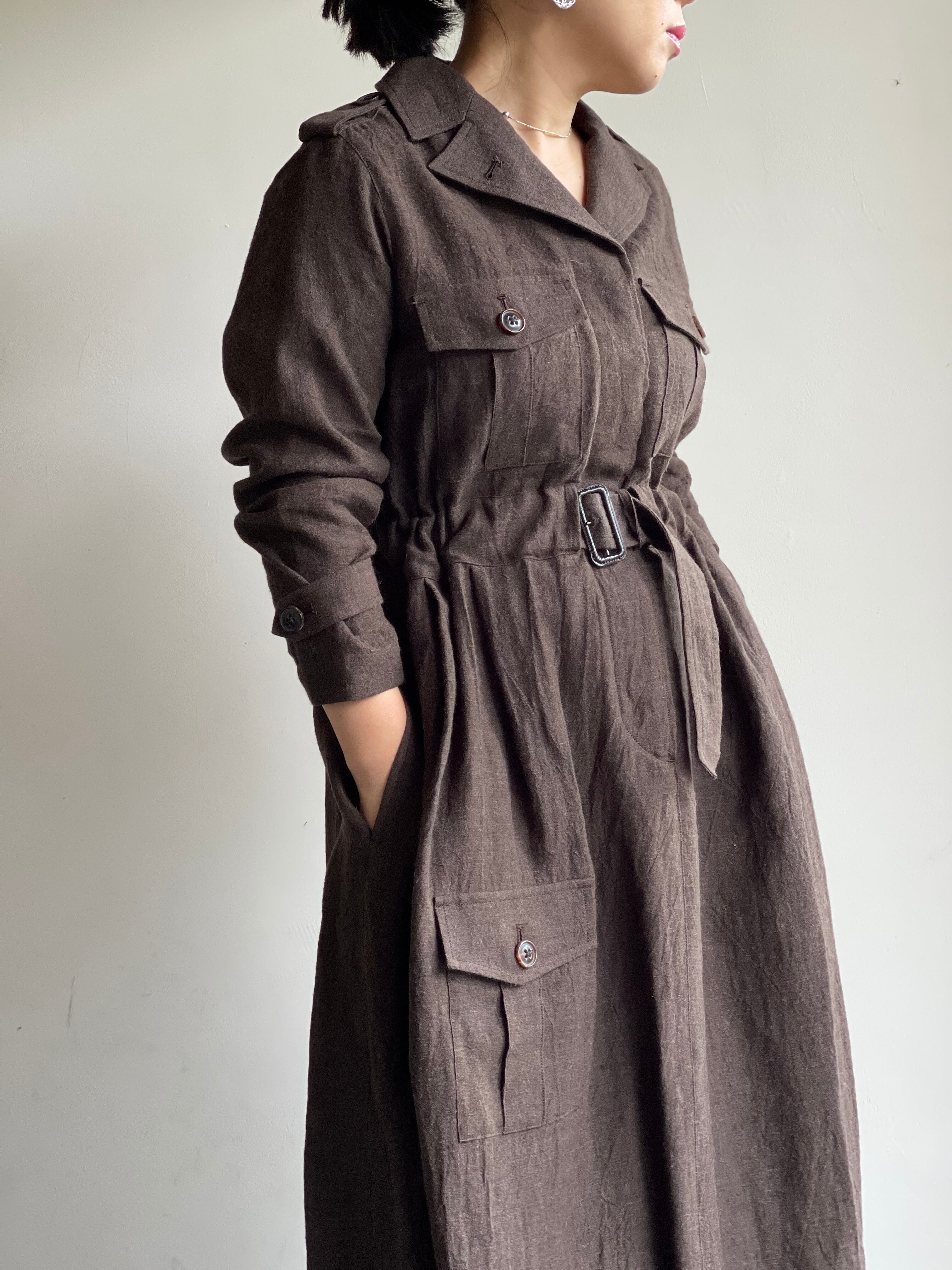 細く上質なリネンとウールを使い、リネンの風合いを生かすために時間をかけてゆっくりと仕上げた軽くやわらかな素材を使用しました。1930年代のイギリス軍のコットンフライトスーツをドレスにアレンジしました。コットンキュプラのペチコート付き。