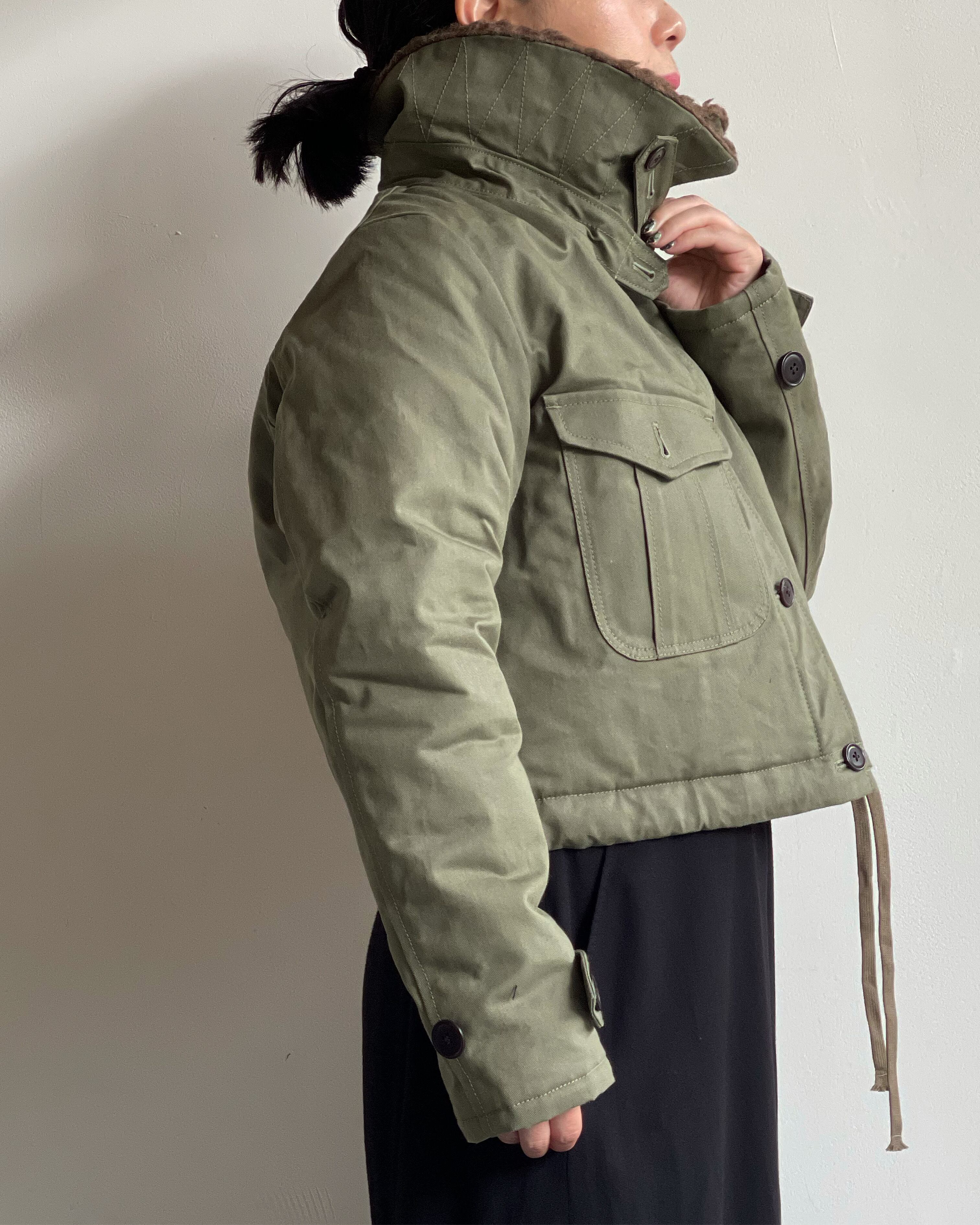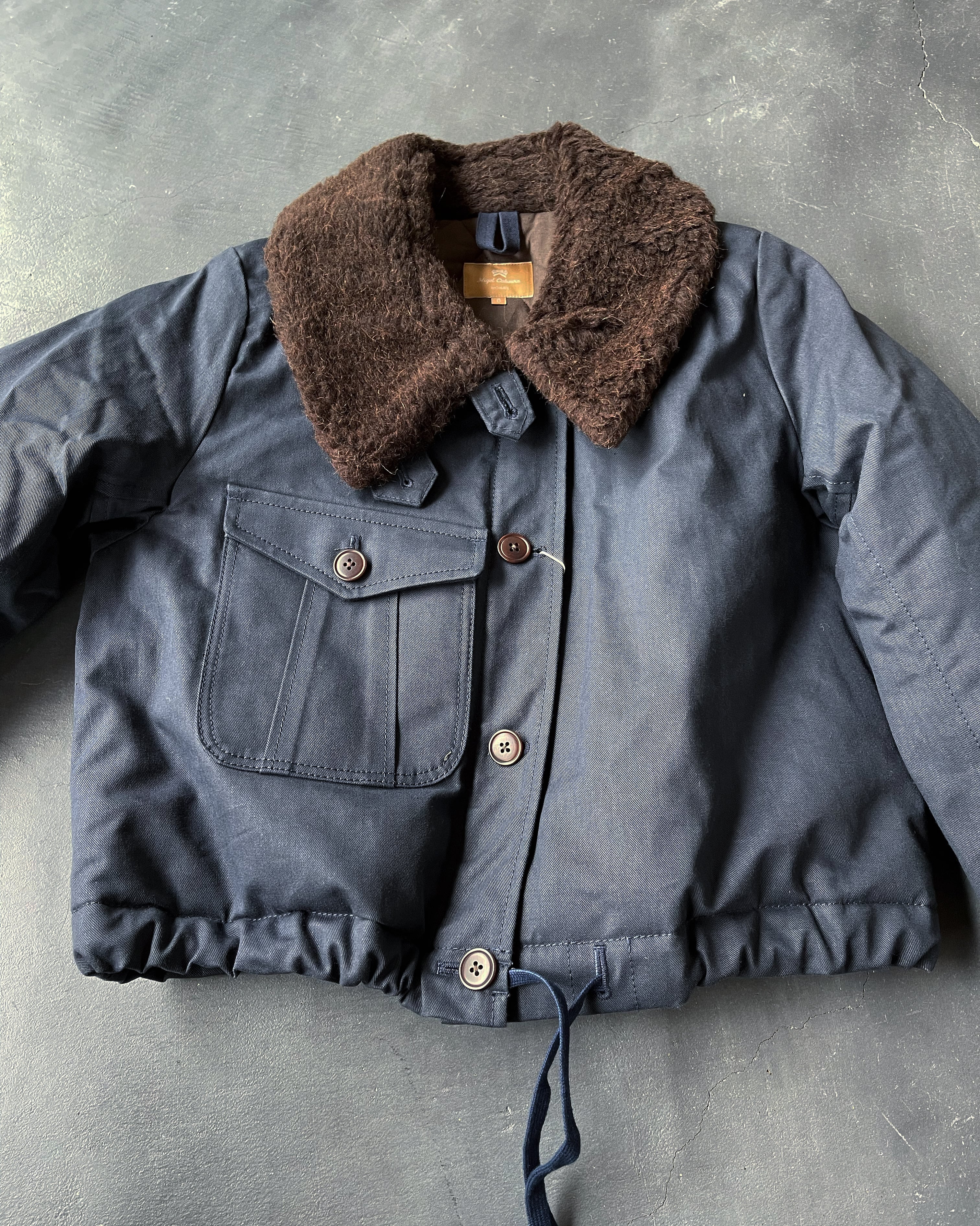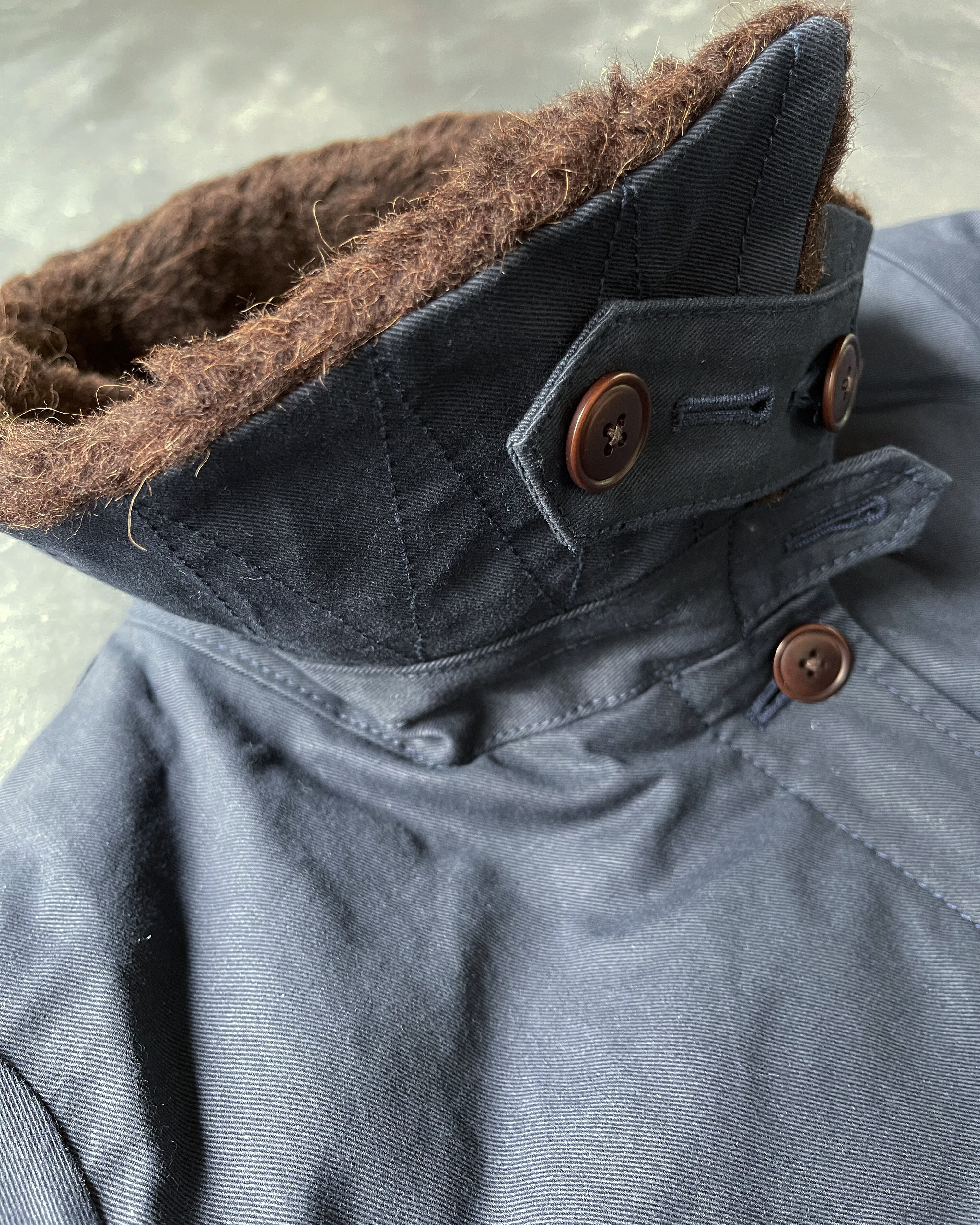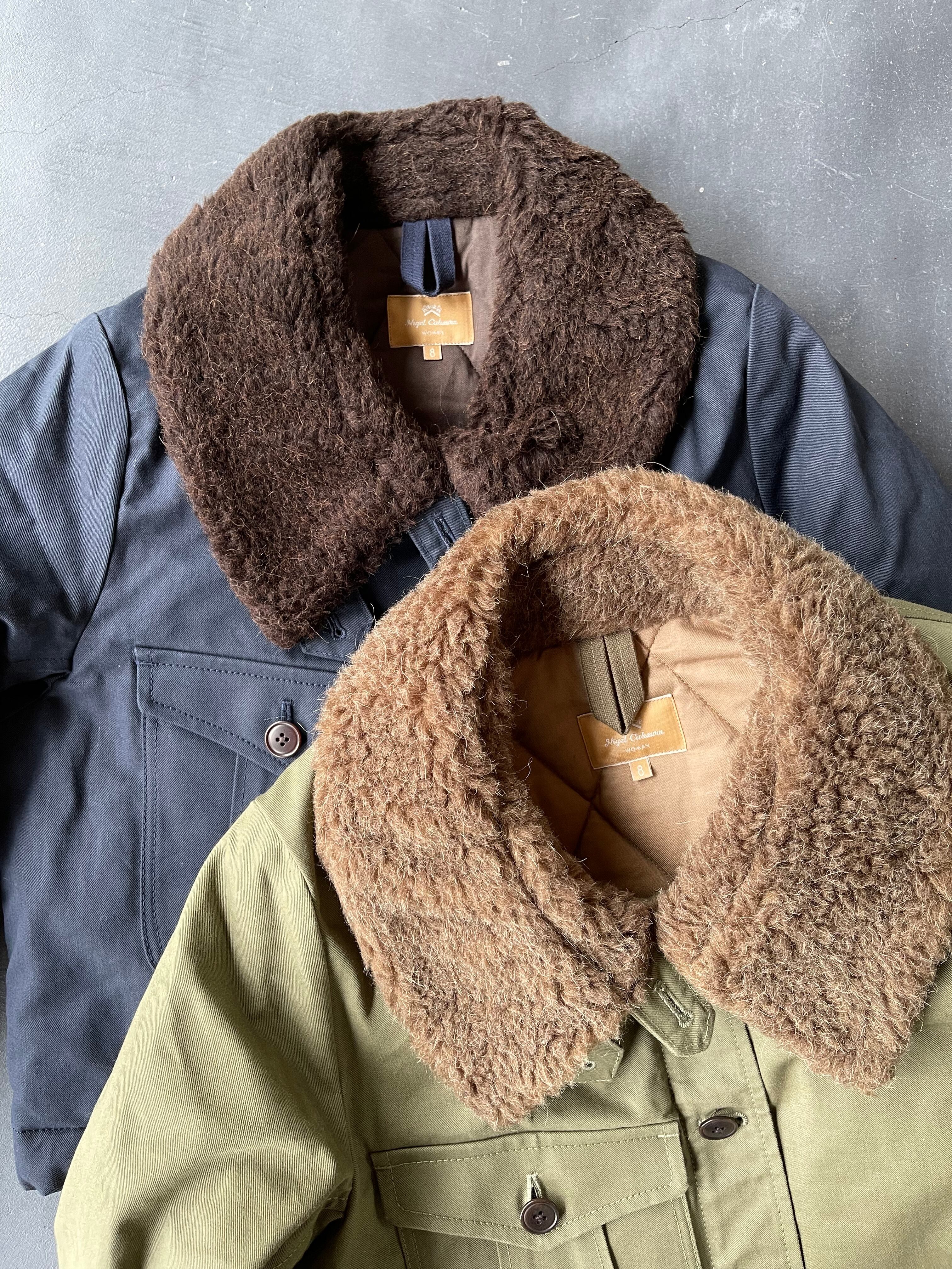 身頃には独特の風合いを生む、硫化染めのチノクロスを、襟部分にはアルパカウールのボアを使用しています。