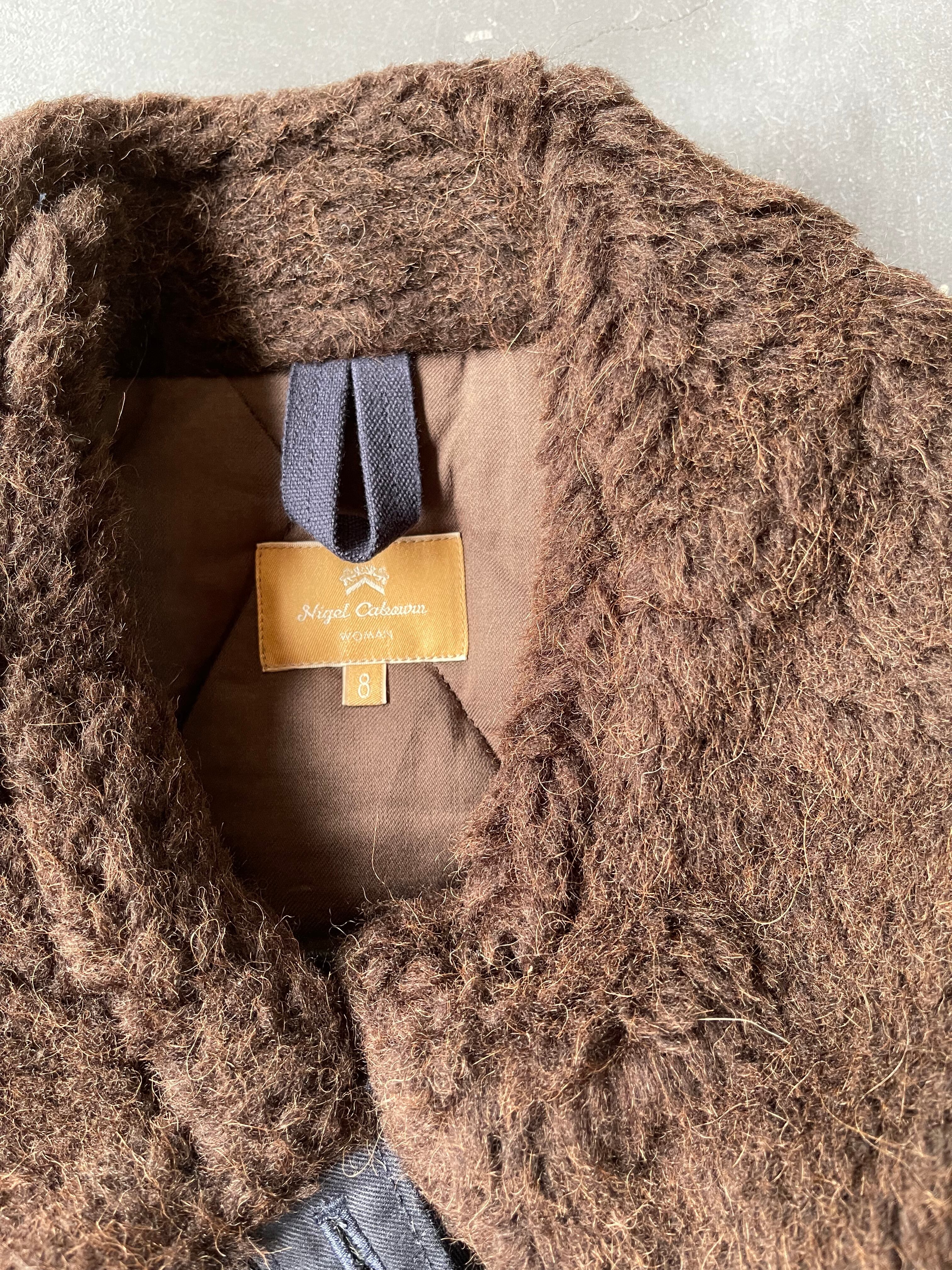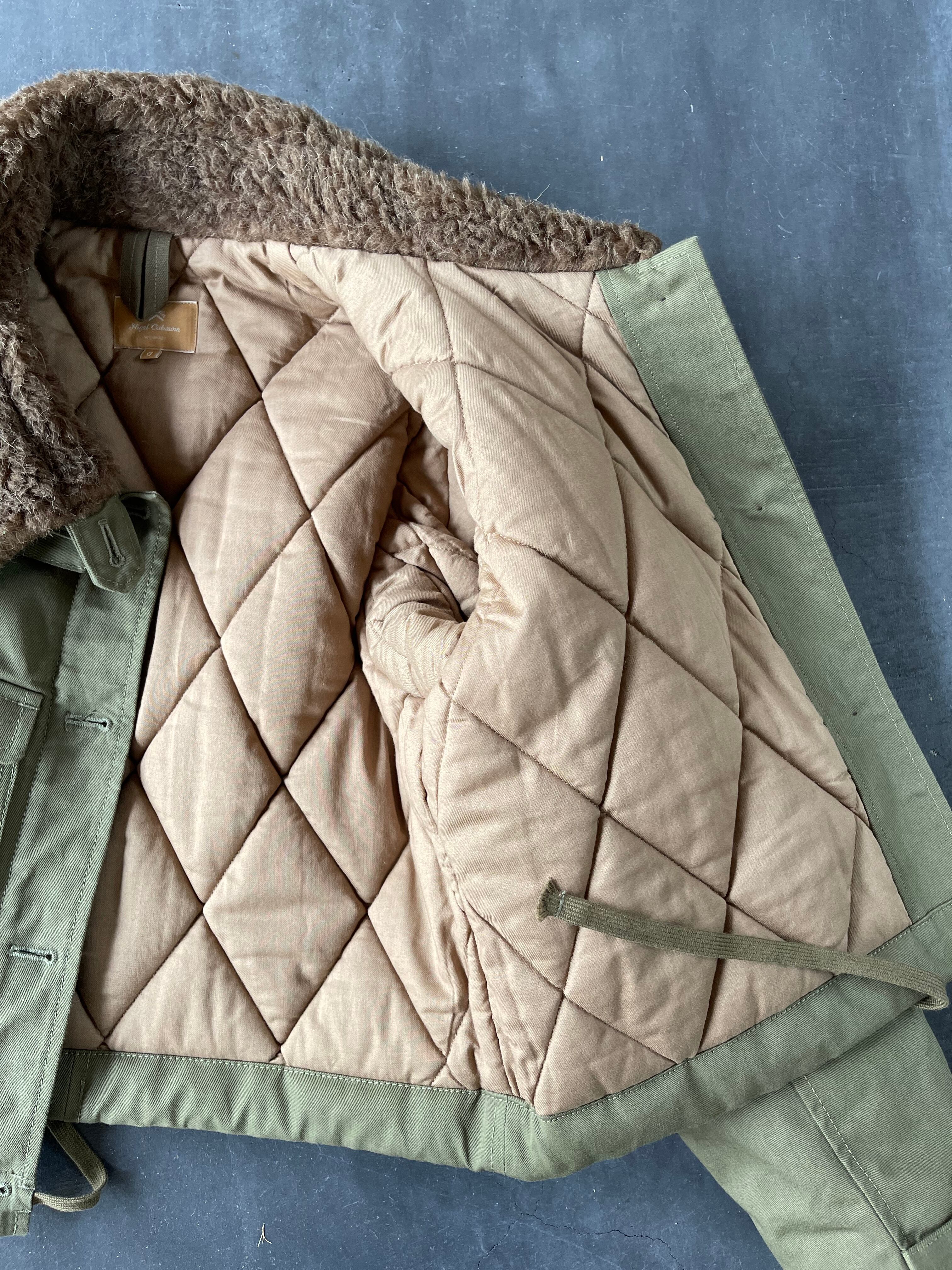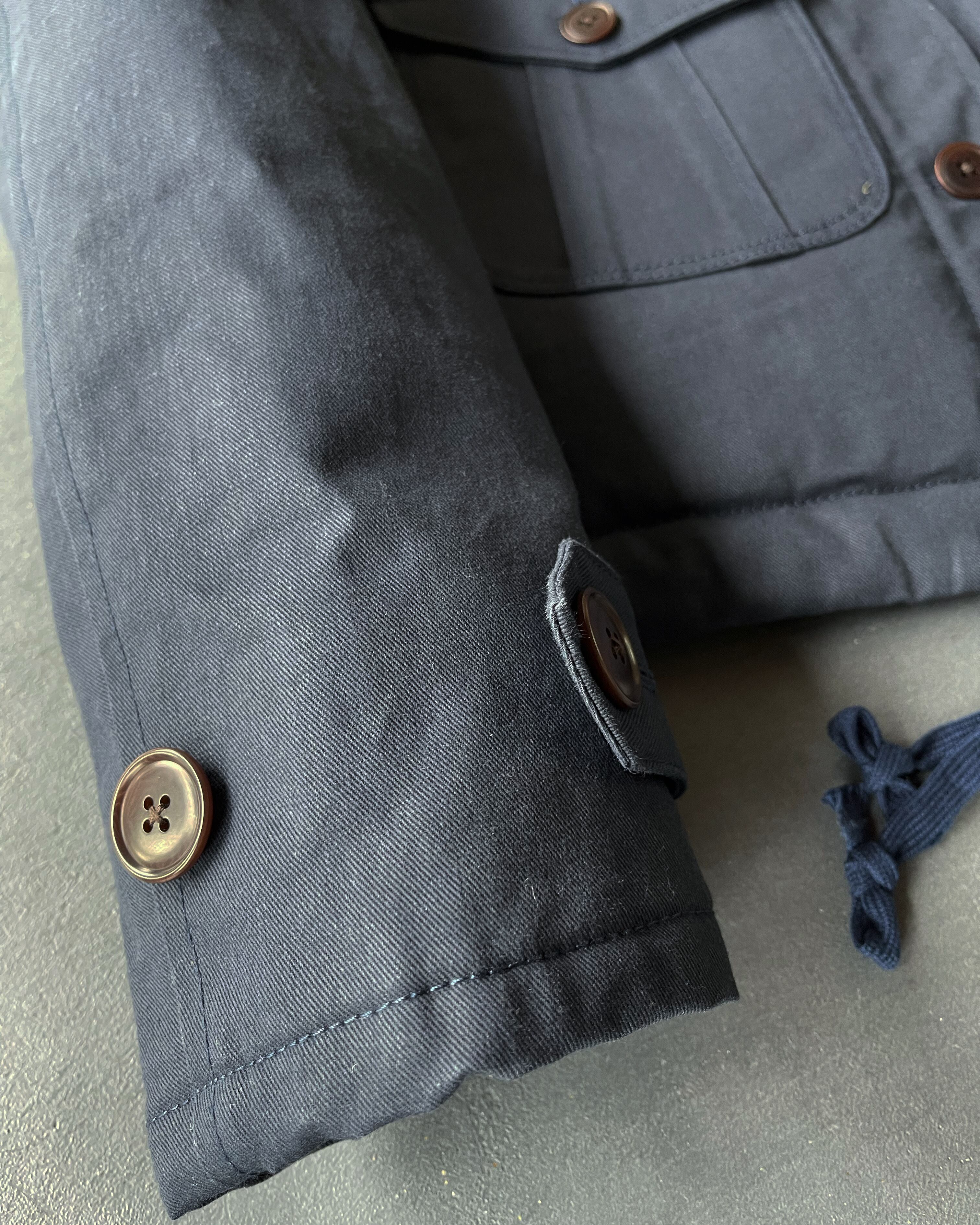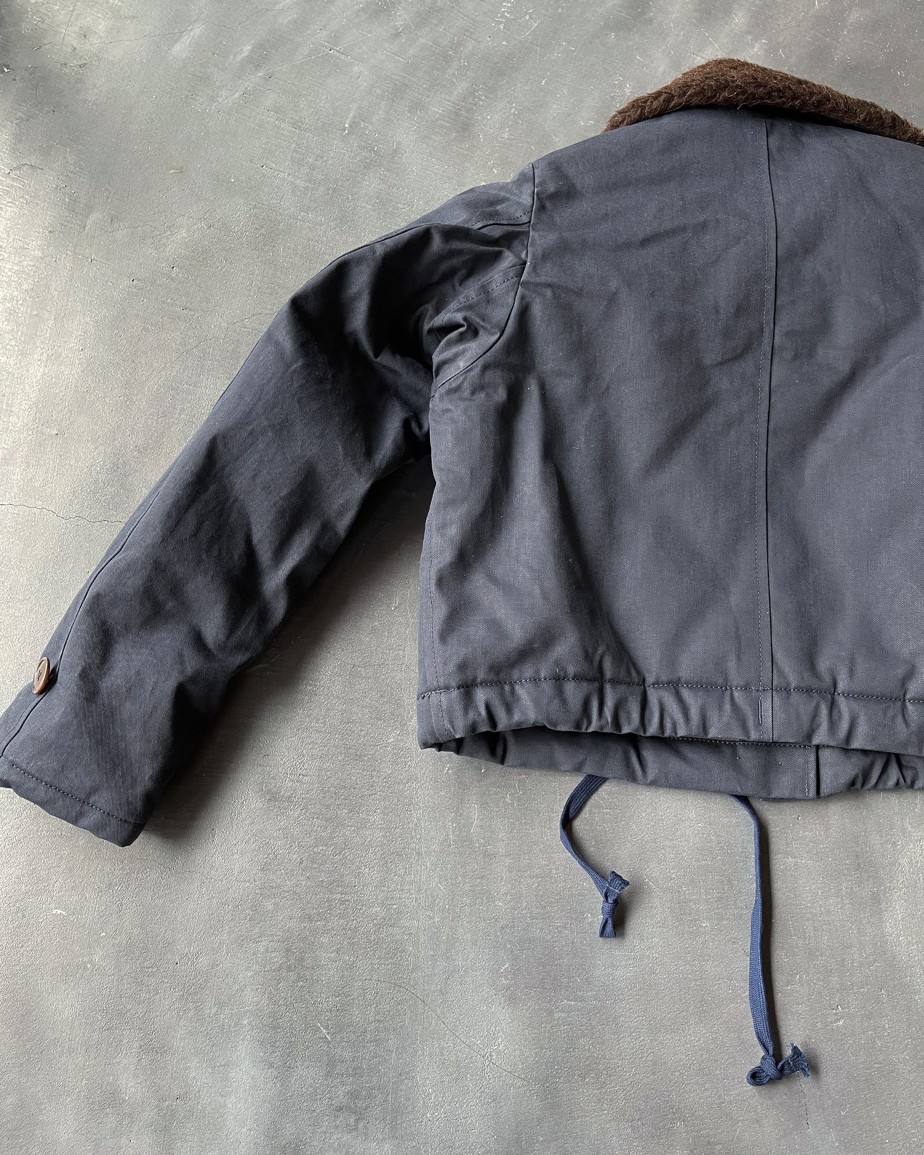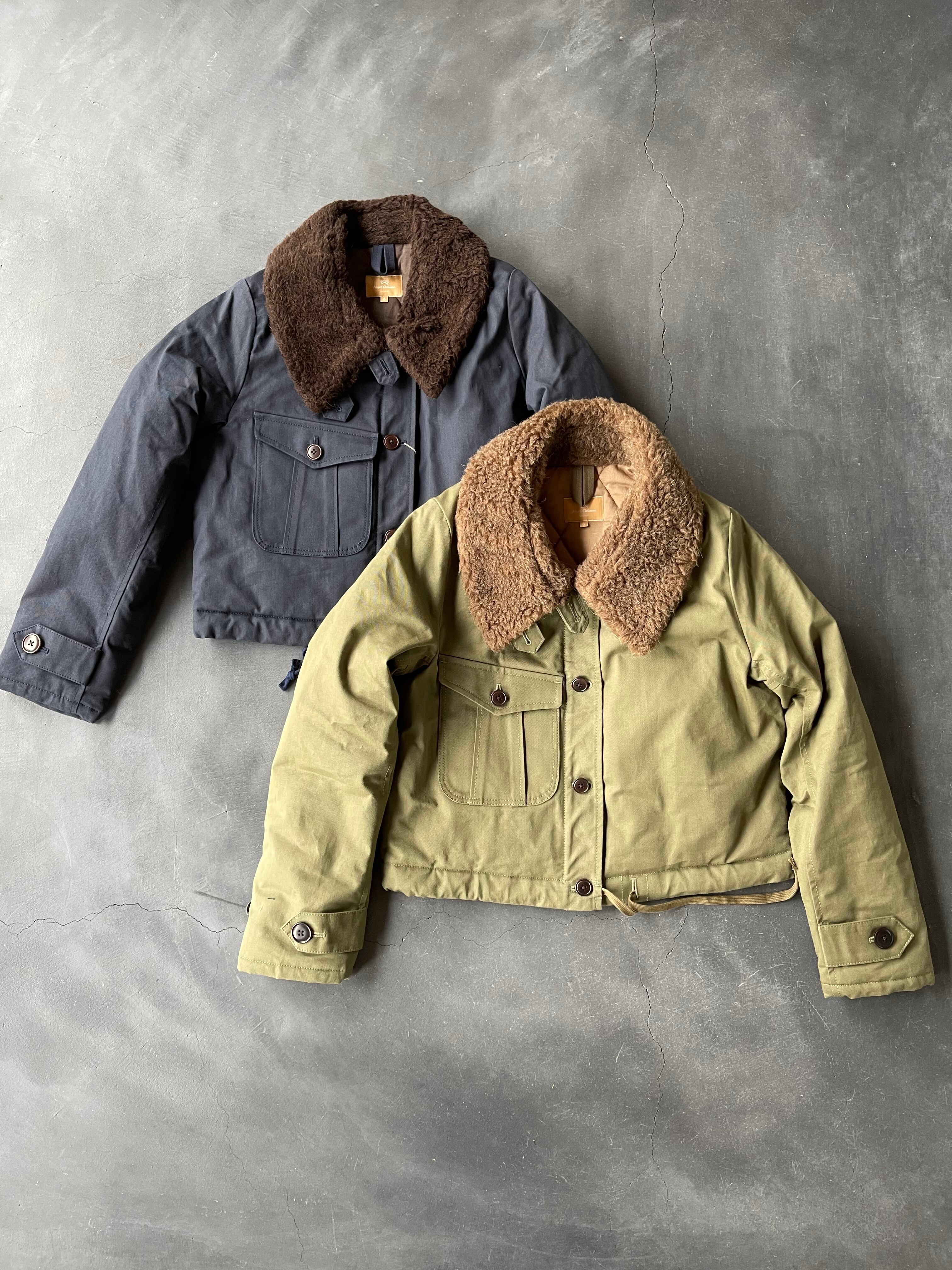 身頃には独特の風合いを生む、硫化染めのチノクロスを、襟部分にはアルパカウールのボアを使用しています。